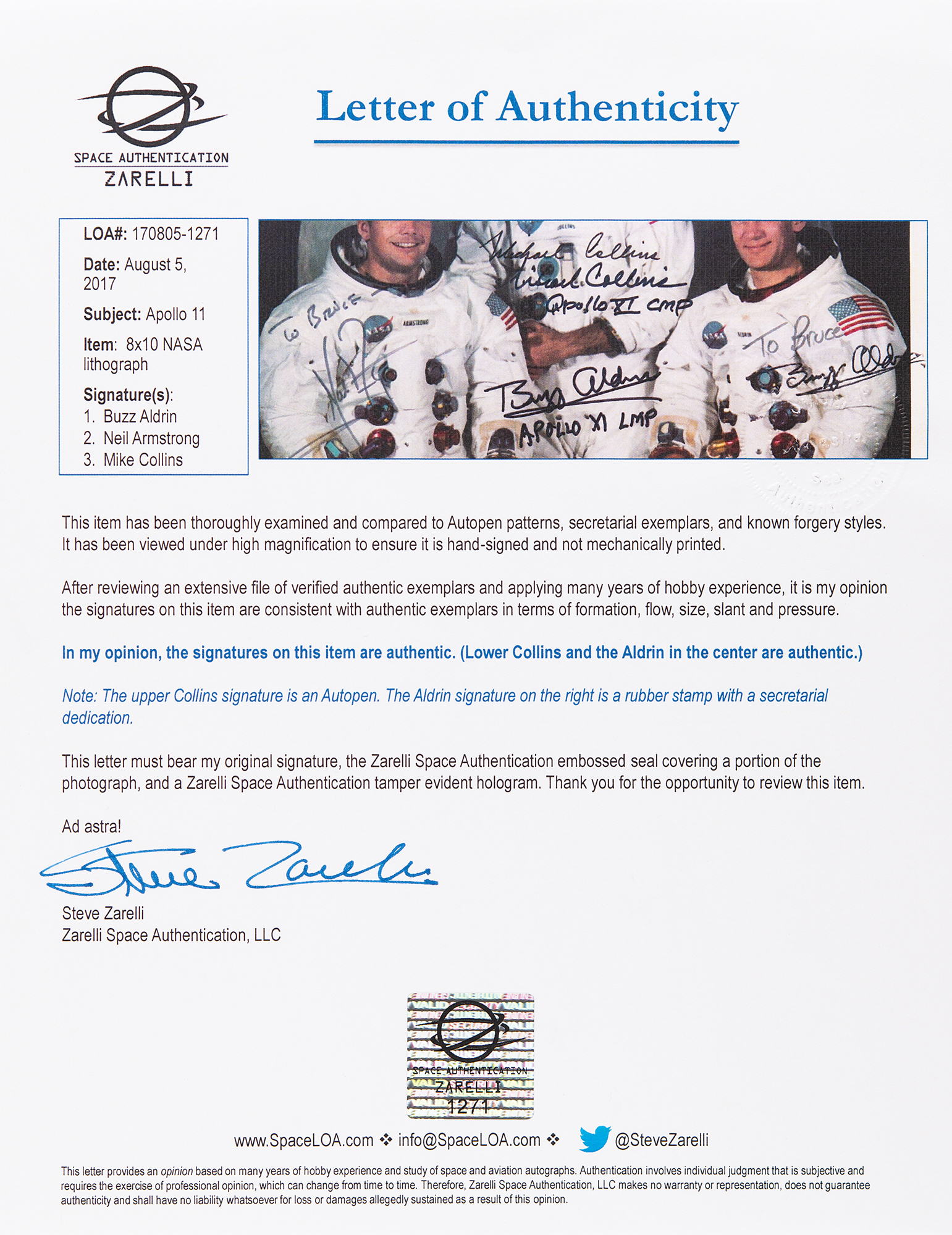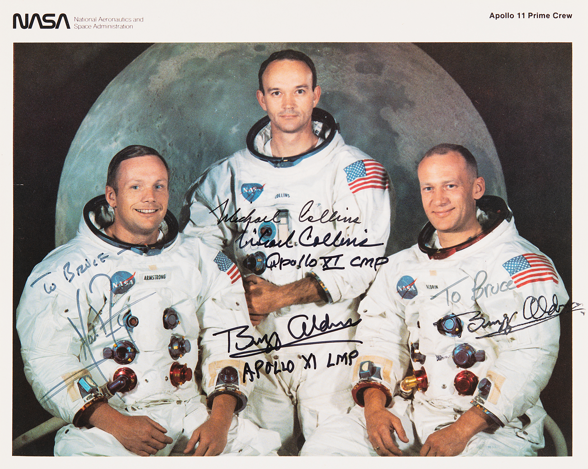 Official color 10 x 8 NASA lithograph of the Apollo 11 crew posing together in their white space suits in front of a lunar backdrop, signed and inscribed in black felt tip, "To Bruce – Neil Armstrong," "Michael Collins, Apollo XI CMP," and "Buzz Aldrin, Apollo XI LMP.” The upper Collins signature is autopen and the right-side Aldrin signature is stamped with a secretarial dedication. In fine condition, with a faint vertical bend passing through Armstrong's image. Accompanied by a full letter of authenticity from Zarelli Space Authentication.