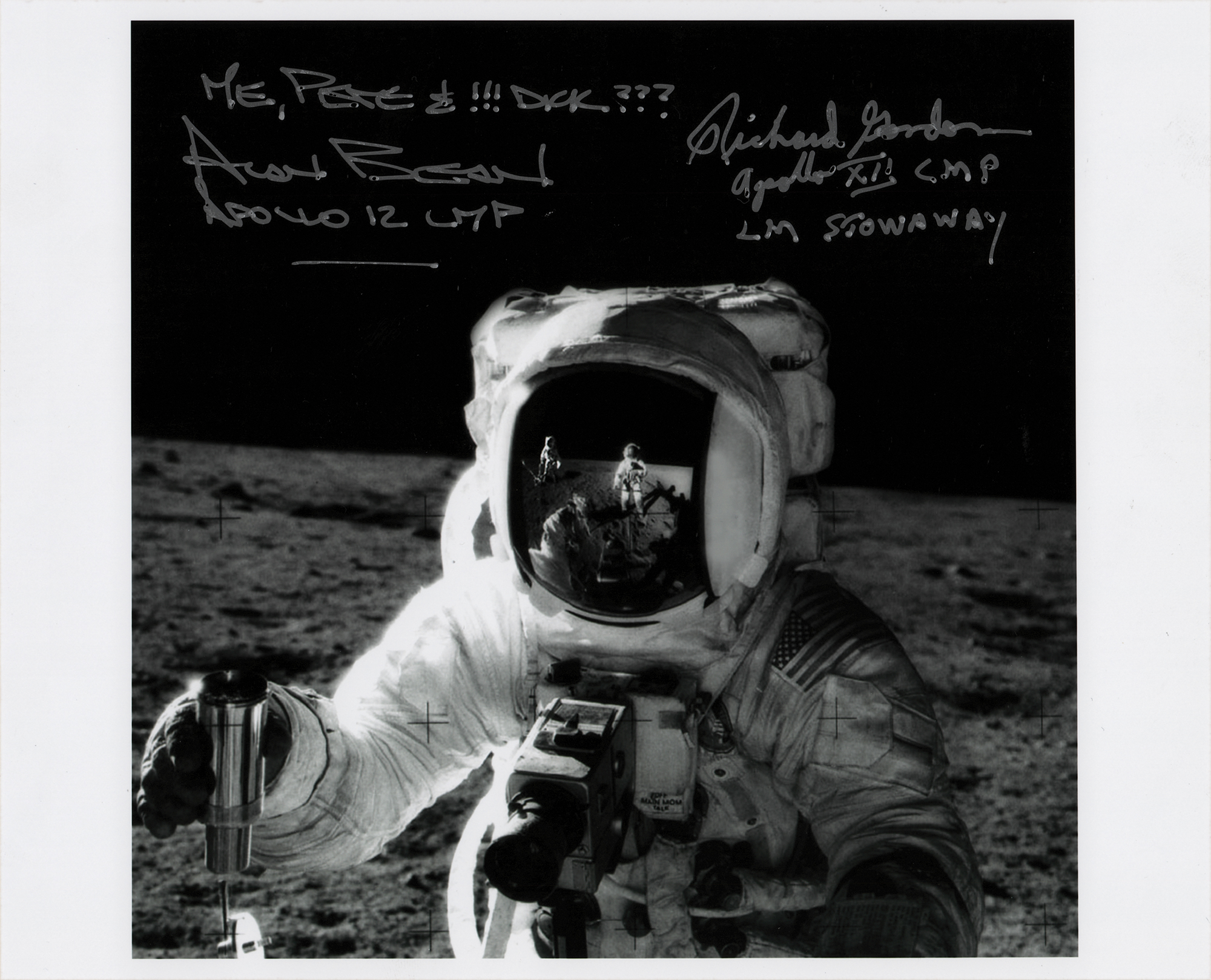 Fantastic glossy 10 x 8 digitally enhanced photo of Alan Bean on the lunar surface with an unlikely two astronauts reflected in his visor, playfully signed in silver ink, "Me, Pete & !!! Dick??? Alan Bean, Apollo 12 LMP" and "Richard Gordon, Apollo XII CMP, LM Stowaway." In very fine condition. Accompanied by a photo of Bean signing the photo on August 13, 2005.