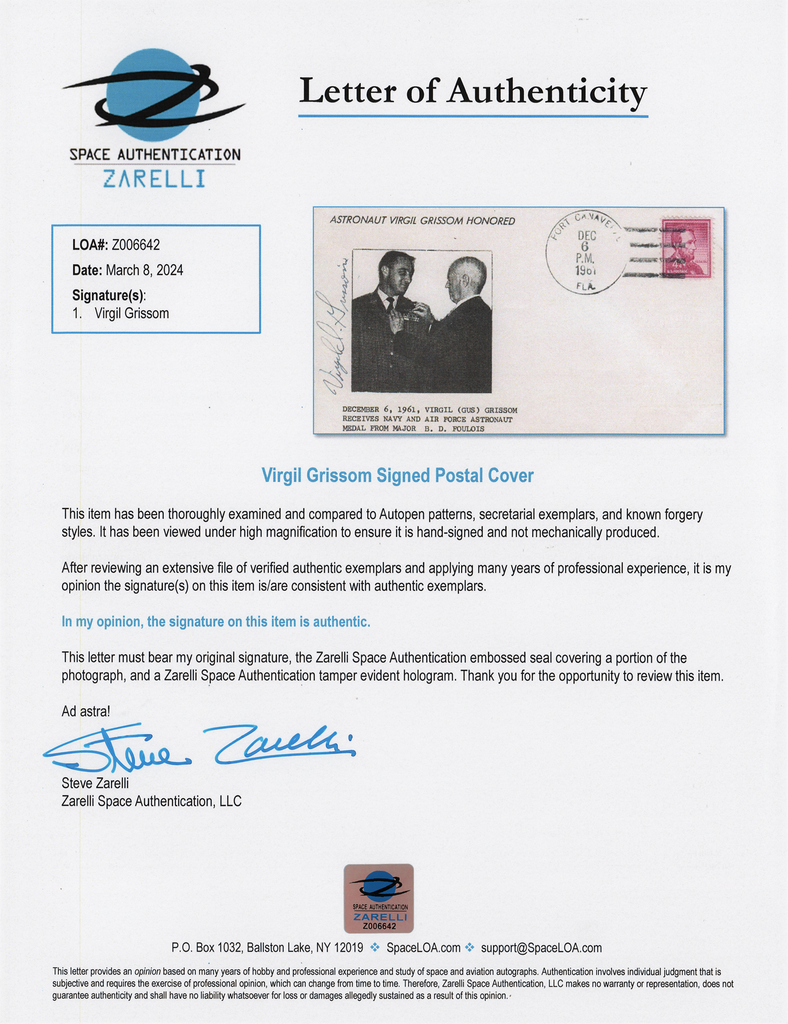 Desirable commemorative cover with a pictorial cachet of Gus Grissom receiving the Navy and Air Force Astronaut Medal from Major B. D. Foulois, postmarked at Port Canaveral on December 6, 1961, the date of Grissom’s award ceremony, signed vertically in black ink, “Virgil I. Grissom.” In very fine condition. Accompanied by a full letter of authenticity from Zarelli Space Authentication.