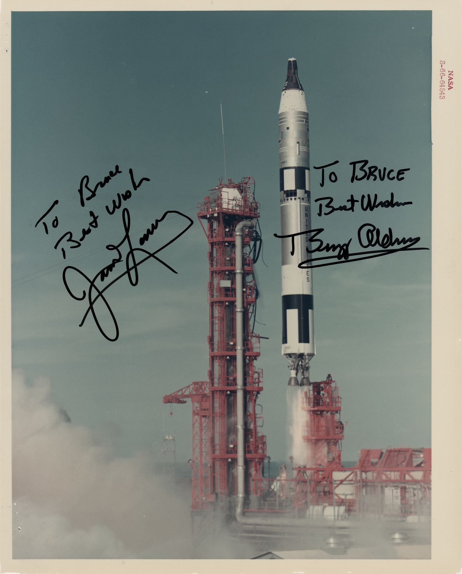 Uncommon official color glossy 8 x 10 red-numbered NASA photo (S-66-64543) of the Gemini 12 liftoff, nicely signed and inscribed in black felt tip, "To Bruce, Best wishes, Buzz Aldrin" and "To Bruce, Best wishes, James Lovell.” Reverse bears purple NASA caption text and “A Kodak Paper” watermarks. In fine condition, with staple holes to the left edge. Accompanied by a photo of the recipient with Buzz Aldrin, taken at the time of signing on August 13, 2005.