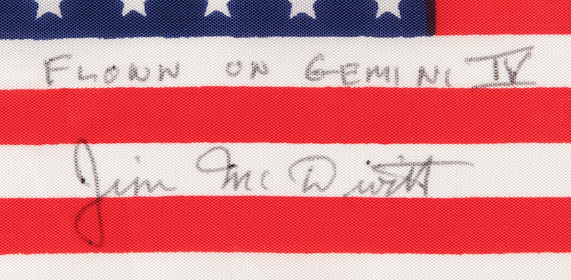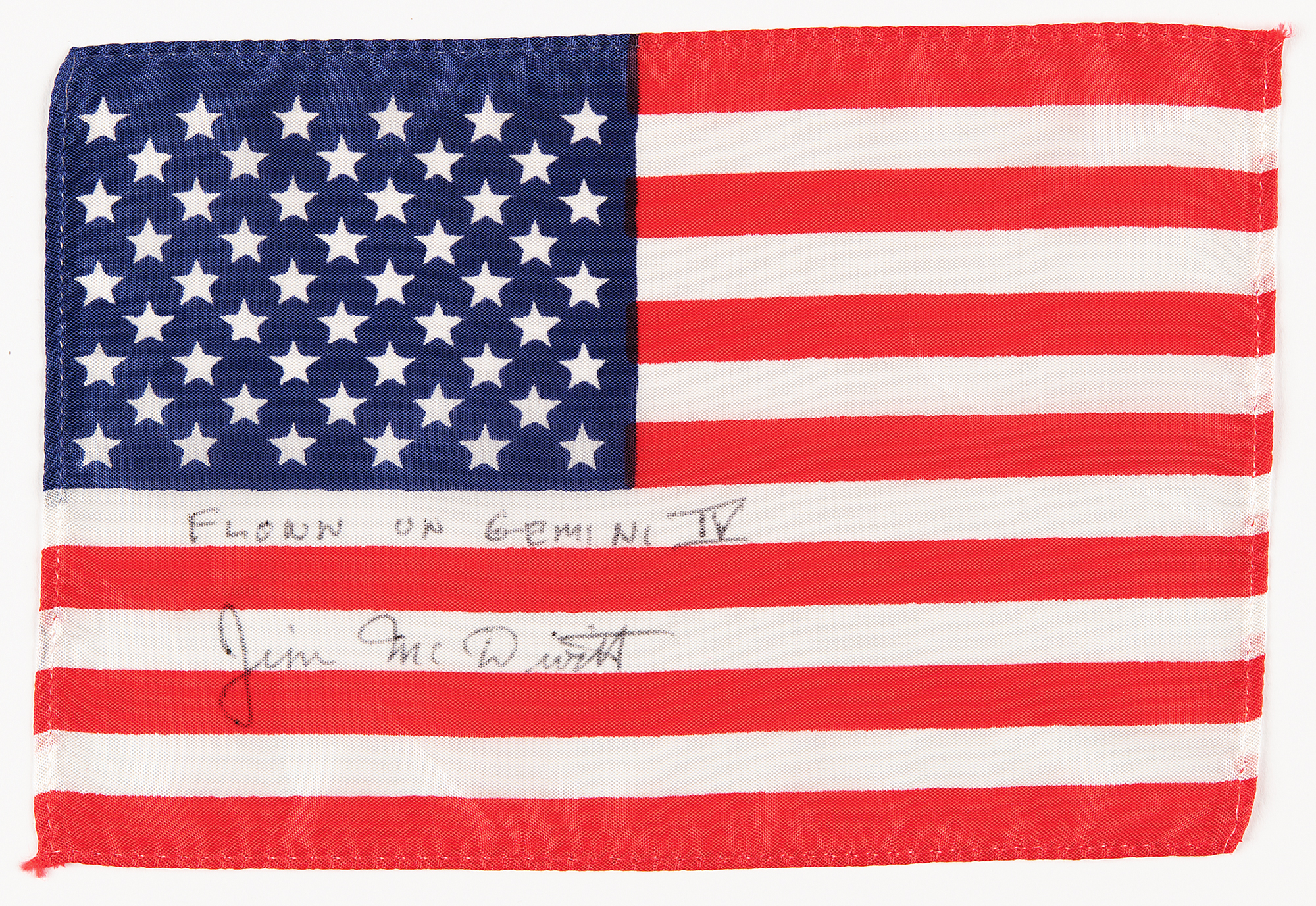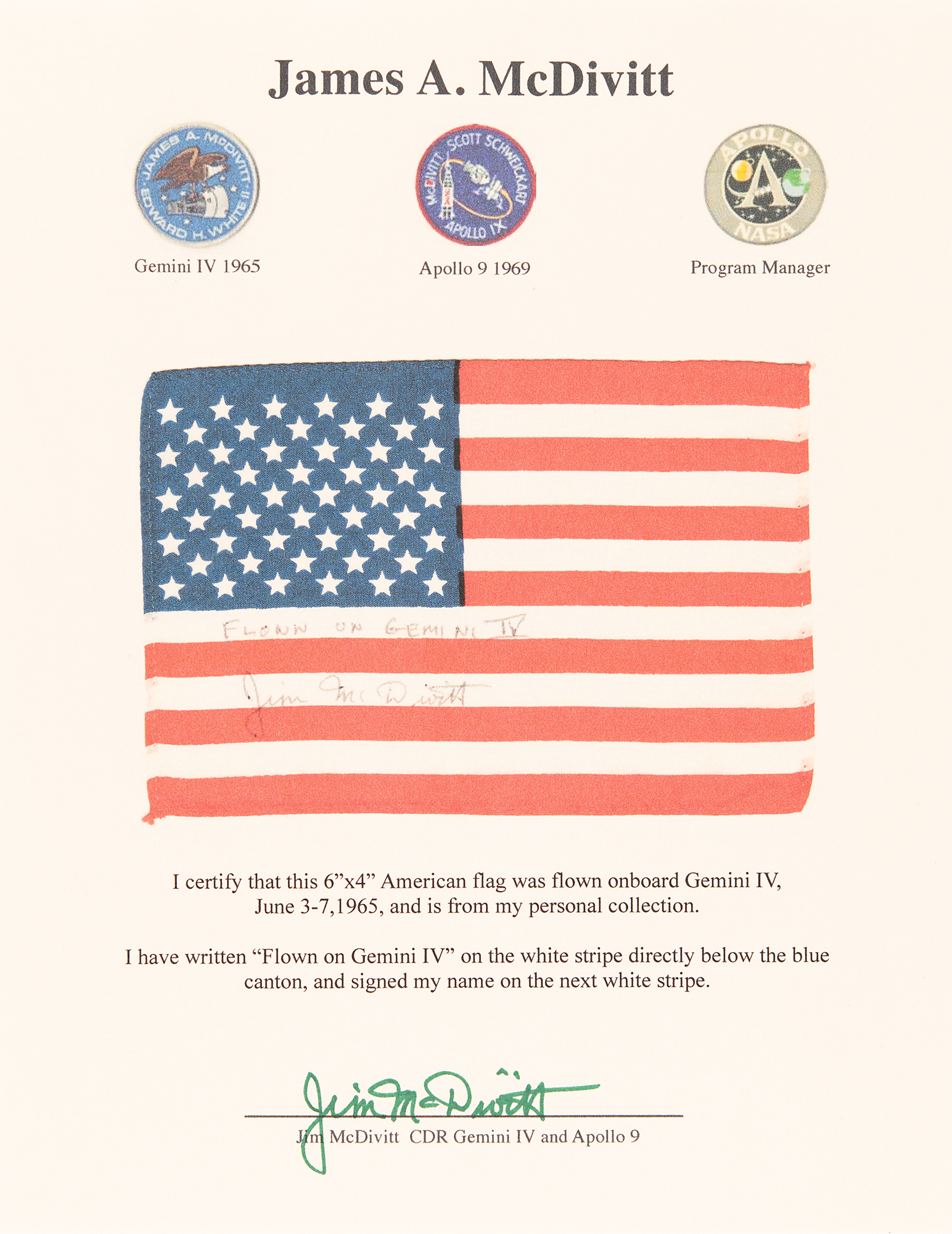 Uncommon flown fabric flag of the United States, 6 x 4, carried into space aboard the Gemini 4 capsule for a period lasting from June 3-7, 1965, signed and flight-certified in black ballpoint, "Flown on Gemini IV, Jim McDivitt." In very fine condition. Accompanied by a certificate of authenticity signed by McDivitt, certifying that the flag "was flown onboard Gemini IV, June 3–7, 1965, and is from my personal collection."