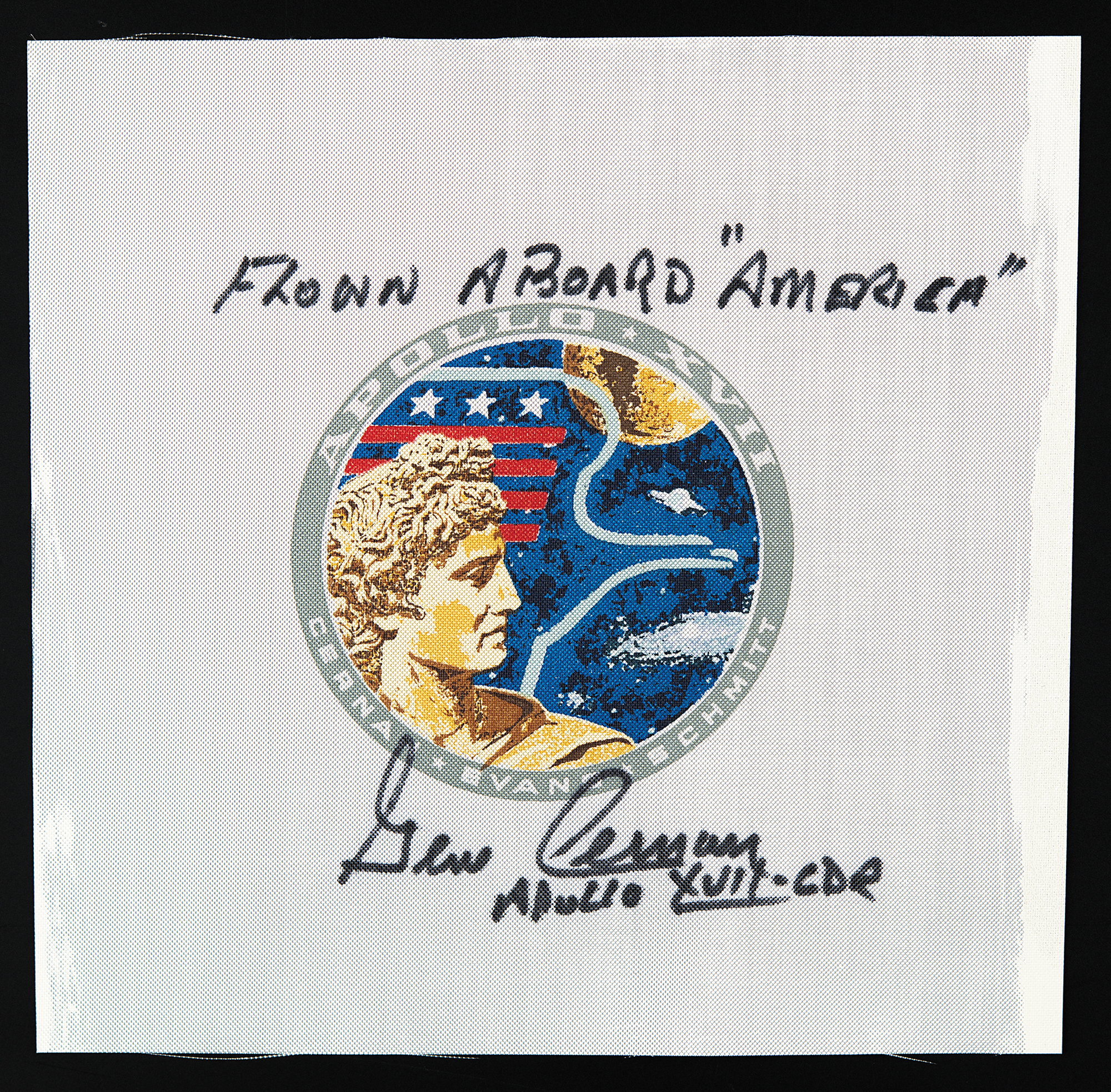 Superb flown 7˝ x 7˝ swatch of Beta cloth featuring the Apollo 17 mission emblem in the center, signed and flight-certified in black felt tip by the commander, "Flown aboard 'America,' Gene Cernan, Apollo XVII CDR." In fine condition. Carried into lunar orbit aboard the CSM 'America' during the Apollo program's final moon landing mission, this is an attractive, boldly signed flight-flown piece.