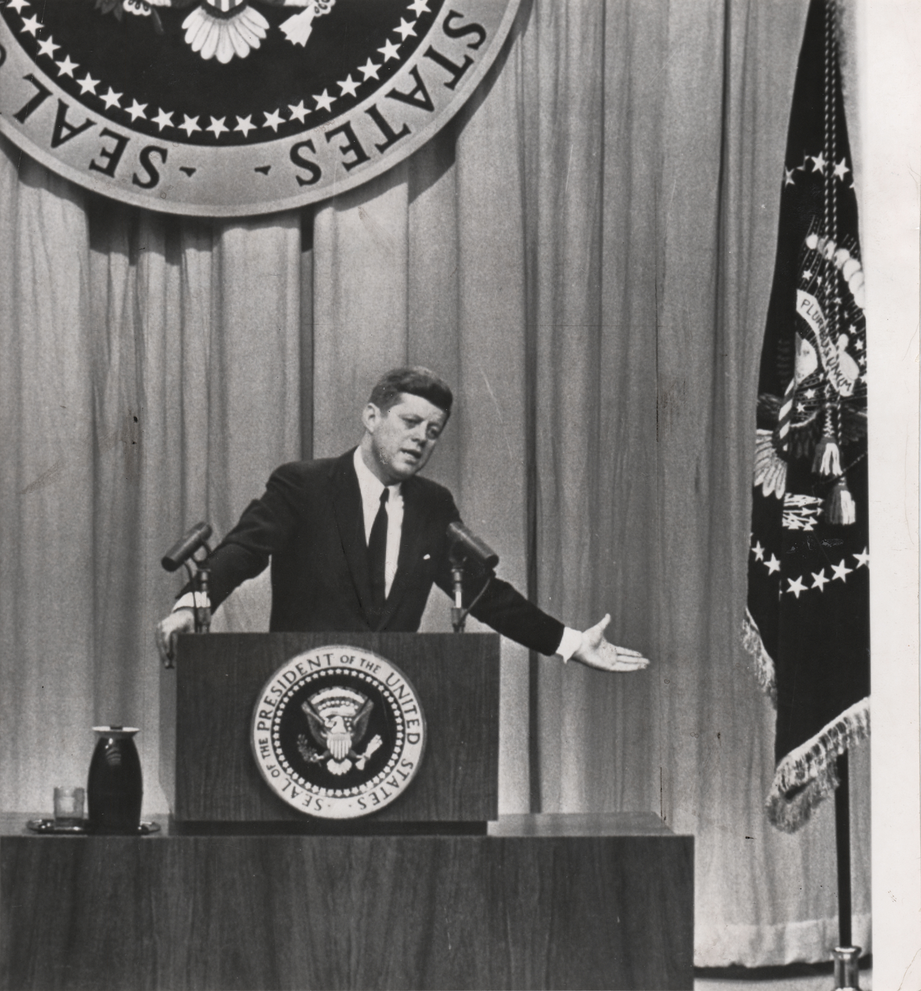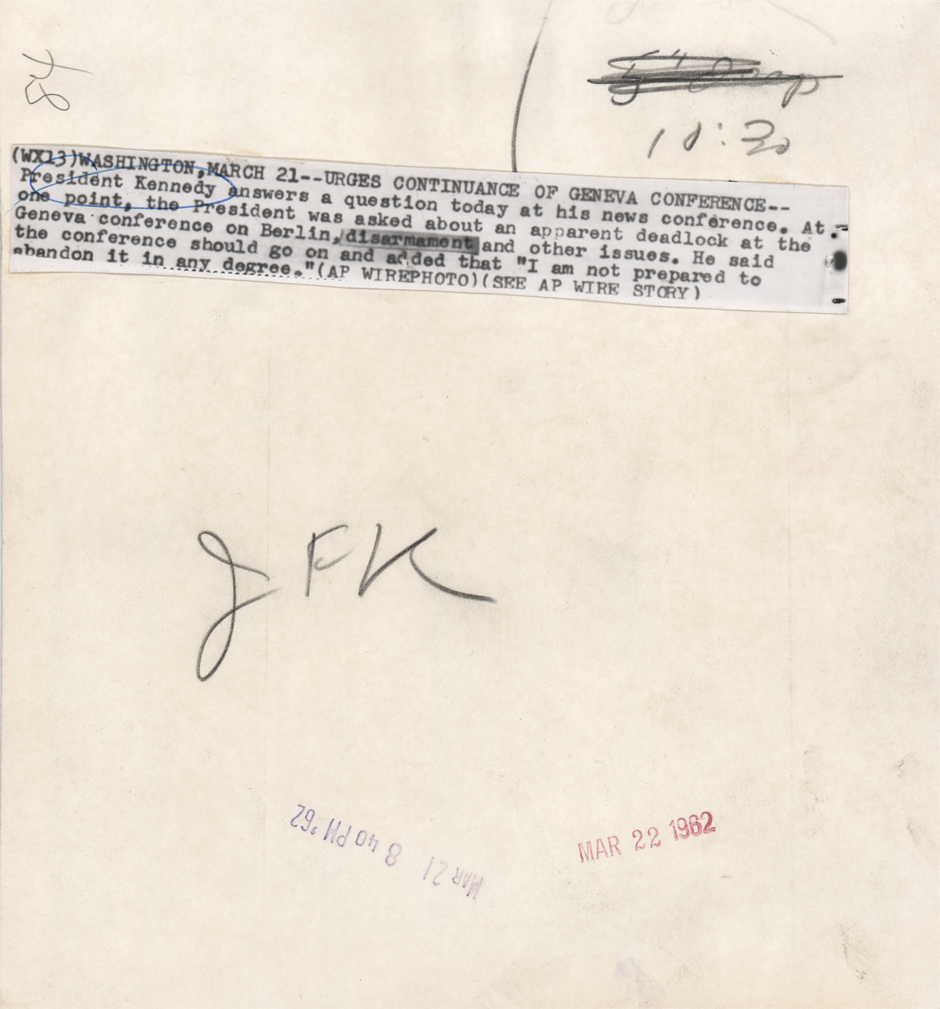 Original vintage glossy 7 x 7.75 AP wirephoto of President John F. Kennedy standing at the presidential podium on March 21, 1962, responding to a question about an apparent deadlock in disarmament negotiations at Geneva. Reverse is stamp-dated March 21/22, 1962, and the caption has been clipped and affixed. In fine condition, with slight rippling to the top edge and a minor corner crease.