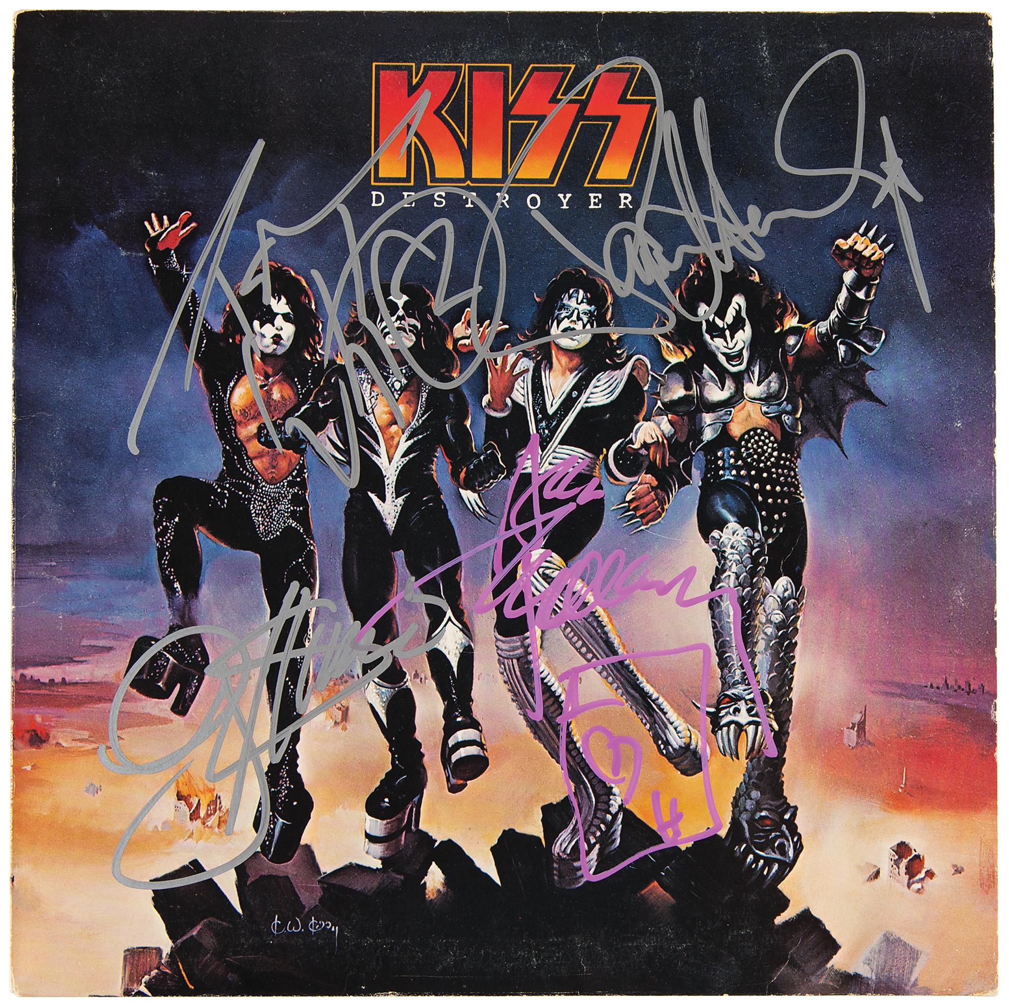 Destroyer album by KISS, signed on the front cover in silver ink by Gene Simmons, Peter Criss, and Paul Stanley, and pink paint pen by Ace Frehley, who adds a playing card sketch. In fine condition. The record is not included.