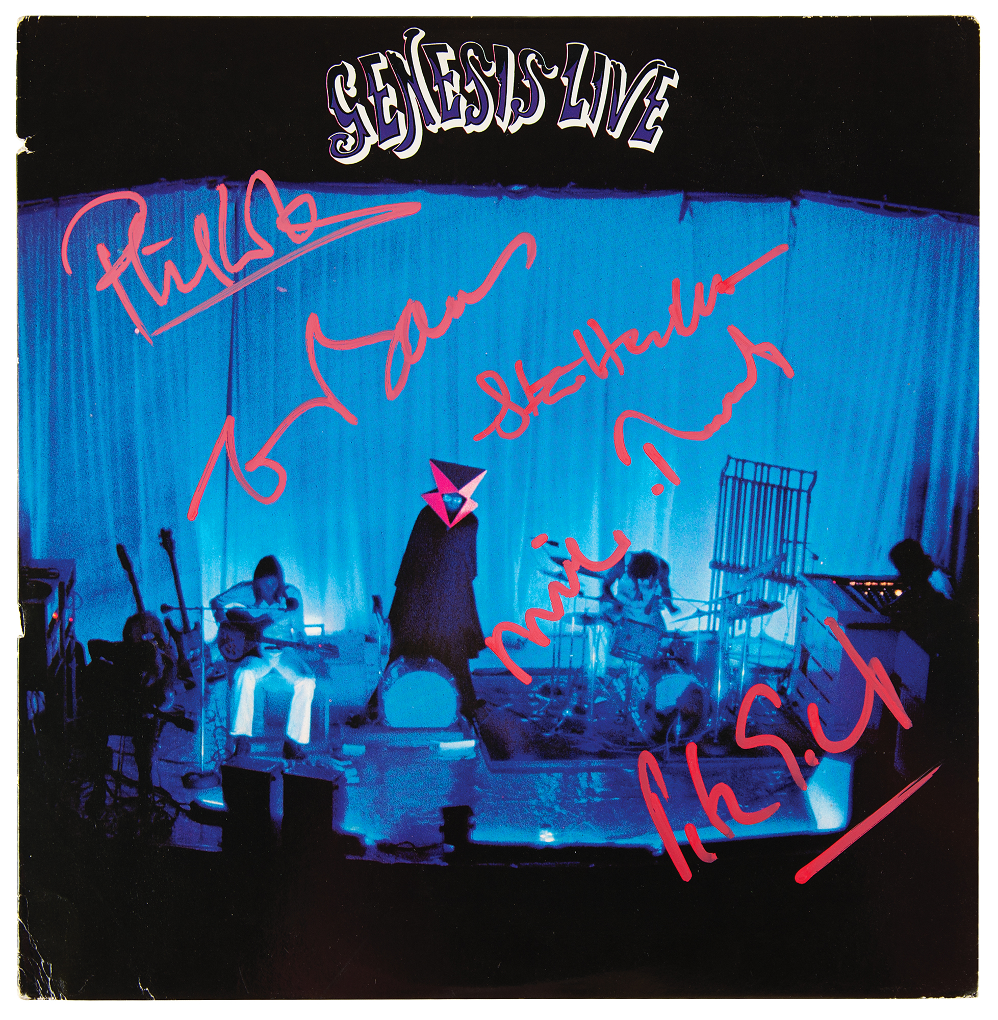 Genesis Live album signed on the front cover in pink paint pen by Peter Gabriel, Tony Banks, Steve Hackett, Mike Rutherford, and Phil Collins. In fine condition, with two small dings to the spine edge. The record is included.