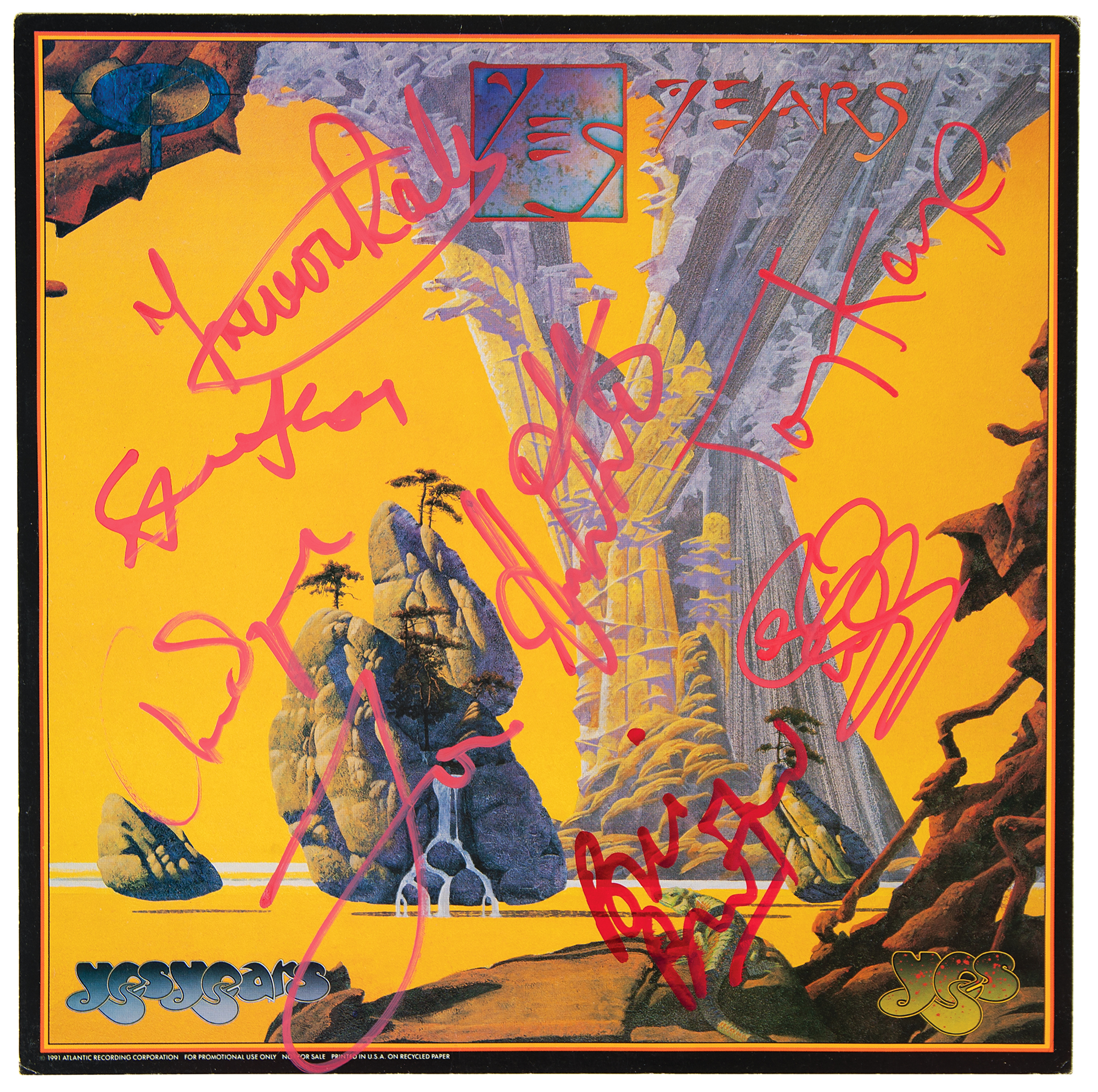 Album flat for the 1991 Yes boxset Yesyears, signed in red felt tip by ​Bill Bruford, and in pink paint pen by Jon Anderson, Chris Squire, Steve Howe, Alan White, Rick Wakeman, Tony Kaye, and Trevor Rabin. In fine condition. The record is not included.