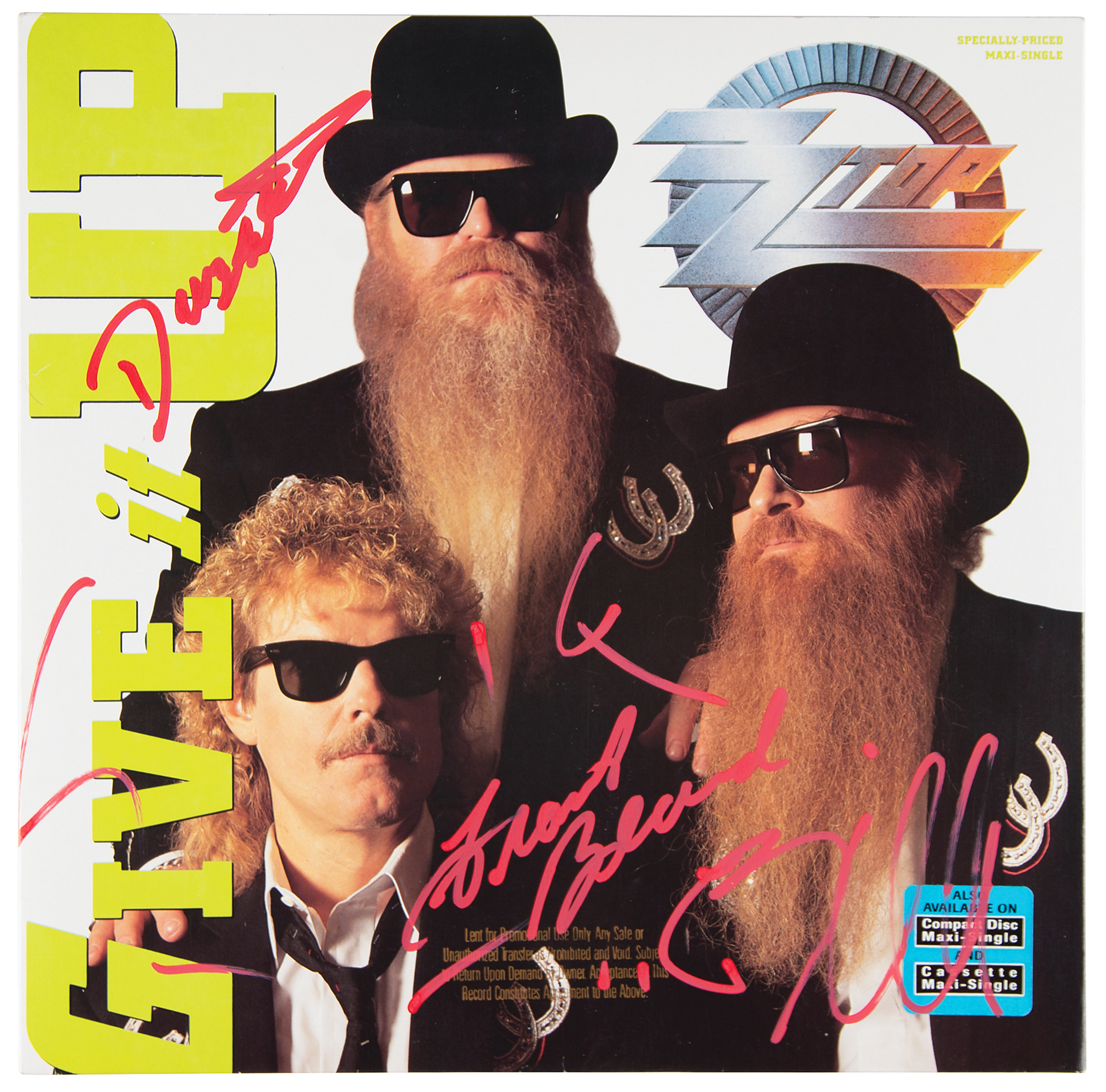 Promotional 12-inch maxi-single album for ‘Give It Up’ by ZZ Top, signed on the front cover in red paint pen by Dusty Hill, Billy Gibbons, and Frank Beard. In very fine condition. The record is included.