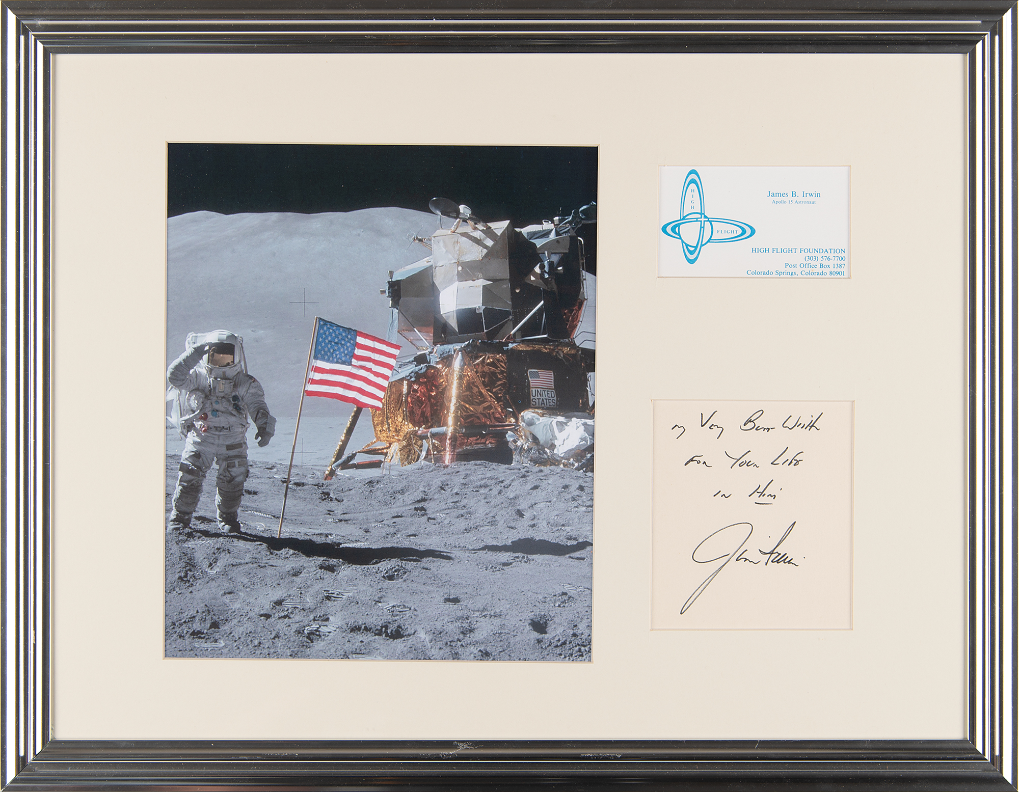 Accompanied by an additional High Flight Foundation ephemera, a framed print of the sonnet High Flight by war poet John Gillespie Magee, Jr., a DVD of Irwin’s The Moon & Beyond, e-mail correspondence related to the flight suit’s provenance, and a printed copy of the Apollo 15 press kit.