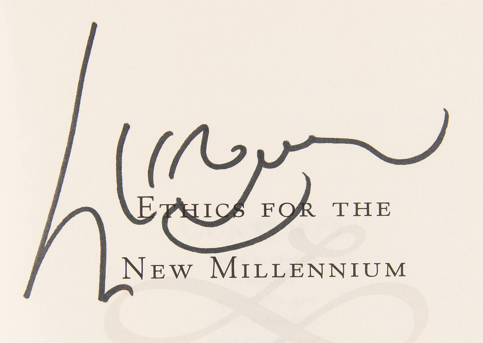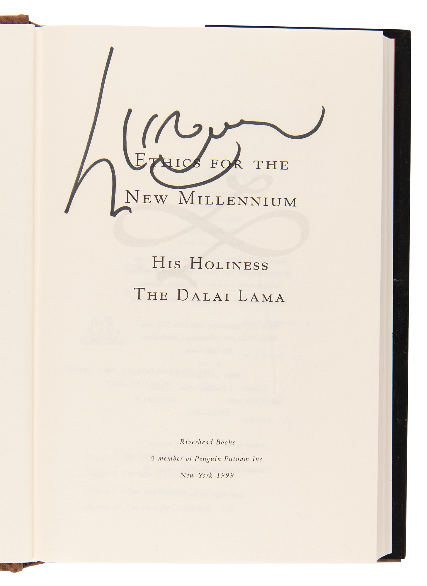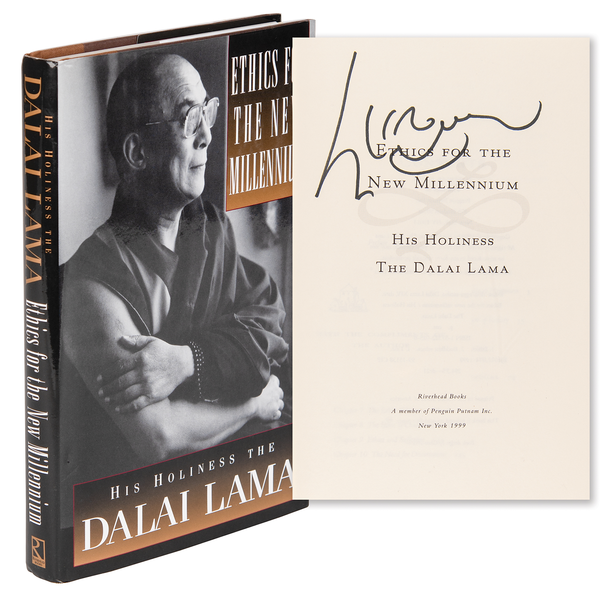 Signed book: Ethics for the New Millenium. Later printing. NY: Riverhead Books, 1999. Hardcover with dust jacket, 6.25 x 9.25, 237 pages. Signed on the title page in black felt tip by the Dalai Lama. In fine condition.