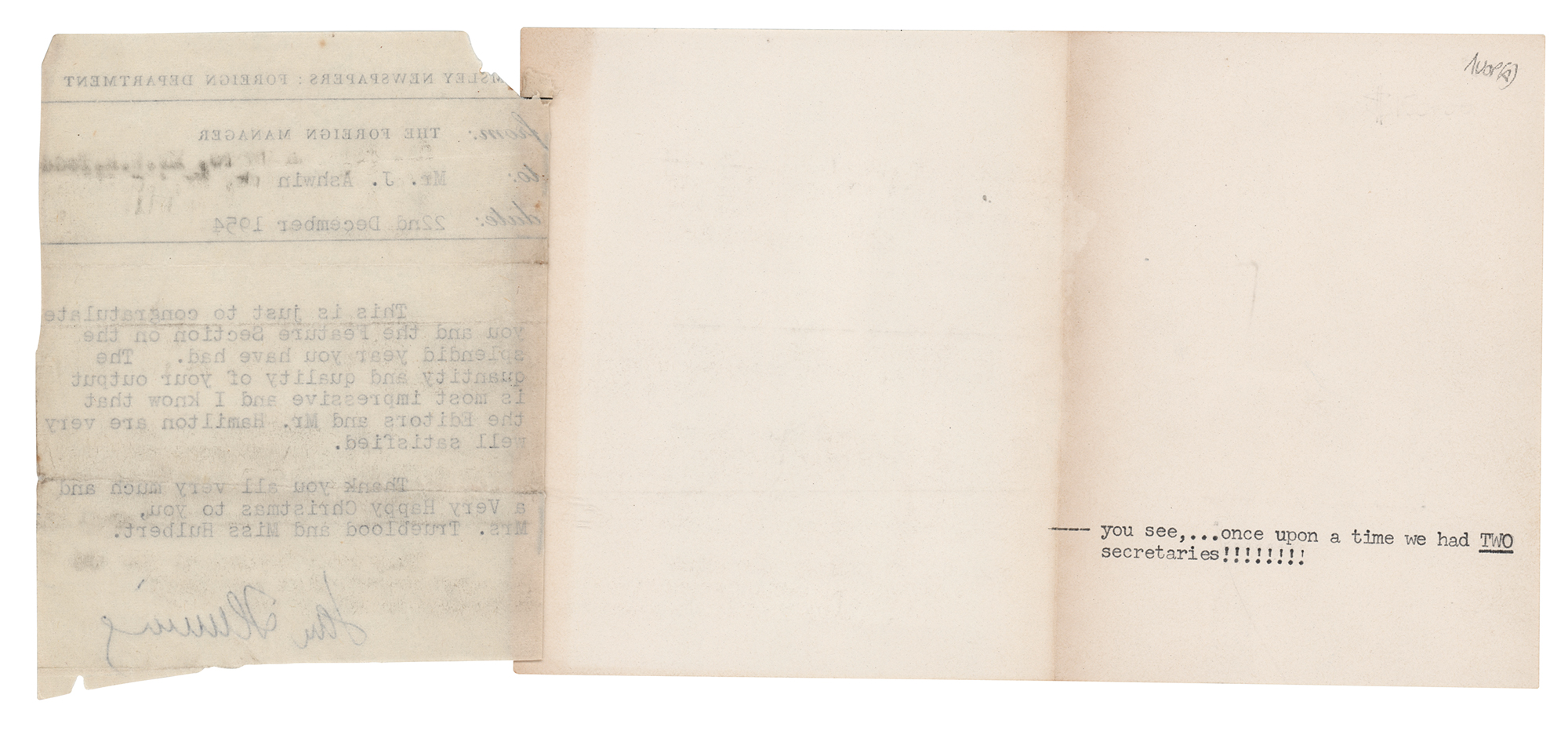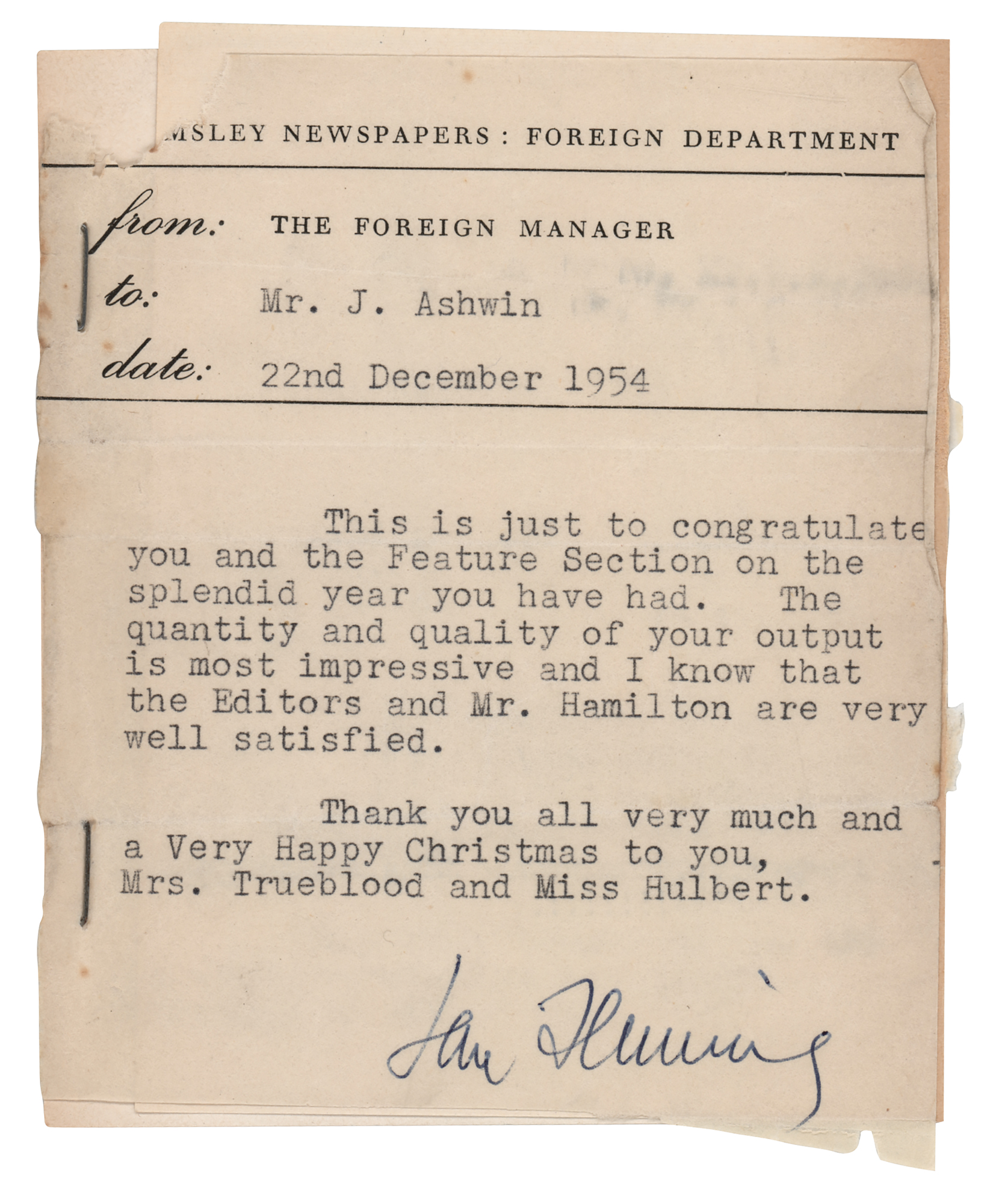 TLS signed “Ian Fleming,” one page, 4 x 5, Kemsley Newspapers: Foreign Department letterhead, December 22, 1954. Letter to Mr. J. Ashwin, in full: “This is just to congratulate you and the Feature Section on the splendid year you have had. The quantity and quality of your output is most impressive and I know that the Editors and Mr. Hamilton are very well satisfied. Thank you all very much and a Very Happy Christmas to you, Mrs. Trueblood and Miss Hulbert.” Stapled to a slightly larger sheet and in very good to fine condition, with some minor paper loss to the trimmed edges.