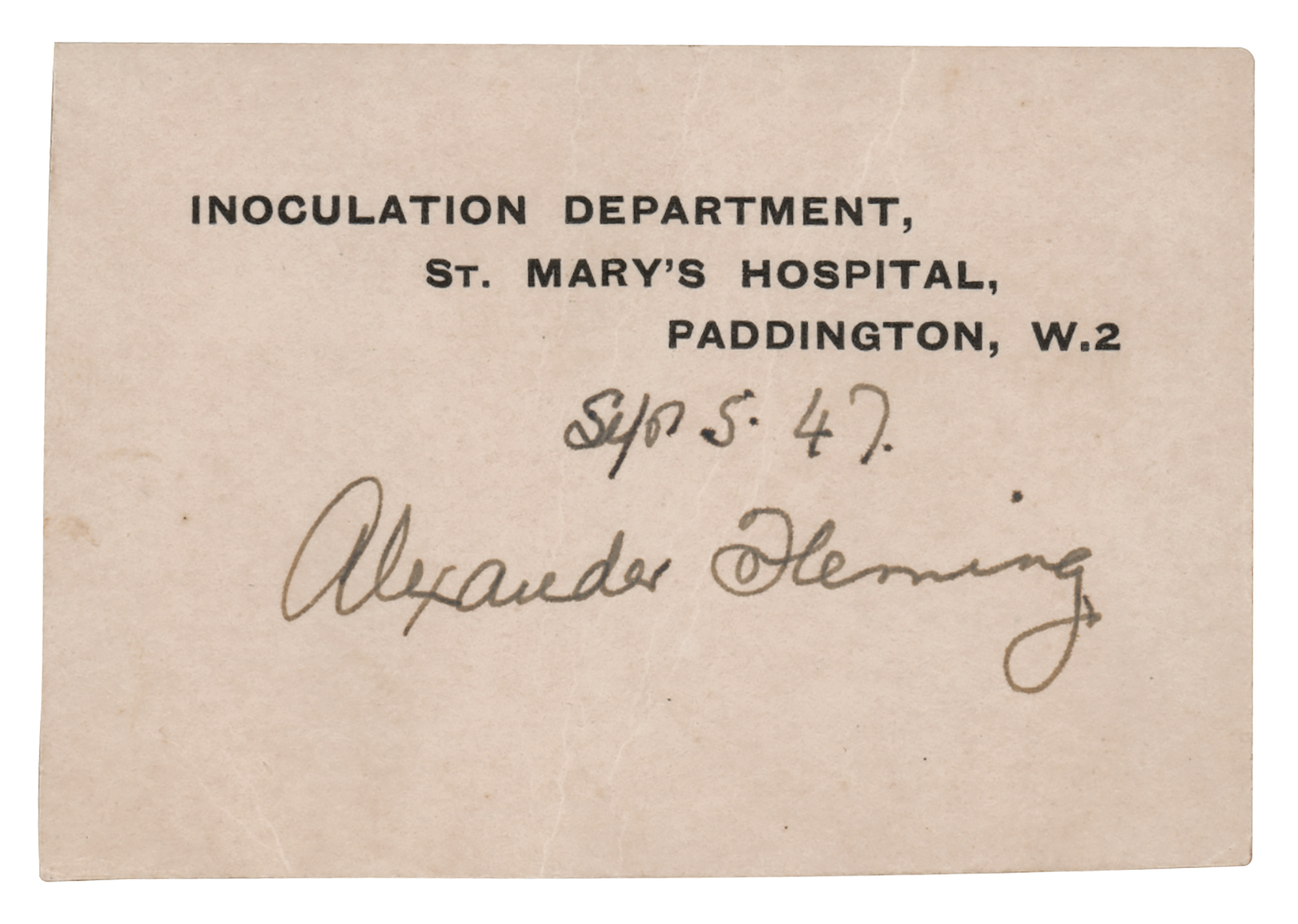 Ink signature, "Sep. 5, 47, Alexander Fleming,” on an off-white 3.25 x 2.25 St. Mary's Hospital (Inoculation Department) card. In fine condition.