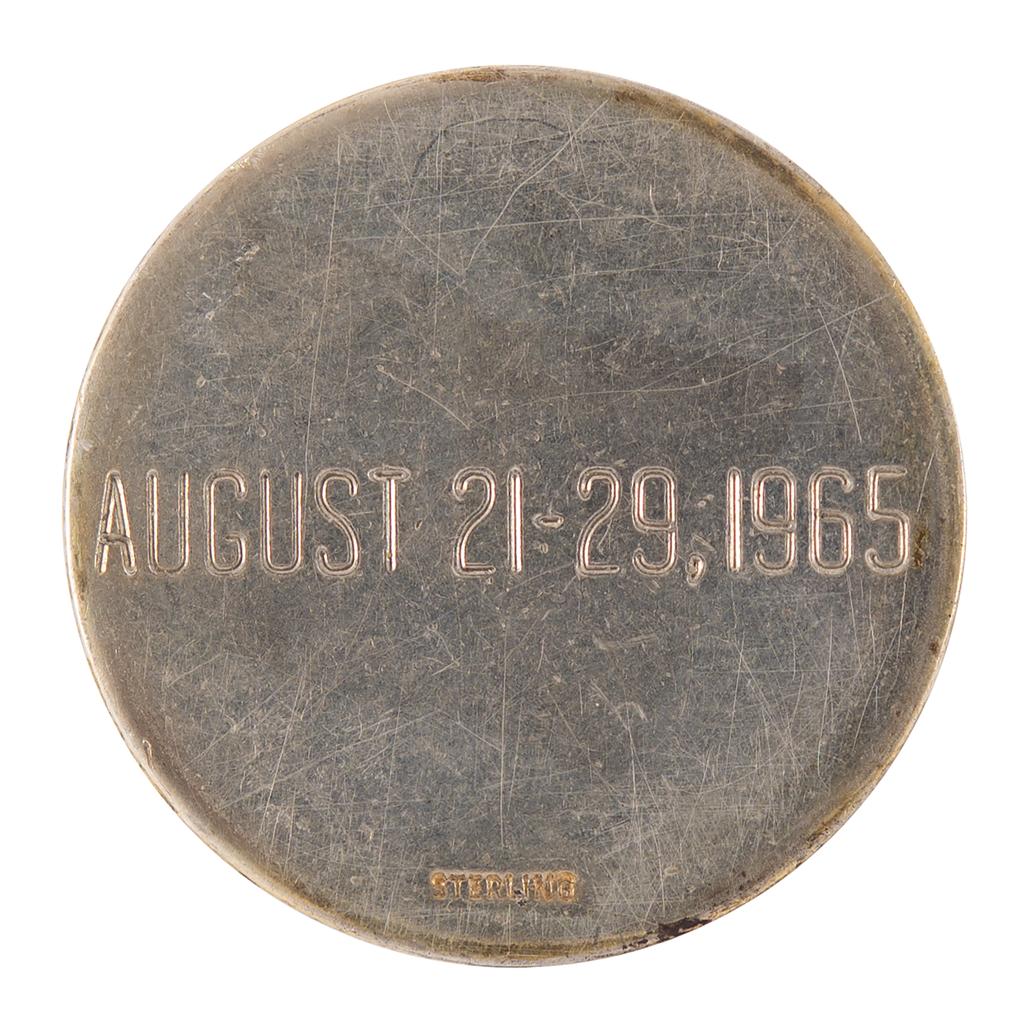 Flown gold-plated sterling silver Gemini 5 Fliteline medallion, approximately 1˝ in diameter, with a raised design of the "8 Days or Bust" mission insignia on the front, and the reverse engraved: "August 21–29, 1965," and hallmarked "Sterling" at the bottom. Condition is mint state, with noticeable fading to the gilt plating. A desirable example given that only 10 of the purported 100 Fliteline medals that flew on the Gemini 5 mission were plated with gold.