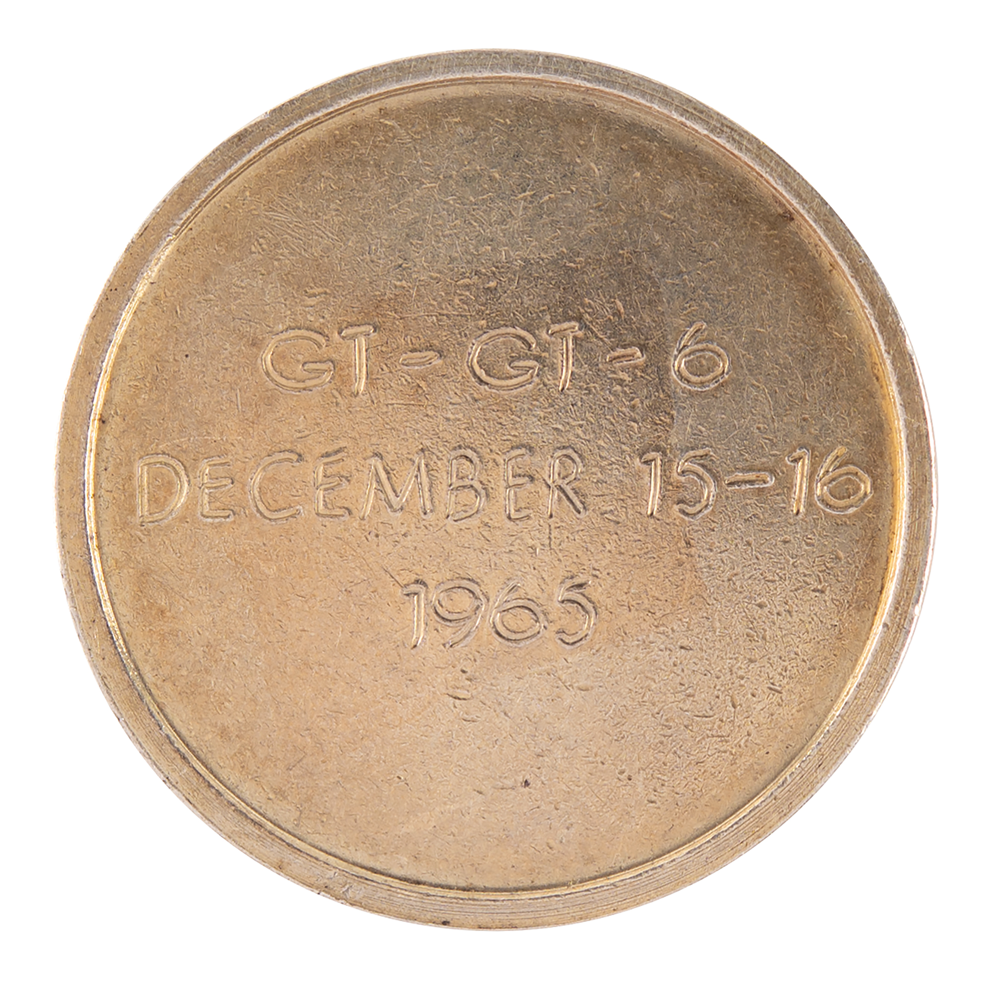Flown gold-plated Gemini 6 Fliteline medallion, approximately 1˝ in diameter, with a raised design of the 'Castor and Pollux' mission insignia on the front, and the reverse engraved: "GT-GT-6, December 15–16, 1965." Condition is mint state, with noticeable fading to the gilt plating. A highly desirable flown medallion given that of the few examples that traveled with Wally Schirra and Tom Stafford on the Gemini 6 mission, only 10 were gold-plated, with the balance minted in silver.