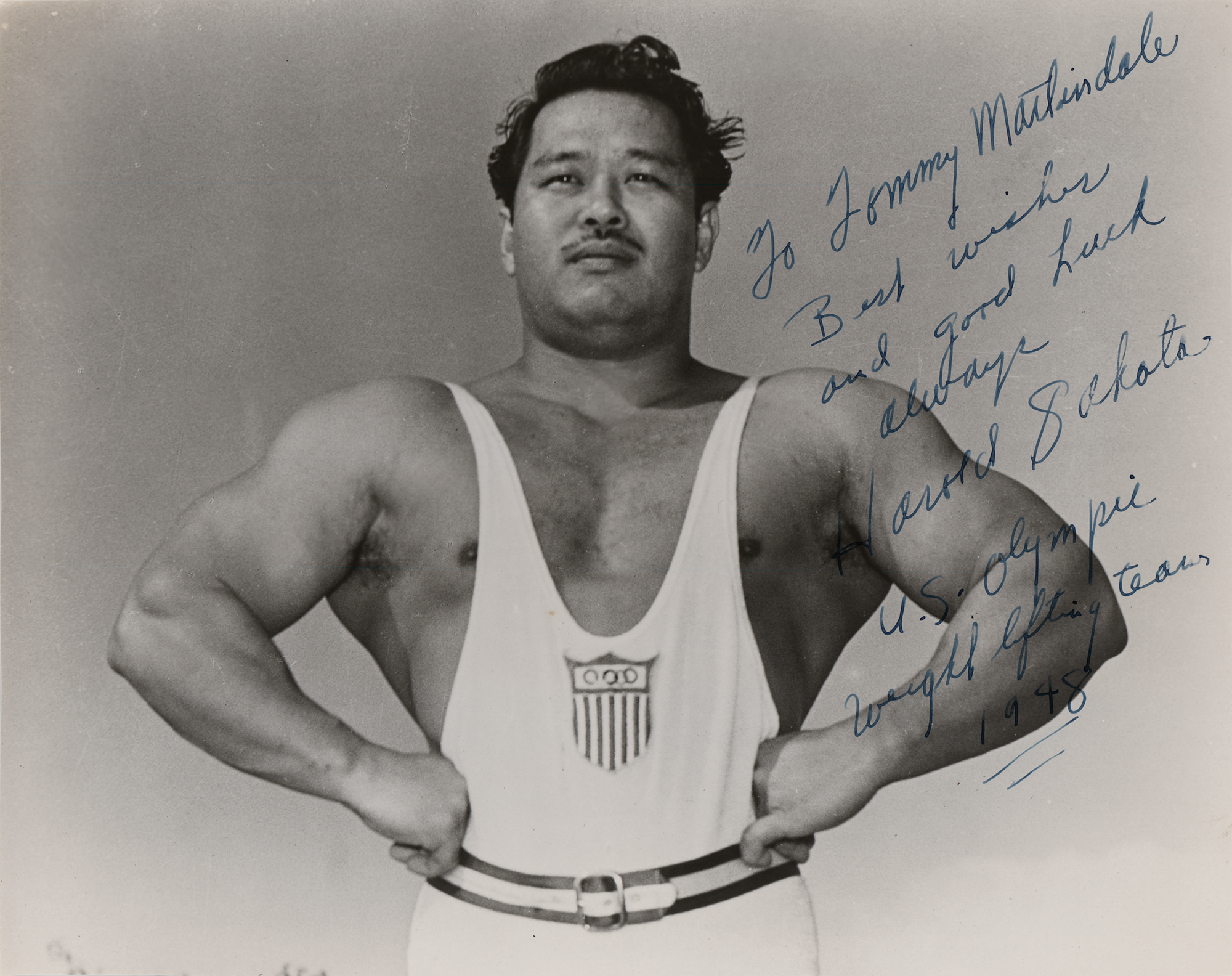 Japanese-American actor (1920-1982) and former silver medal-winning Olympic weightlifter best known for his role as the deadly hat-wielding Oddjob in the classic Bond film Goldfinger. Very rare vintage glossy 9.25 x 7.5 photo of Harold Sakata flexing and wearing his Olympic tank top, signed and inscribed in fountain pen, “To Tommy Martindale, Best wishes and good luck always, Harold Sakata, U.S. Olympic weight lifting team, 1948.” In fine condition, with trimmed edges. A marvelously rare photo of Sakata signed the very year he won a silver medal in the weightlifting light-heavyweight division at the London 1948 Summer Olympics—a powerful and uncommon pose.