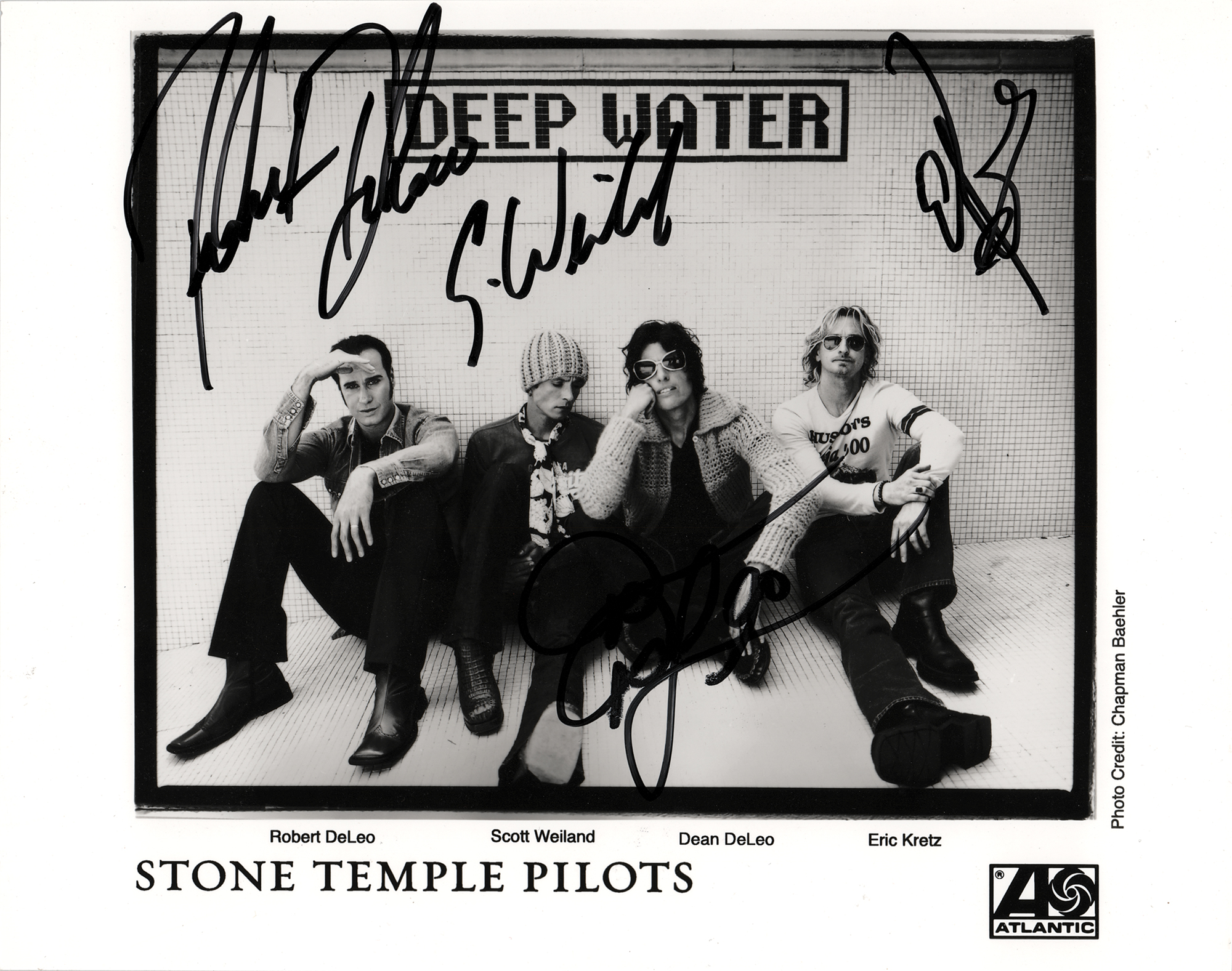 Glossy 10 x 8 Atlantic Records publicity photo of Stone Temple Pilots, signed in black felt tip by Scott Weiland, Dean DeLeo, Robert DeLeo, and Eric Kretz. In very fine condition.