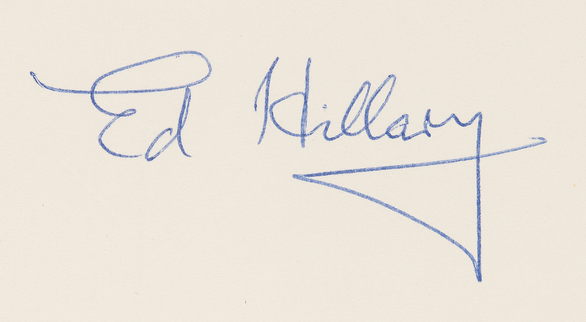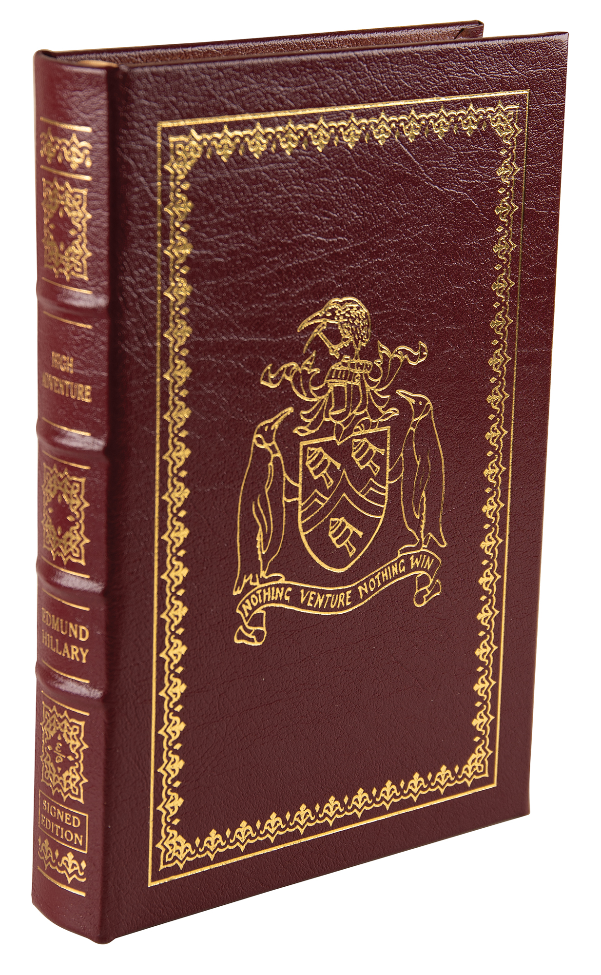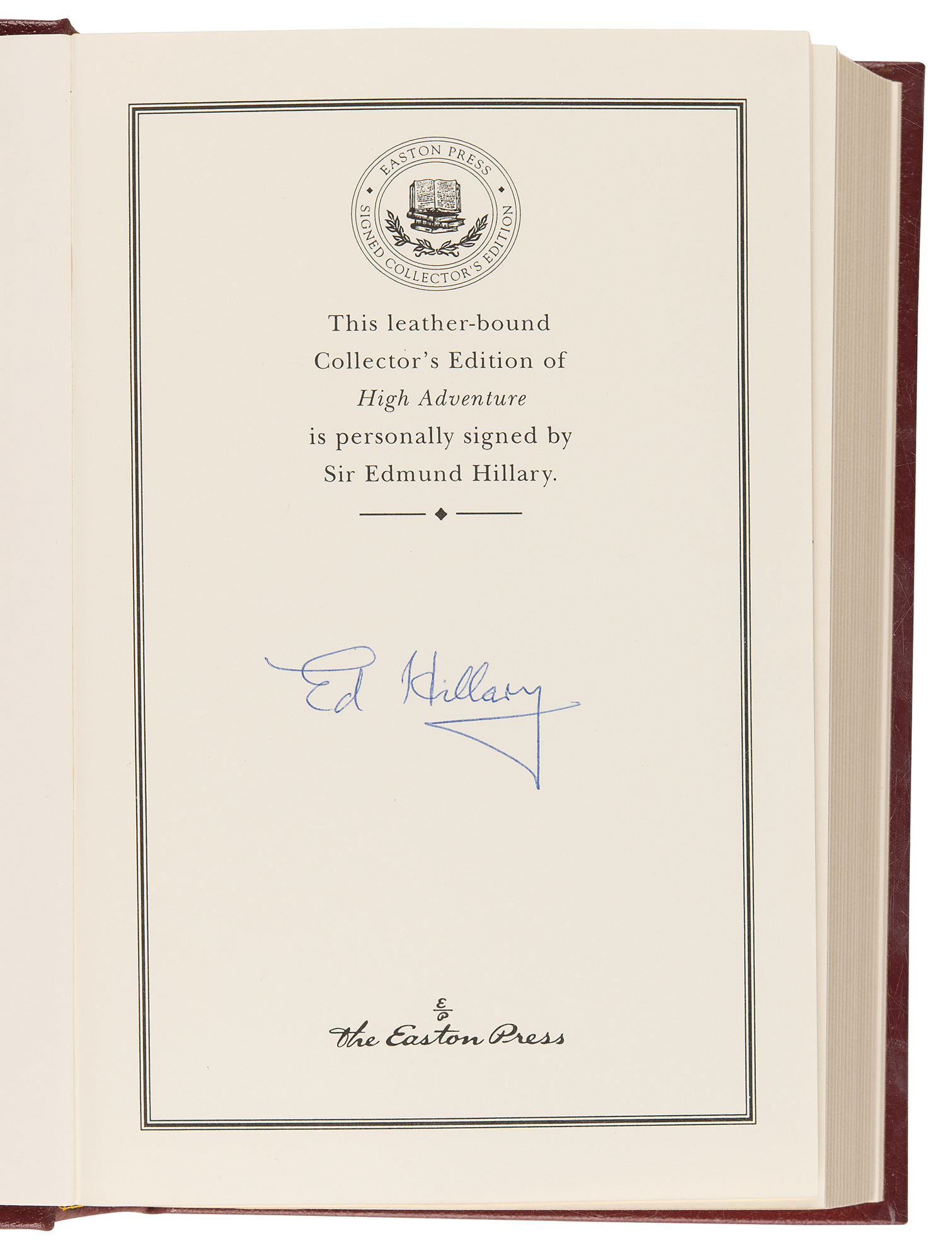 Signed book: High Adventure. Collector's edition. Norwalk, CT: Easton Press, 2003. Leatherbound hardcover, 6.5 x 9.5, 245 pages. Signed on the colophon in blue ballpoint, "Ed Hillary." In very fine condition. Accompanied by the publisher's certificate of authenticity.
