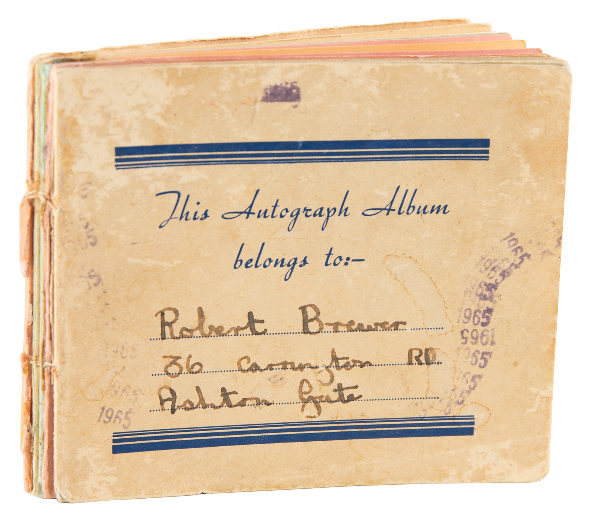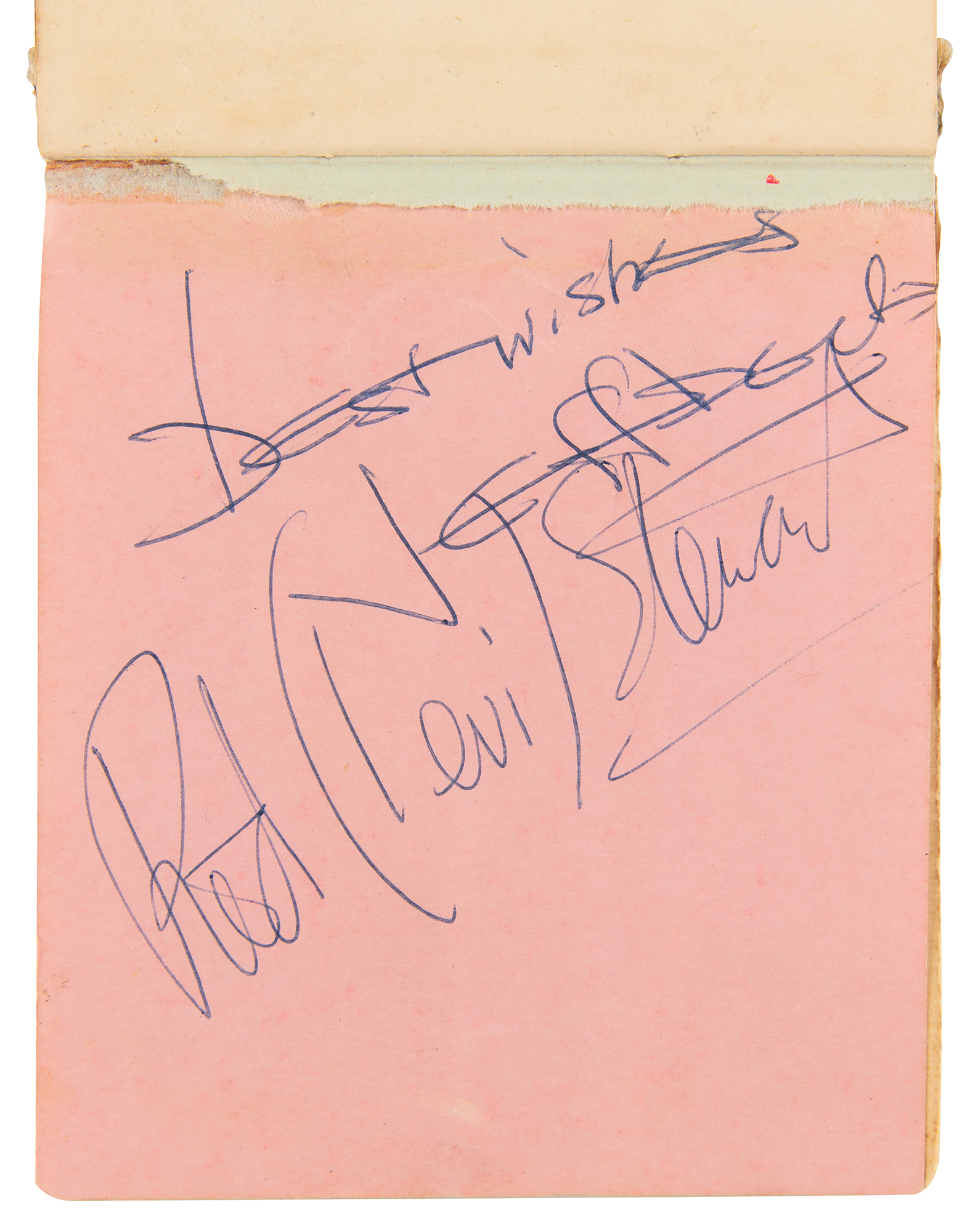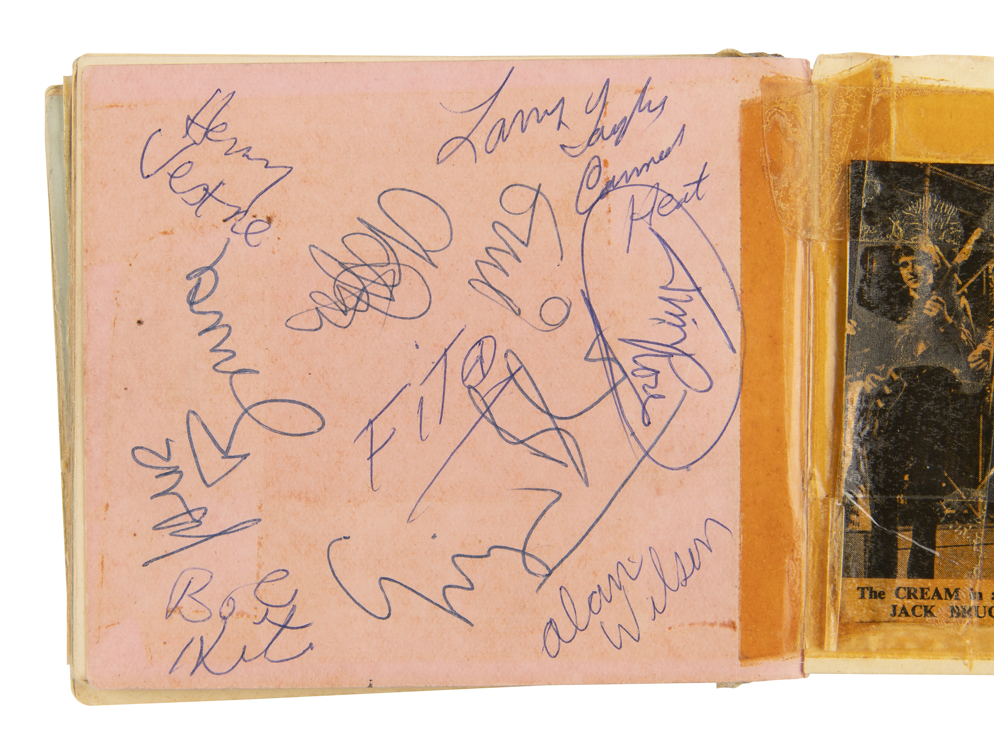 Vintage autograph album from the late 1960s, 4.75 x 4, signed inside in ballpoint on the same page by legendary rock bands Cream (Eric Clapton, Jack Bruce, and Ginger Baker) and Canned Heat (Bob Hite, Larry Taylor, Henry Vestine, Alan Wilson, and Adolfo ‘Fito’ de la Parra). The album also contains signatures of Rod Stewart and Jeff Beck (same page), Ron Wood, Tim Rose, and others. A band image clipping of Cream affixed to the inside back cover notes their appearance on the rock/pop music television program Ready Steady Go! The band made their British television debut on the show on November 4, 1966. In fine condition, with missing covers and a loose spine to the album itself.