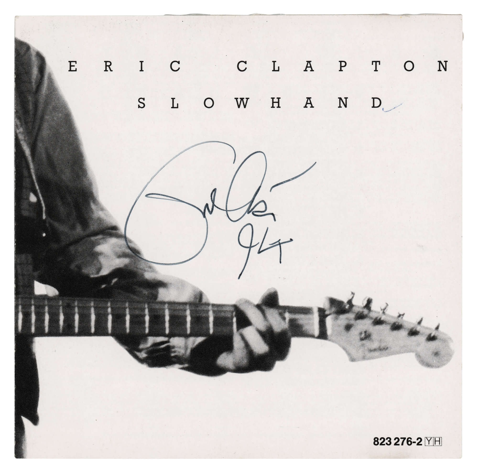 CD booklet for the Eric Clapton album Slowhand, signed on the front cover in black felt tip, "Eric Clapton, 94." In fine condition. The CD is not included.