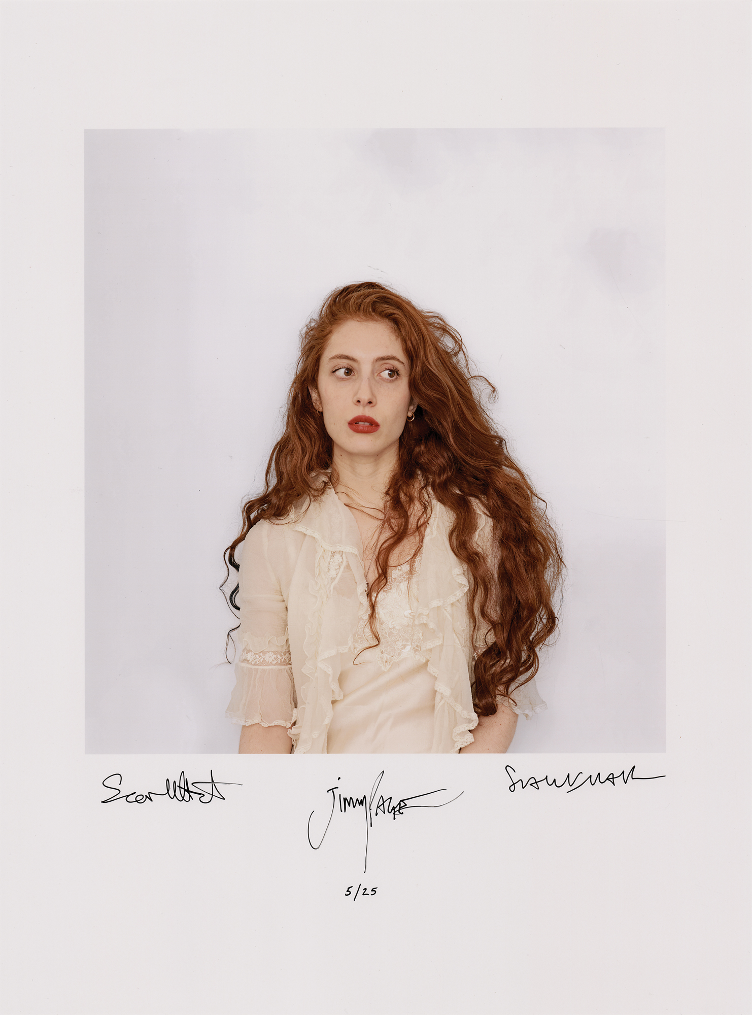 Limited edition color 16 x 20 print of the front cover design for Scarlett Sabet’s album Catalyst, numbered 5/25, signed below in black felt tip by Jimmy Page, Scarlett Sabet, and Page’s daughter, photographer Scarlet Page. In very fine condition. Catalyst is a spoken word album written and performed by Sabet and produced by Page, who explains the project: 'I knew Scarlett's poems were exceptionally vibrant in print and I had witnessed the power of her public readings. I thought it would be exciting to do a project together to emphasize the power of the spoken word in the context of poetry and present her work in a radical form.'