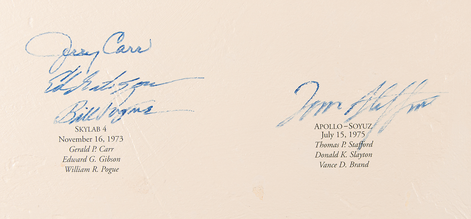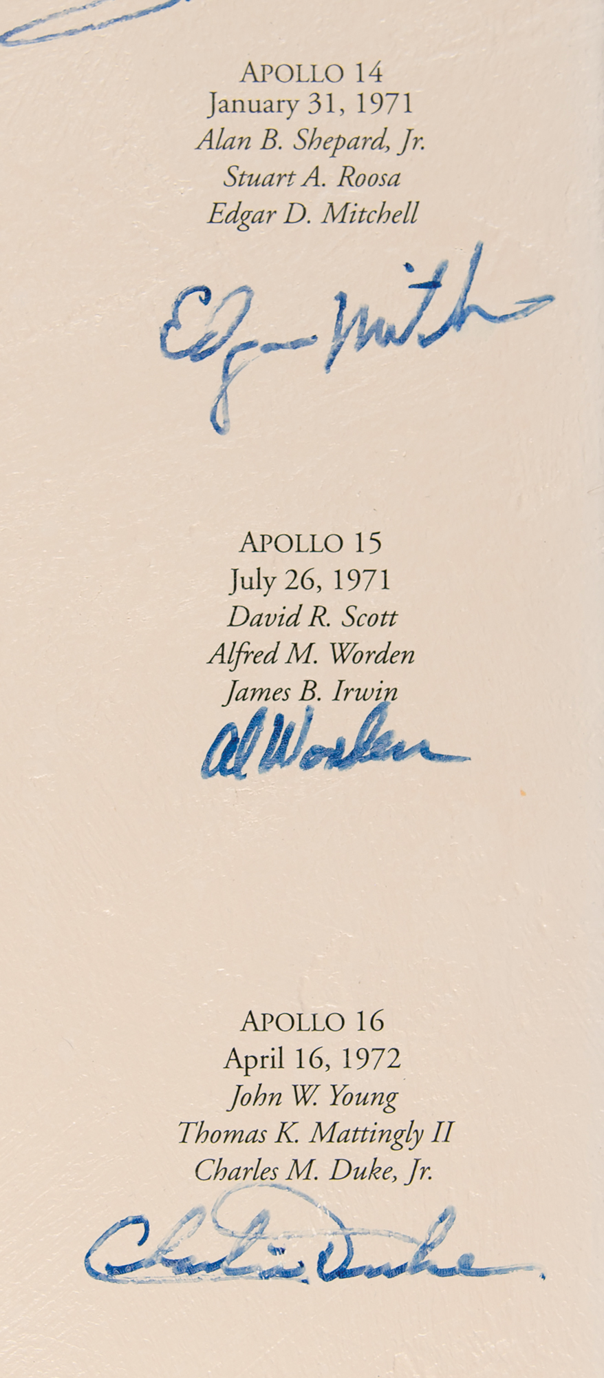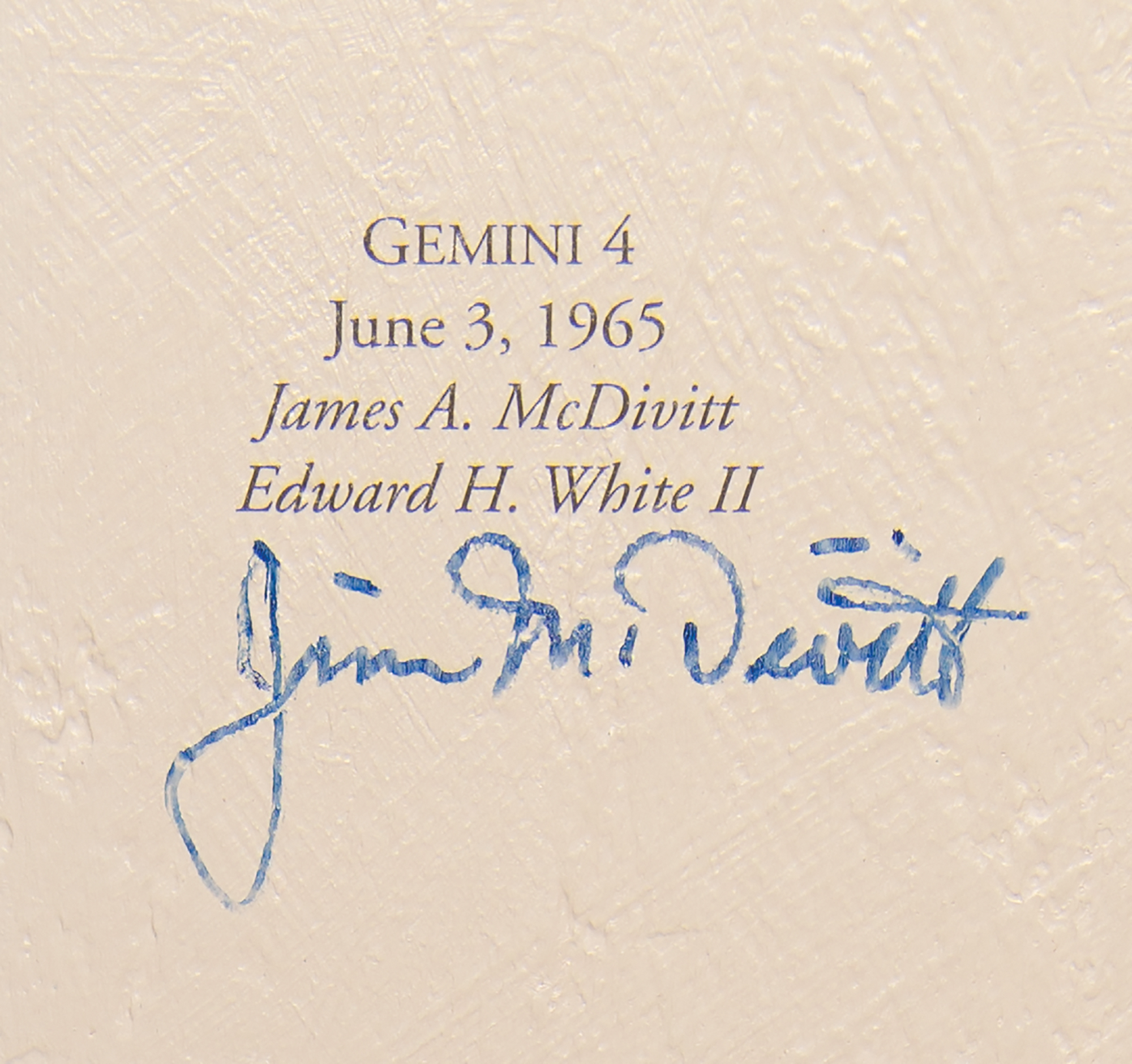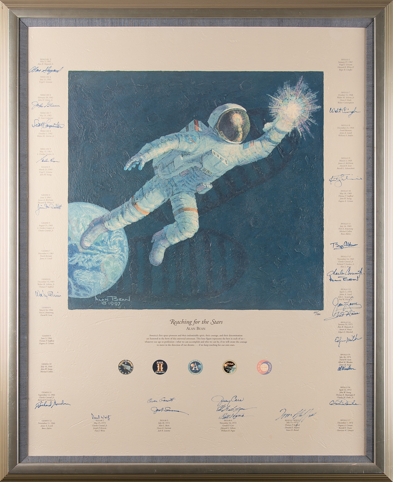 Wonderful limited edition color 27 x 34 textured canvas print of a 1997 painting by Alan Bean entitled ‘Reaching for the Stars,’ numbered 137/1500, stretched over a wooden frame, depicting an astronaut soaring away from Earth and grasping a star. Signed along the borders in ink and felt tip by 24 astronauts from the Mercury, Gemini, Apollo, and Skylab programs, including: Alan Shepard, John Glenn, Scott Carpenter, Gordon Cooper, Jim McDivitt, Wally Schirra, Richard Gordon, Paul Weitz, Owen Garriott, Jack Lousma, Jerry Carr, Ed Gibson, Bill Pogue, Tom Stafford, Walt Cunningham, Rusty Schweickart, Buzz Aldrin, Charles Conrad, Alan Bean, James Lovell, Fred Haise, Edgar Mitchell, Al Worden, and Charlie Duke. Framed without glass to an overall size of 31 x 38. In very fine condition. Accompanied by a certificate of authenticity from the publisher, The Greenwich Workshop.