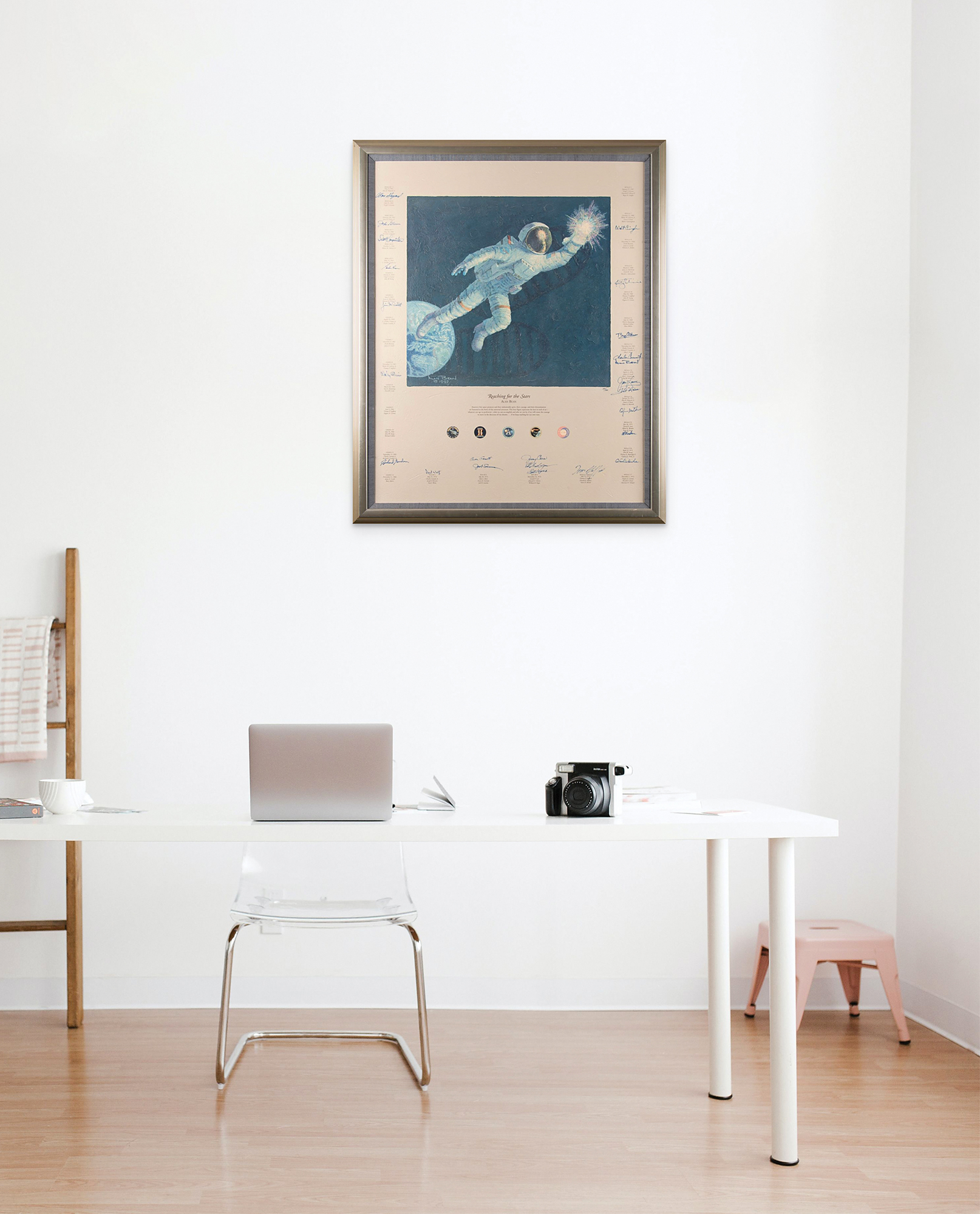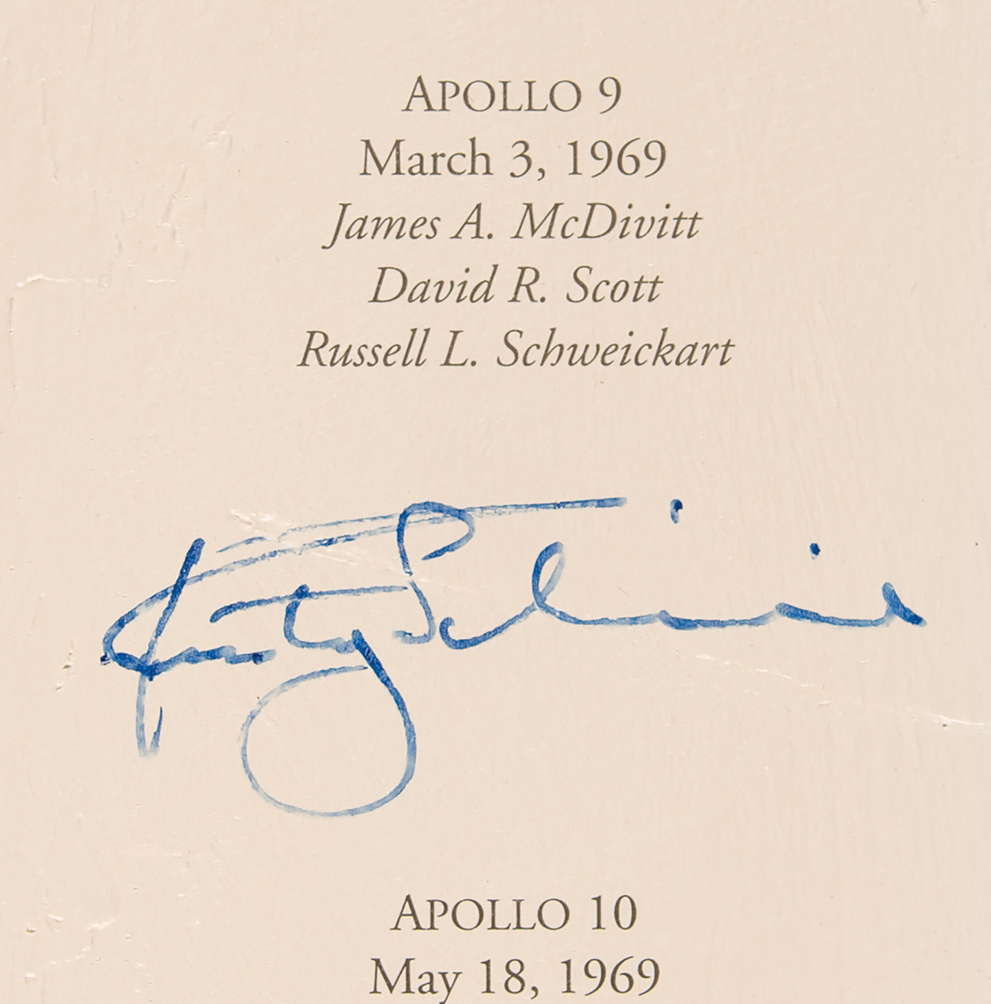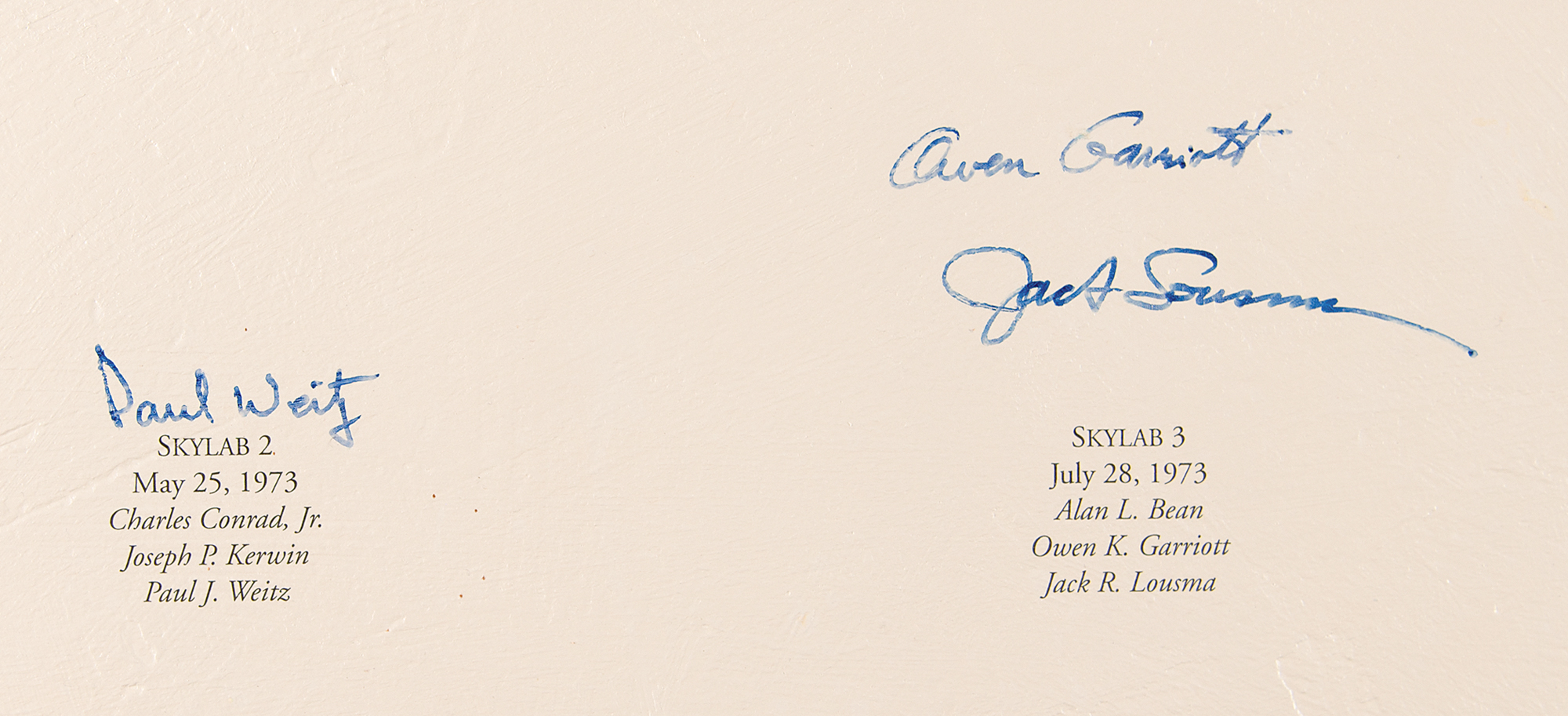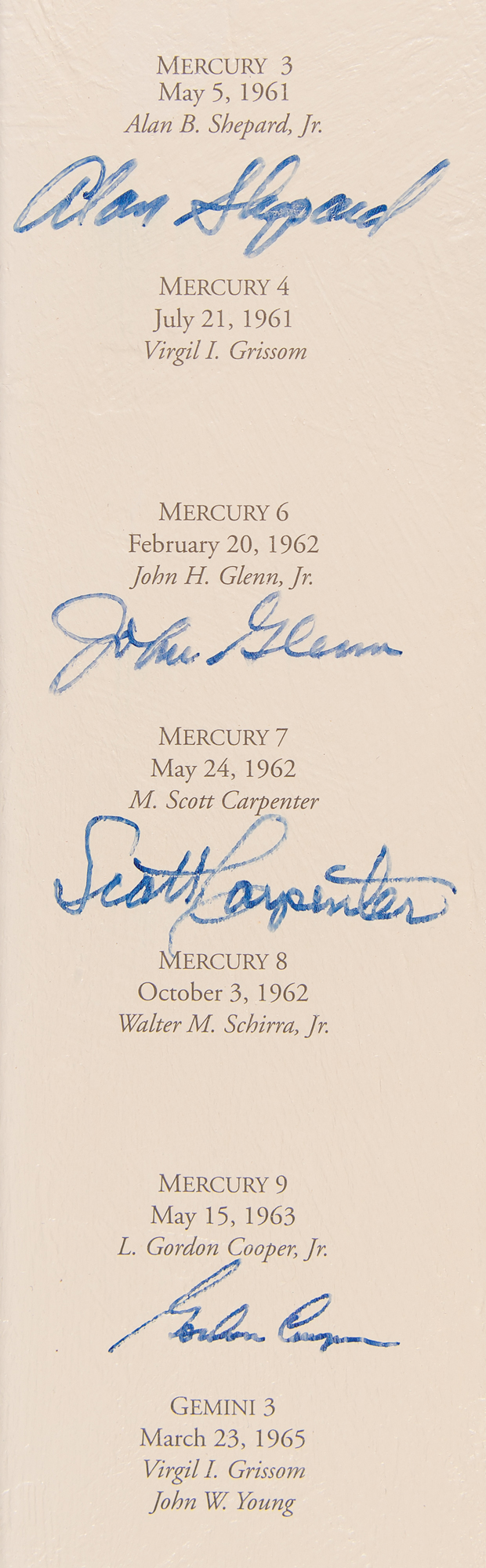 Wonderful limited edition color 27 x 34 textured canvas print of a 1997 painting by Alan Bean entitled ‘Reaching for the Stars,’ numbered 137/1500, stretched over a wooden frame, depicting an astronaut soaring away from Earth and grasping a star. Signed along the borders in ink and felt tip by 24 astronauts from the Mercury, Gemini, Apollo, and Skylab programs, including: Alan Shepard, John Glenn, Scott Carpenter, Gordon Cooper, Jim McDivitt, Wally Schirra, Richard Gordon, Paul Weitz, Owen Garriott, Jack Lousma, Jerry Carr, Ed Gibson, Bill Pogue, Tom Stafford, Walt Cunningham, Rusty Schweickart, Buzz Aldrin, Charles Conrad, Alan Bean, James Lovell, Fred Haise, Edgar Mitchell, Al Worden, and Charlie Duke. Framed without glass to an overall size of 31 x 38. In very fine condition. Accompanied by a certificate of authenticity from the publisher, The Greenwich Workshop.