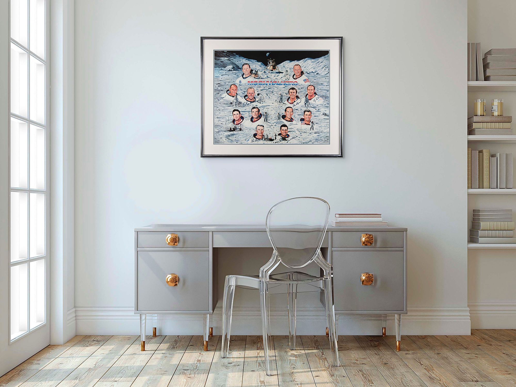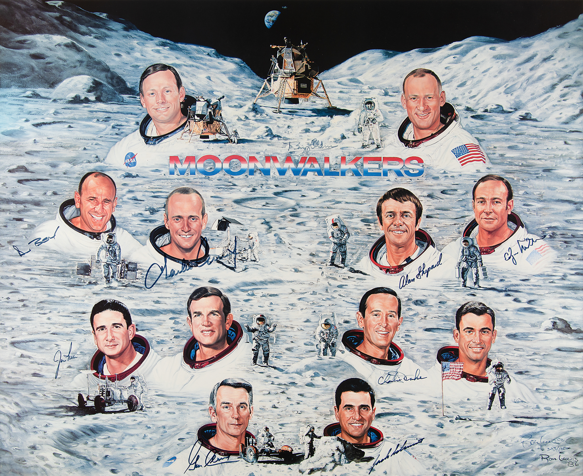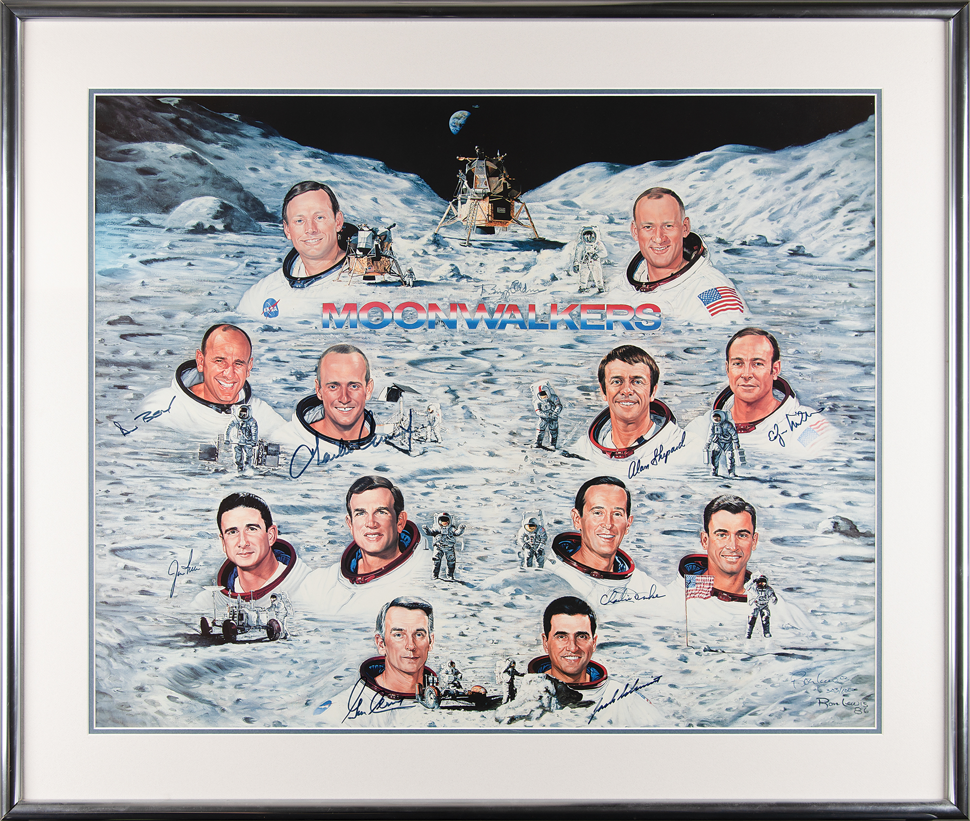 Attractive limited edition color 30 x 24.5 lithograph entitled 'Moonwalkers,' numbered 303/1000, signed in black felt tip by nine of the twelve moonwalkers: Buzz Aldrin, Alan Bean, Charles Conrad, Alan Shepard, Edgar Mitchell, Jim Irwin, Charlie Duke, Gene Cernan, and Harrison Schmitt. Also signed by the artist, Ron Lewis. Double-matted and framed to an overall size of 37 x 32. In very fine condition. Accompanied by a certificate of authenticity from Novaspace.