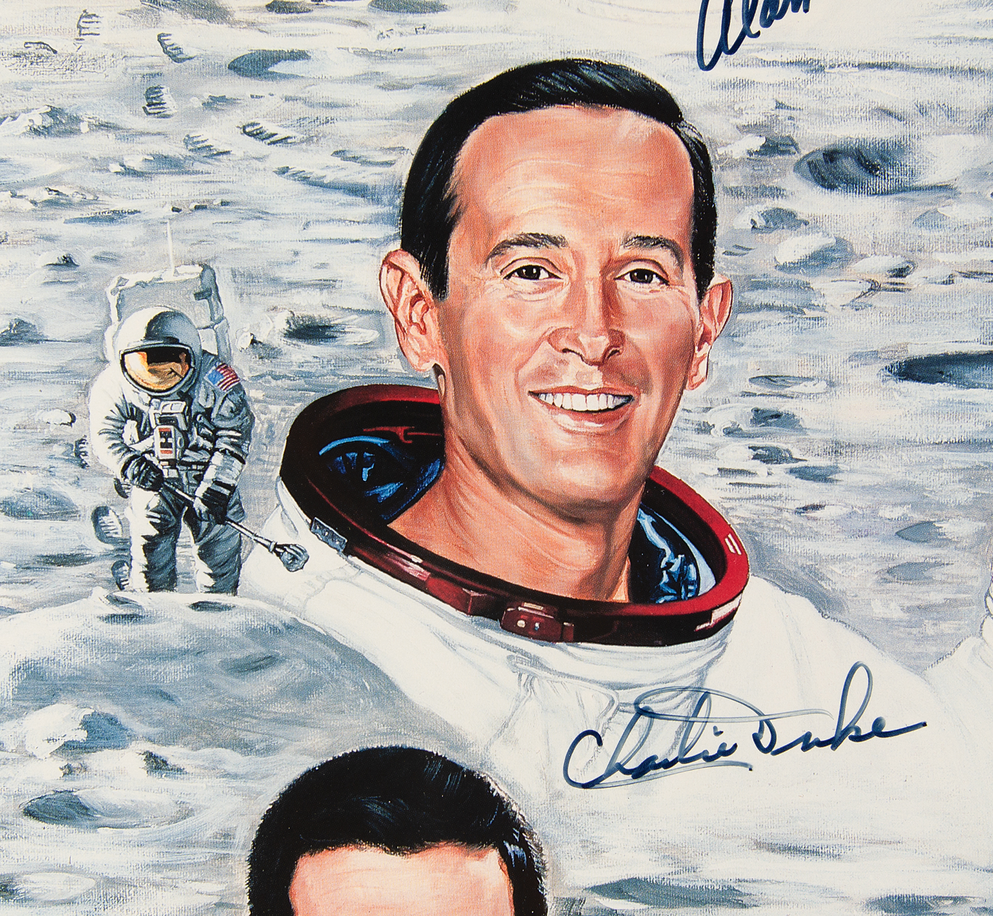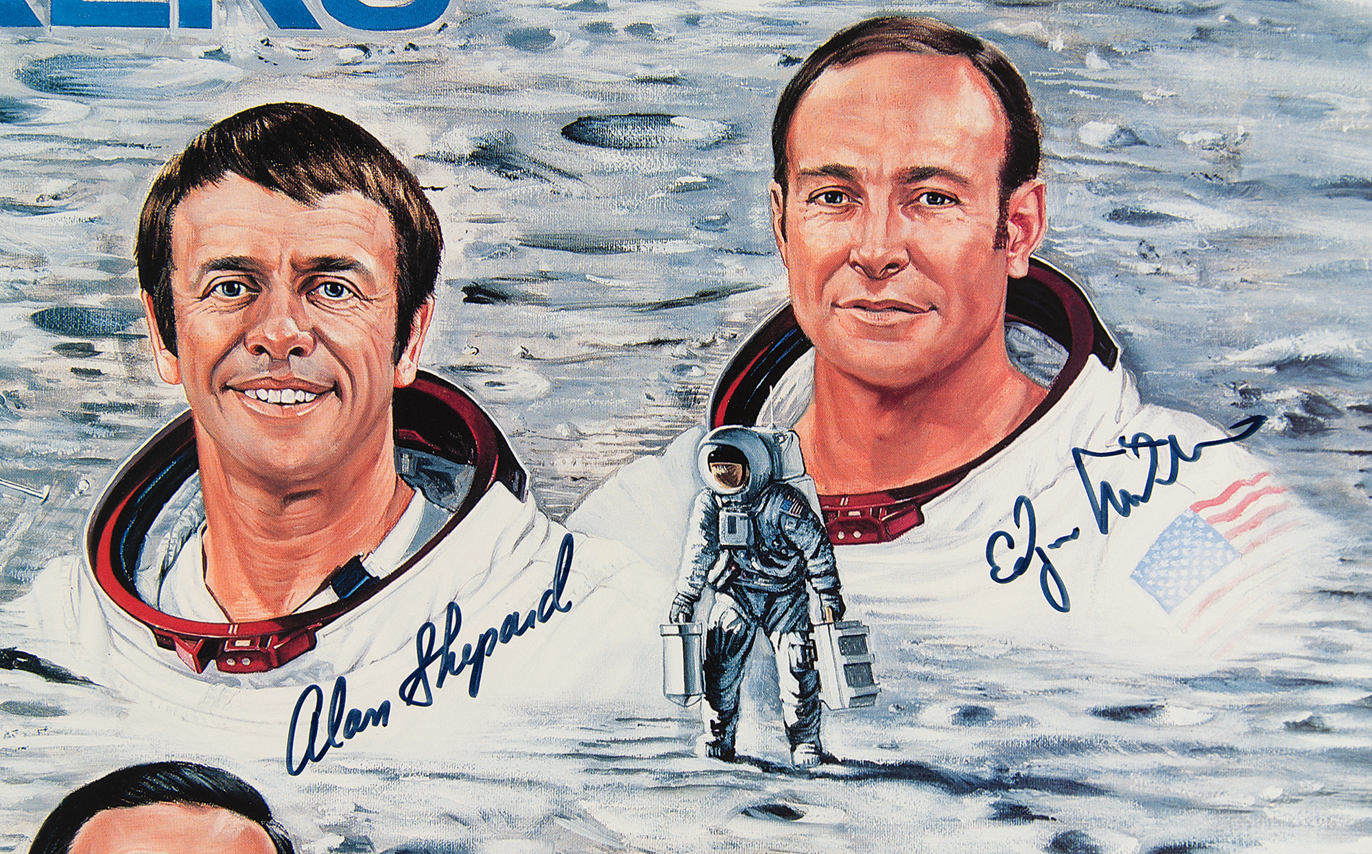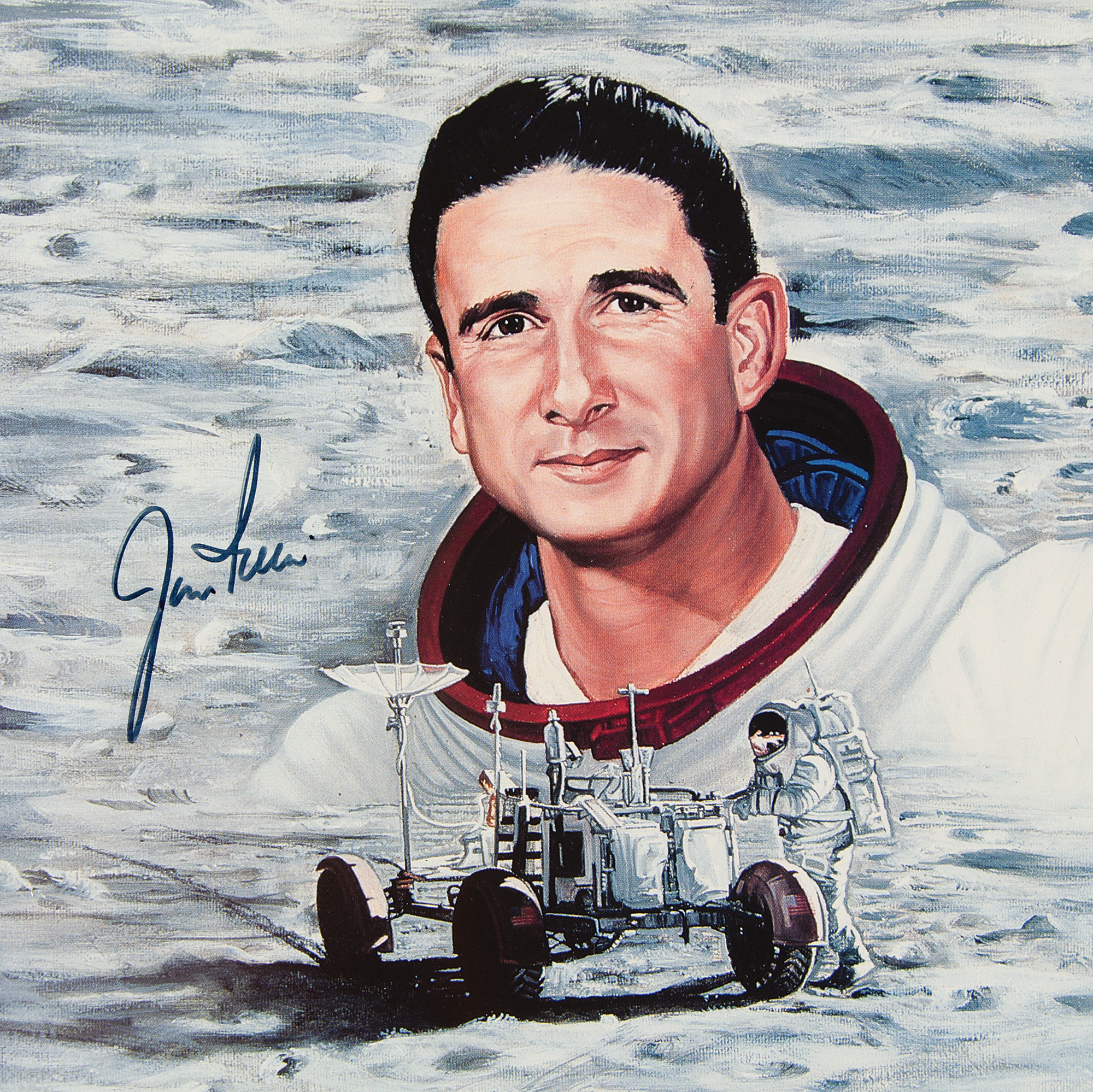 Attractive limited edition color 30 x 24.5 lithograph entitled 'Moonwalkers,' numbered 303/1000, signed in black felt tip by nine of the twelve moonwalkers: Buzz Aldrin, Alan Bean, Charles Conrad, Alan Shepard, Edgar Mitchell, Jim Irwin, Charlie Duke, Gene Cernan, and Harrison Schmitt. Also signed by the artist, Ron Lewis. Double-matted and framed to an overall size of 37 x 32. In very fine condition. Accompanied by a certificate of authenticity from Novaspace.