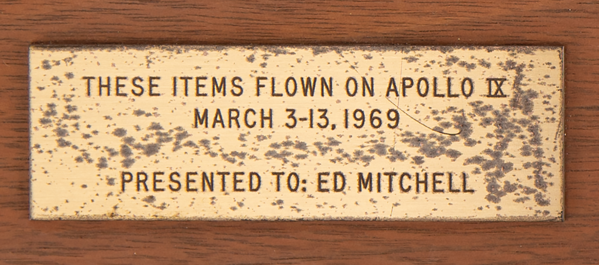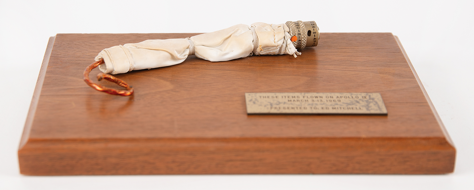 Edgar Mitchell's section of electrical utility light cord flown in Earth orbit on the Apollo 9 Lunar Module Spider, measuring 6˝ long, terminating in a four-pin cannon plug, marked: "LSC390-8-400411." Affixed to a wooden 9˝ x 6˝ plaque with engraved presentation plate: "These items flown on Apollo IX, March 3–13, 1969, Presented to: Ed Mitchell." Within the protective Beta cloth cover is copper wire inside clear insulation, which was designed to power a small, portable utility light for the astronauts' use inside the Lunar Module. In fine condition, with tarnishing to the plaque. Selected as an astronaut as part of Group 5 in 1966, Mitchell's first assignment in the Apollo program was as part of the support crew for Apollo 9; it seems that he received this flown hardware presentation as a token of appreciation for his work in that role.