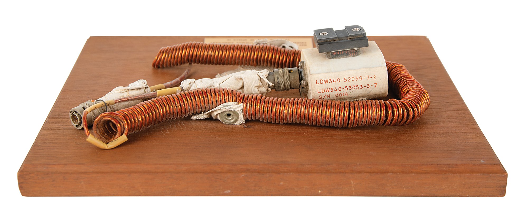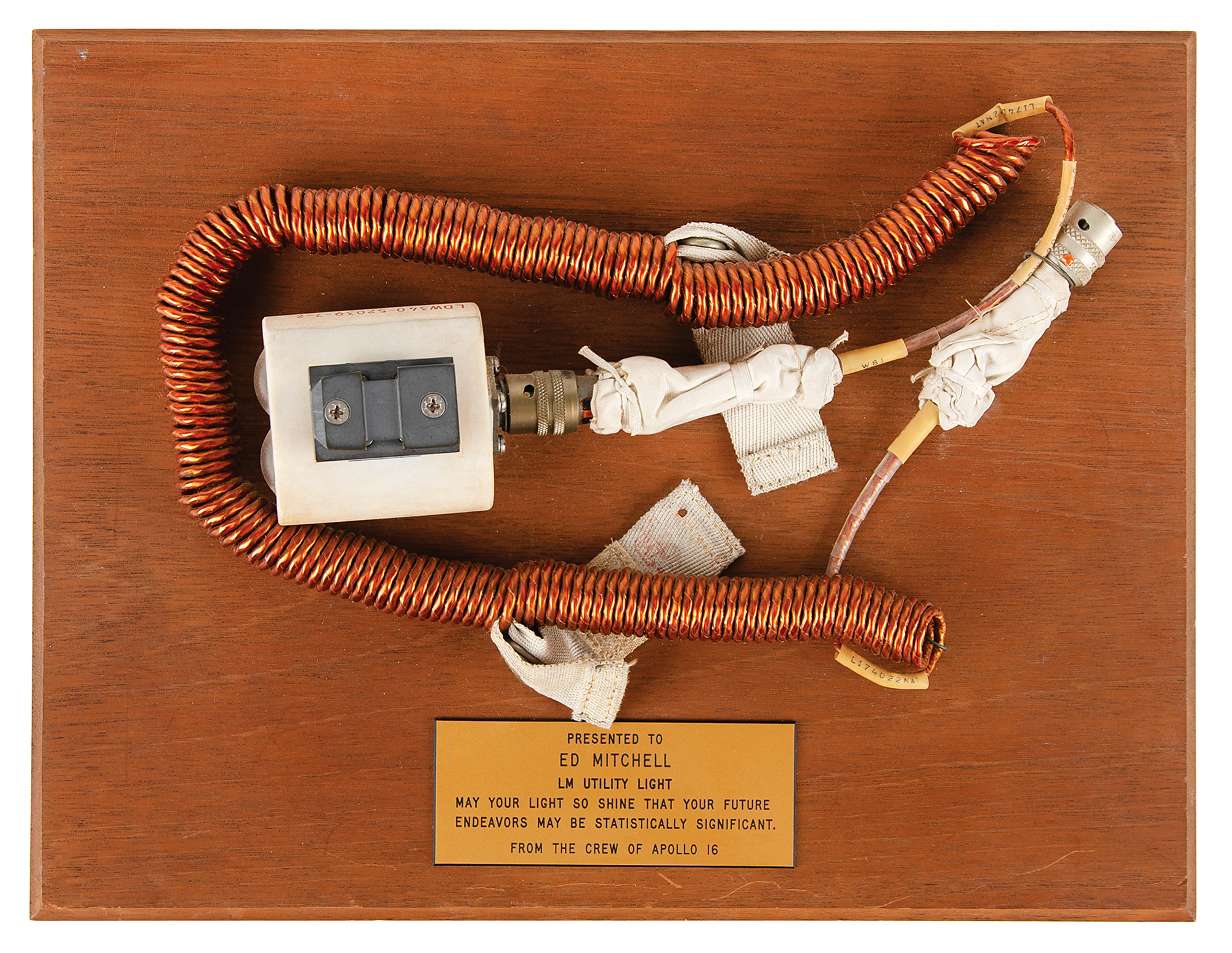 Apollo 16 Lunar Module Utility Light assembly presented to Edgar Mitchell by the Apollo 16 crew, complete with its coiled cord, Beta cloth covers, four-pin cannon power plug, and mounting bracket, affixed to a 13˝ x 10˝ wooden plaque, with engraved presentation plate: "Presented to Ed Mitchell, LM Utility Light, May your light so shine that your future endeavors may be statistically significant. From the Crew of Apollo 16." The light's housing is marked in red with part numbers, "LDW340-52039-7-2, LDW340-53053-3-7, S/N 0014."