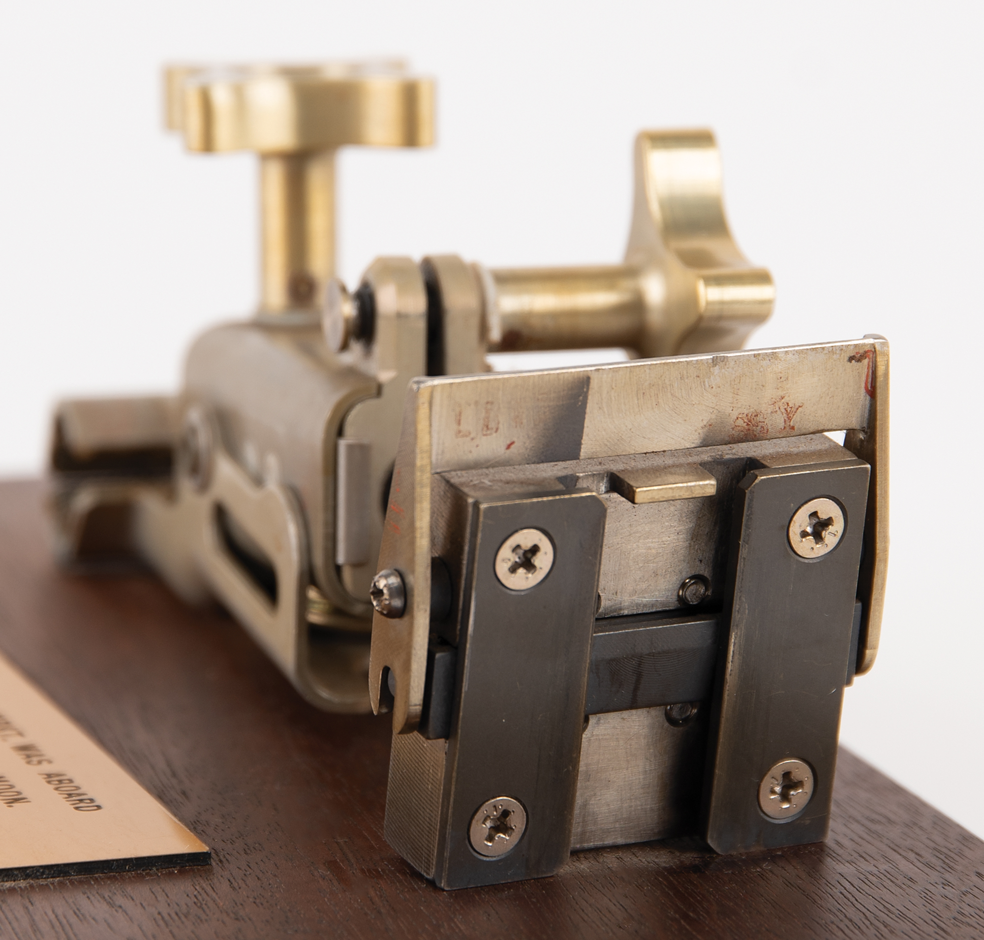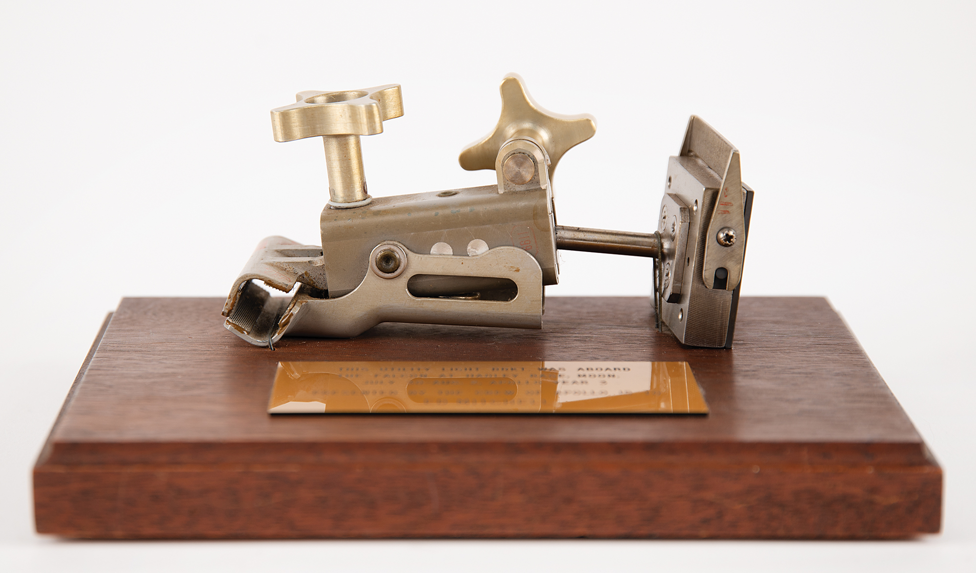 Apollo Lunar Module Utility Bracket Assembly flown to the lunar surface aboard the Apollo 15 LM 'Falcon,' presented to Edgar Mitchell by the Apollo 15 crew, affixed to an 8˝ x 6˝ wooden plaque, with engraved presentation plate: "This Utility Light Brkt. was Aboard the Falcon at Hadley Base, Moon. July 30–Aug. 2, Apollo Year 3, Presented by the Crew of Apollo 15 to Ed Mitchell." The clamp is stamped in red with part numbers, "LDW340-52040-1," with other markings and inspection stamps throughout the assembly. The assembly features two thumbscrews: one used to tighten or release the clamp jaws, and the other to adjust the relative orientation of the clamp and bracket. The bracket has a shoe-type plate that allows it to mate to either a Utility Light or the Data Acquisition Camera (DAC).