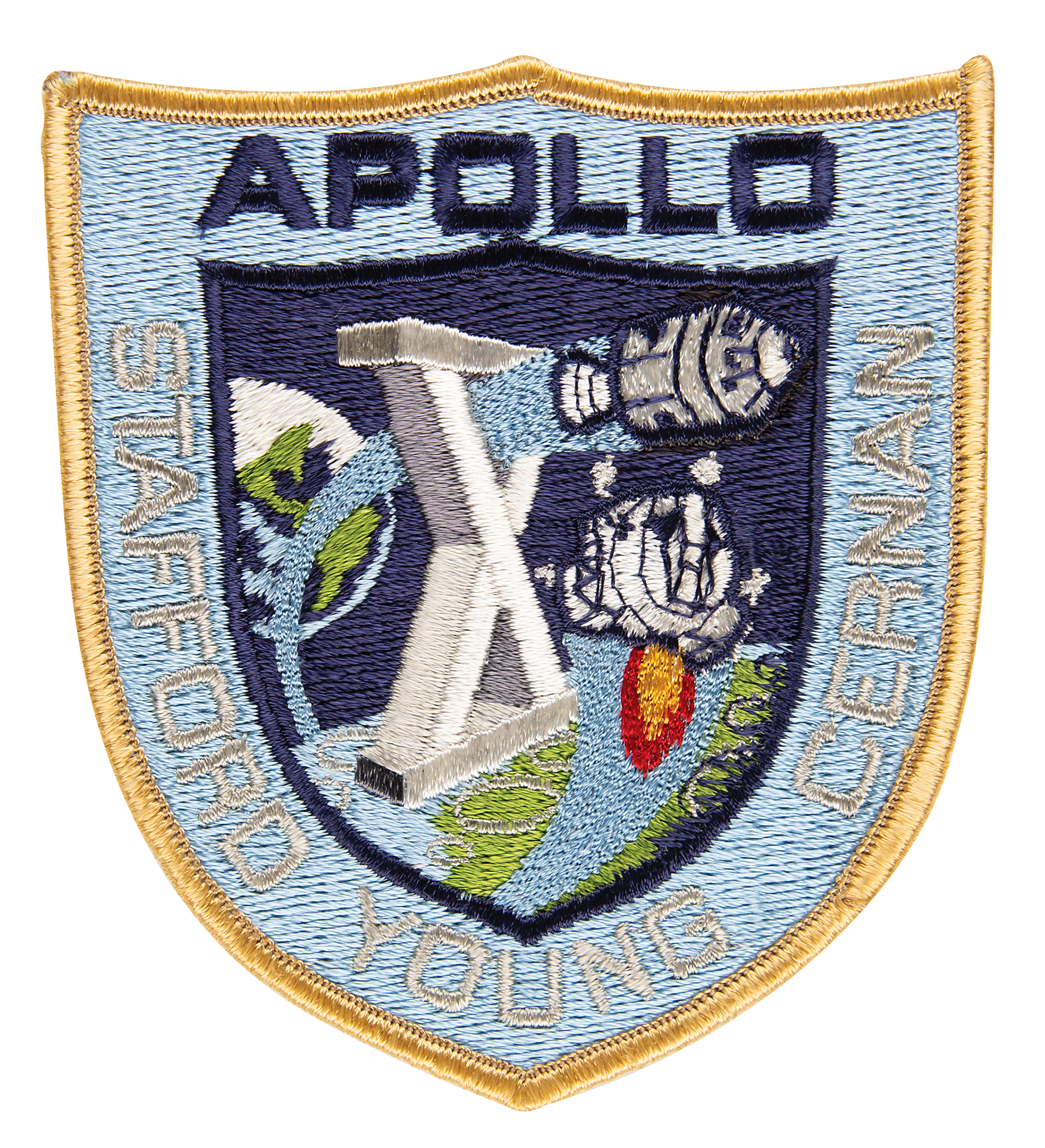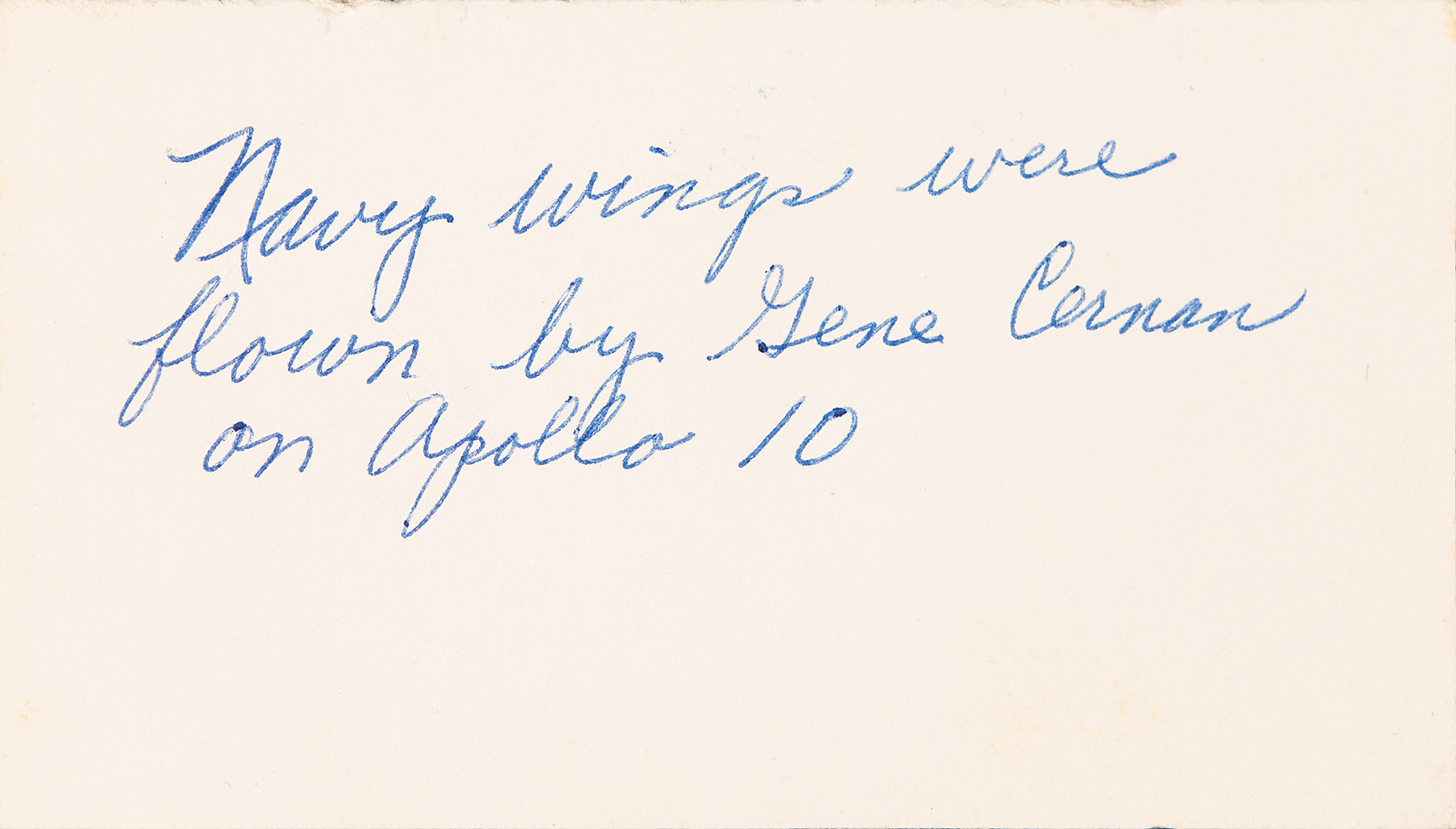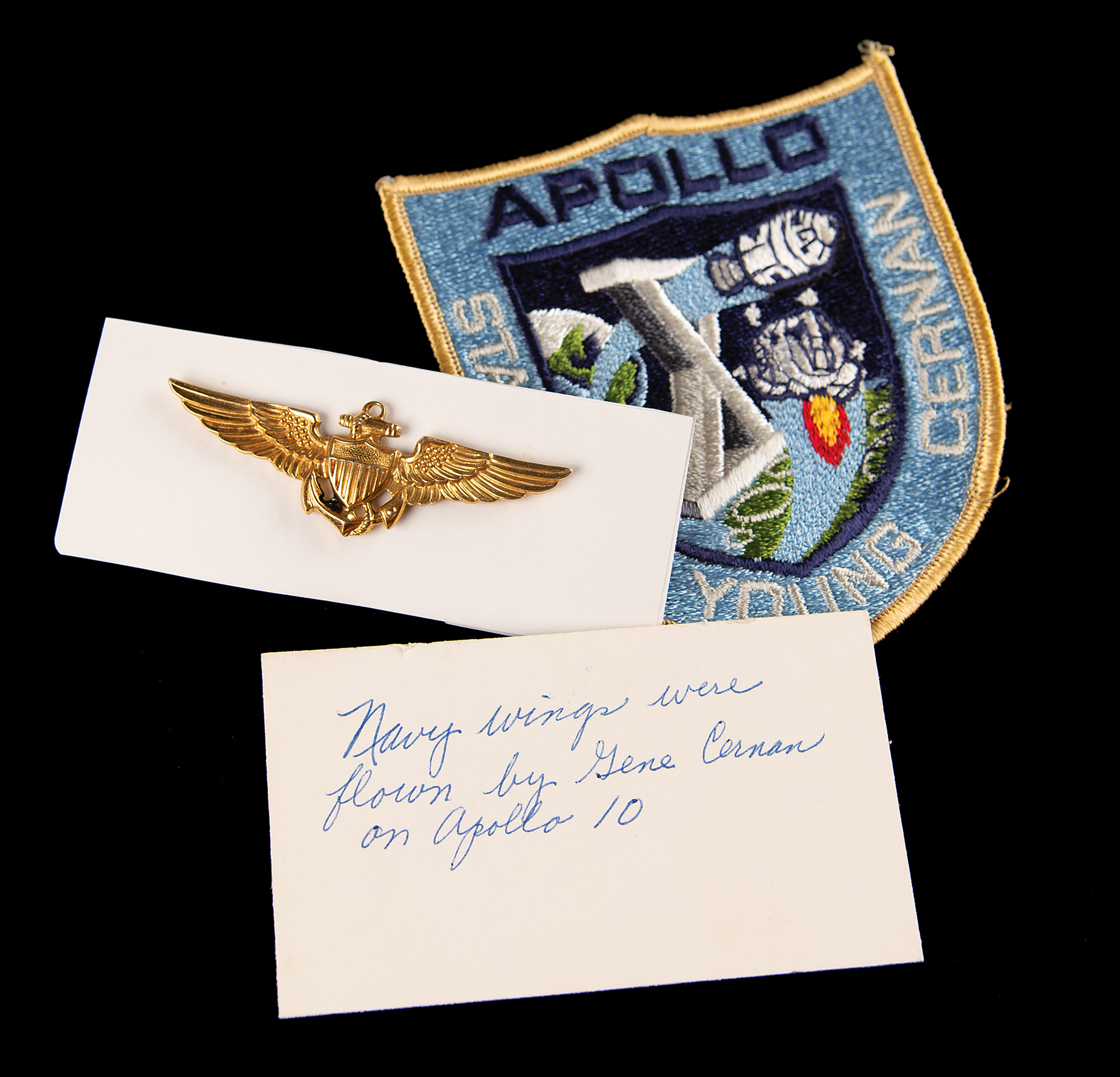 Flown gold naval aviator wings carried on Apollo 10 by LMP Gene Cernan for Edgar Mitchell, measuring approximately 2 3/4˝ by 7/8˝, as attested to by an accompanying annotated card: "Navy wings were flown by Gene Cernan on Apollo 10." The wings are marked on the reverse: "1/20 10K GF" and "USMC Ser. 298." Also includes a rare embroidered Apollo 10 'Post-Flight' crew patch, as worn by the crew on their post-flight jump suits at recovery; although examples of this patch design were flown on the mission, the flight status of this example is not known. In fine condition. Mitchell was designated as backup Lunar Module Pilot for Apollo 10. Both Mitchell and Cernan were naval aviators with degrees in aeronautical engineering from the U.S. Naval Postgraduate School.