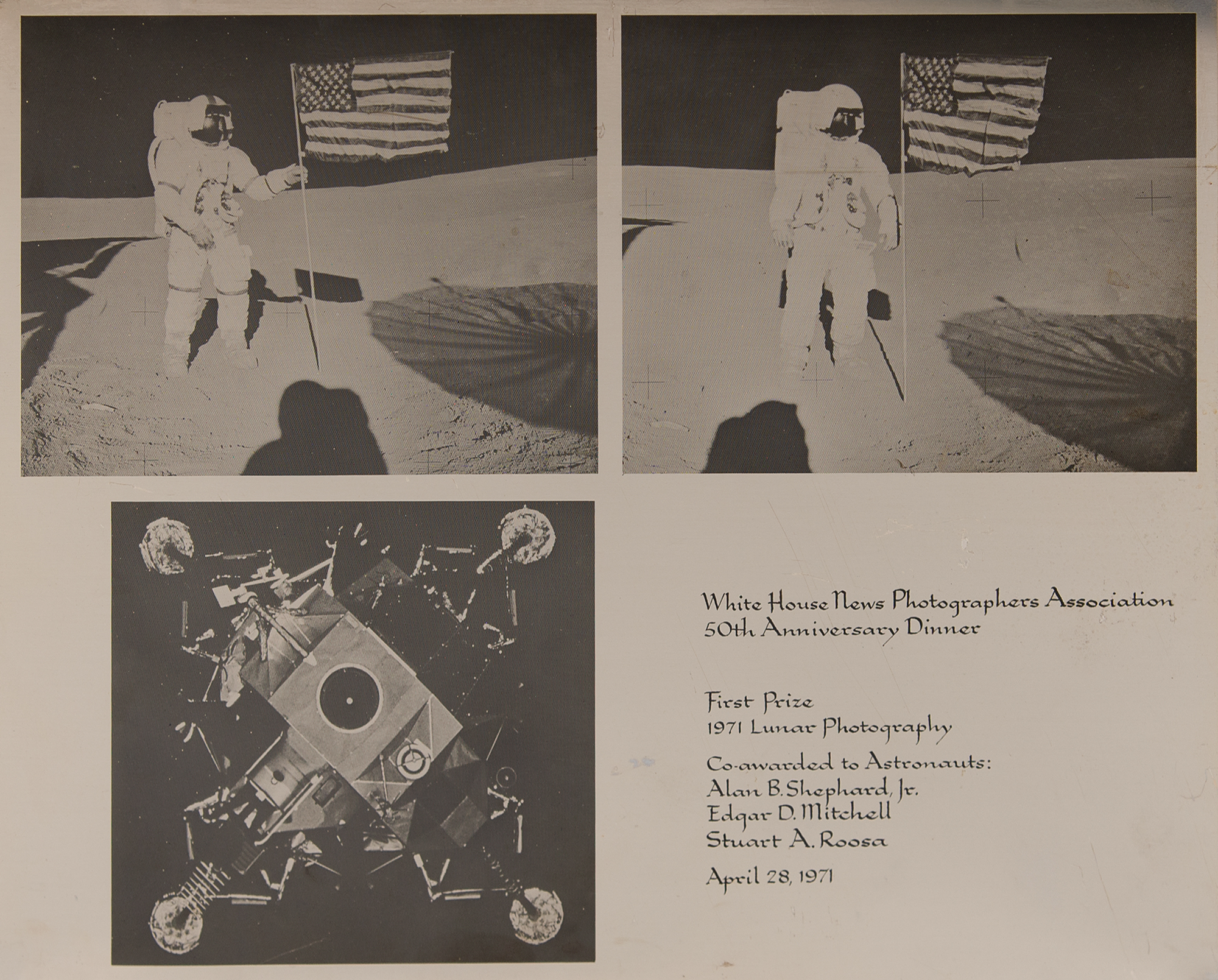 "First Prize, 1971 Lunar Photography, Co-awarded to Astronauts: Alan B. Shepard, Jr., Edgar D. Mitchell, Stuart A. Roosa"