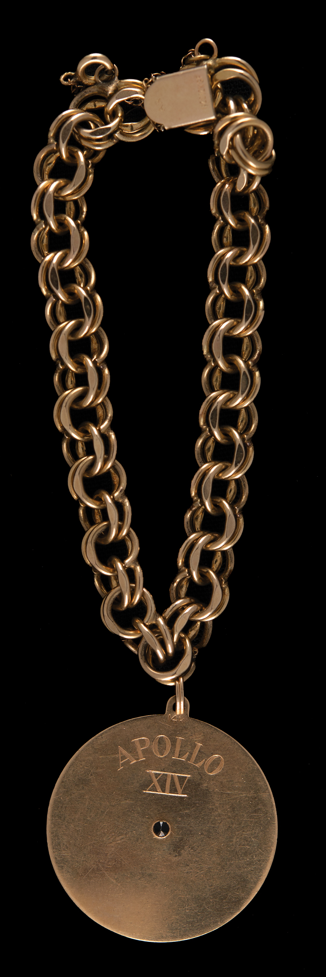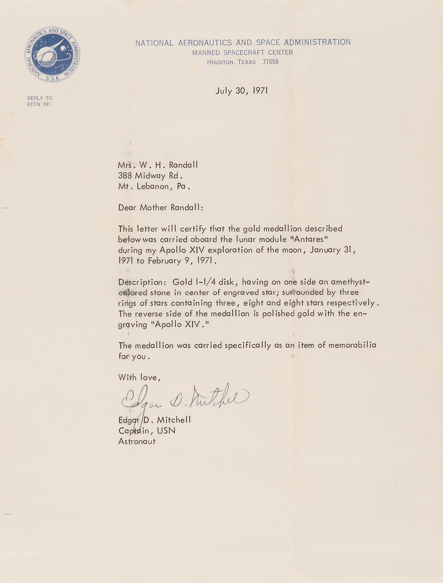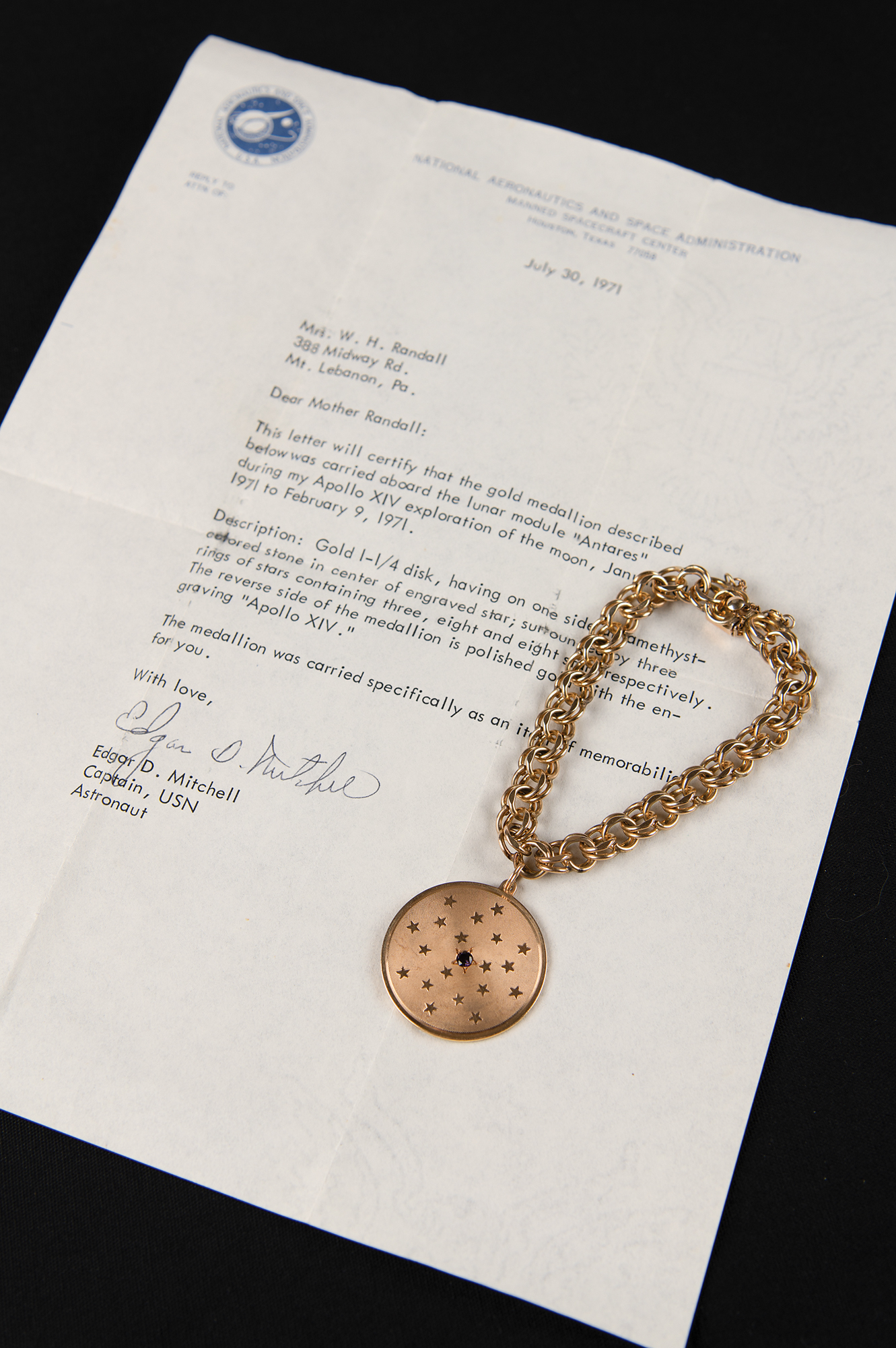 Appealing 14K gold pendant carried to the lunar surface on Apollo 14 by LMP Edgar Mitchell, measuring 1.25˝ in diameter, featuring an amethyst-colored stone at the center of an engraved star within a star field, engraved on the reverse, "Apollo 14," and hallmarked above, "14K." The pendant is attached to a double-ringed charm bracelet marked on the clasp: "1/20 12K GF." Mitchell presented the flown pendant to his mother-in-law shortly after the flight, and describes the flown pendant in an included TLS, signed "Edgar D. Mitchell," one page, 8 x 10.5, NASA letterhead, July 30, 1971, addressed to "Mother Randall," in part: "This letter will certify that the gold medallion described below was carried aboard the lunar module 'Antares' during my Apollo XIV exploration of the moon, January 31, 1971 to February 9, 1971…The medallion was carried specifically as an item of memorabilia for you." In overall fine condition, with intersecting folds to the letter.