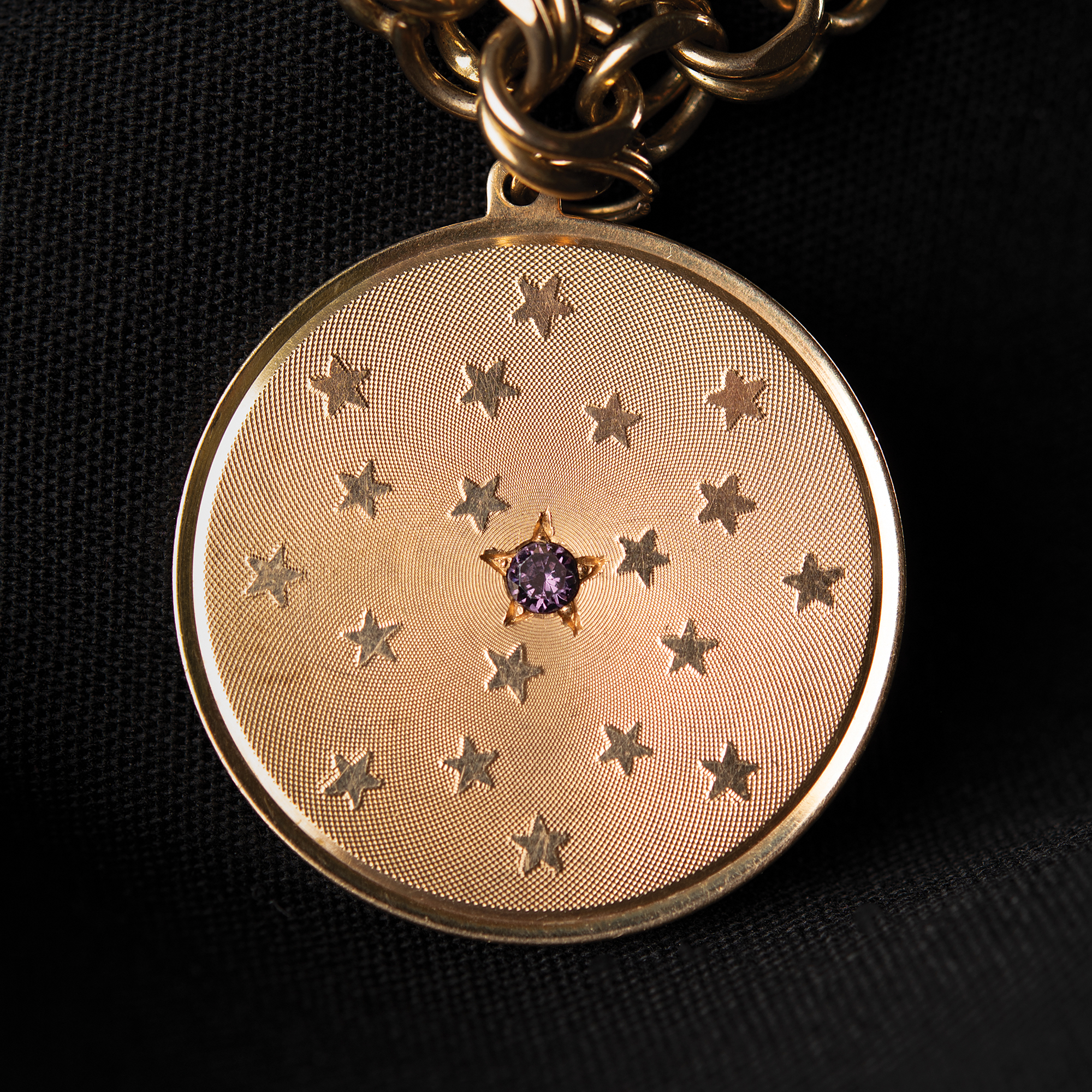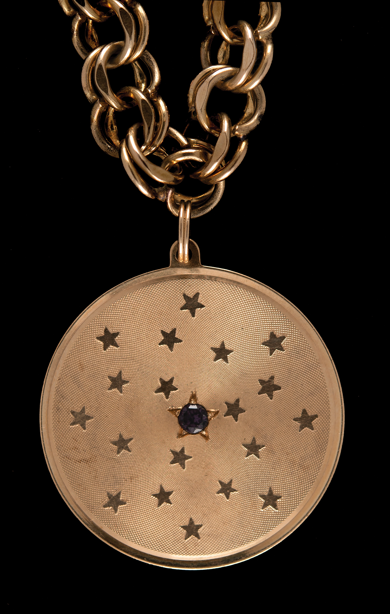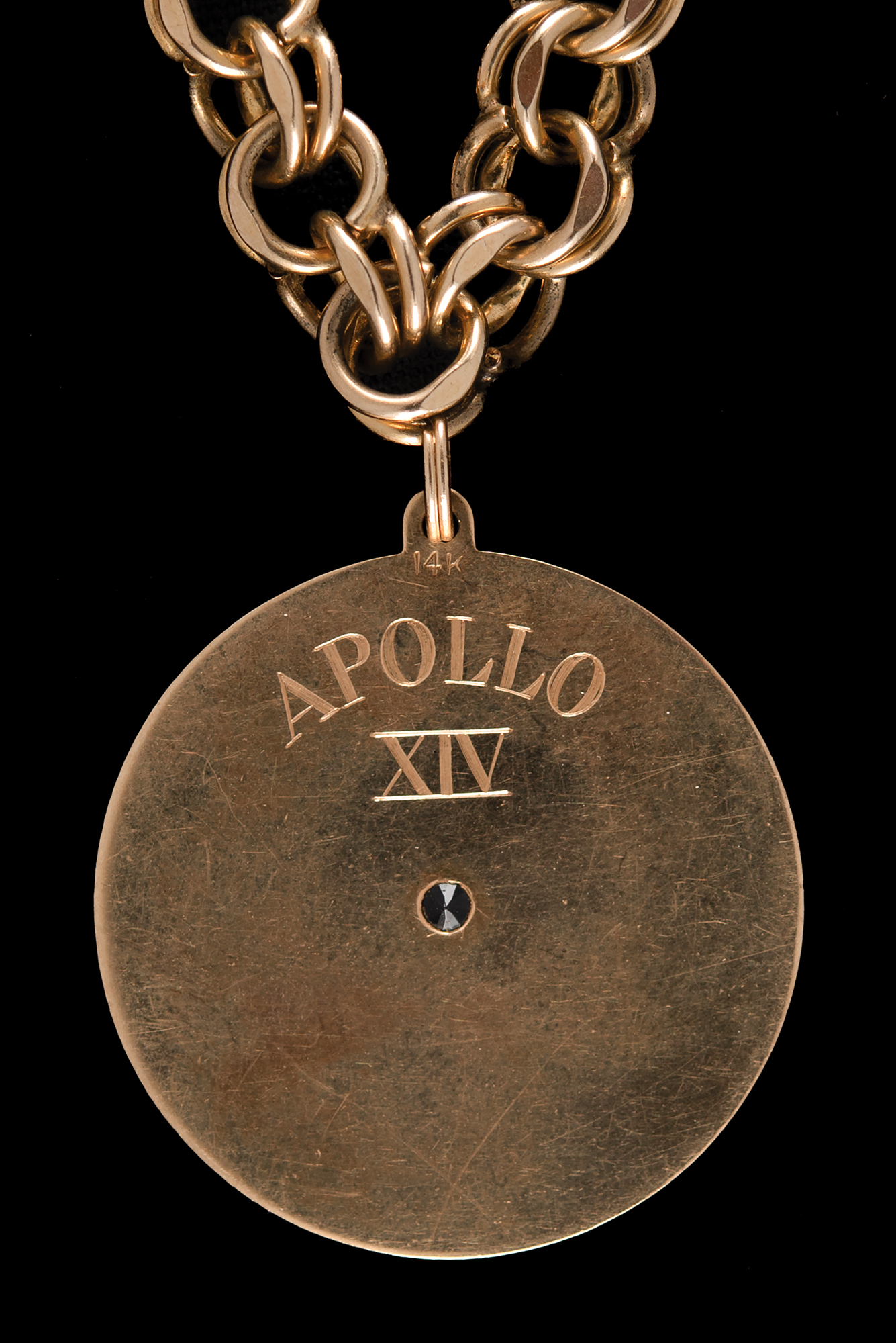 Appealing 14K gold pendant carried to the lunar surface on Apollo 14 by LMP Edgar Mitchell, measuring 1.25˝ in diameter, featuring an amethyst-colored stone at the center of an engraved star within a star field, engraved on the reverse, "Apollo 14," and hallmarked above, "14K." The pendant is attached to a double-ringed charm bracelet marked on the clasp: "1/20 12K GF." Mitchell presented the flown pendant to his mother-in-law shortly after the flight, and describes the flown pendant in an included TLS, signed "Edgar D. Mitchell," one page, 8 x 10.5, NASA letterhead, July 30, 1971, addressed to "Mother Randall," in part: "This letter will certify that the gold medallion described below was carried aboard the lunar module 'Antares' during my Apollo XIV exploration of the moon, January 31, 1971 to February 9, 1971…The medallion was carried specifically as an item of memorabilia for you." In overall fine condition, with intersecting folds to the letter.