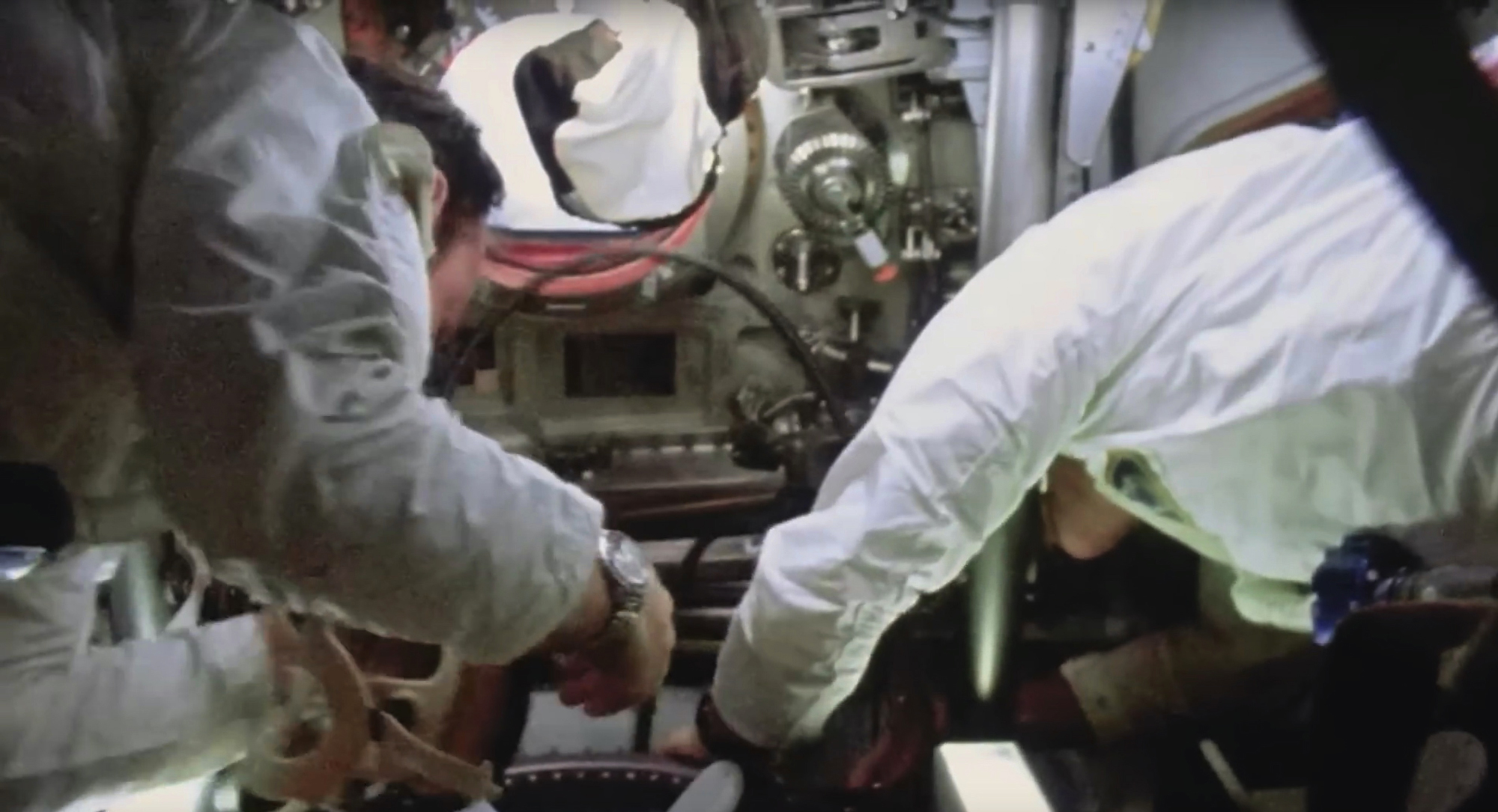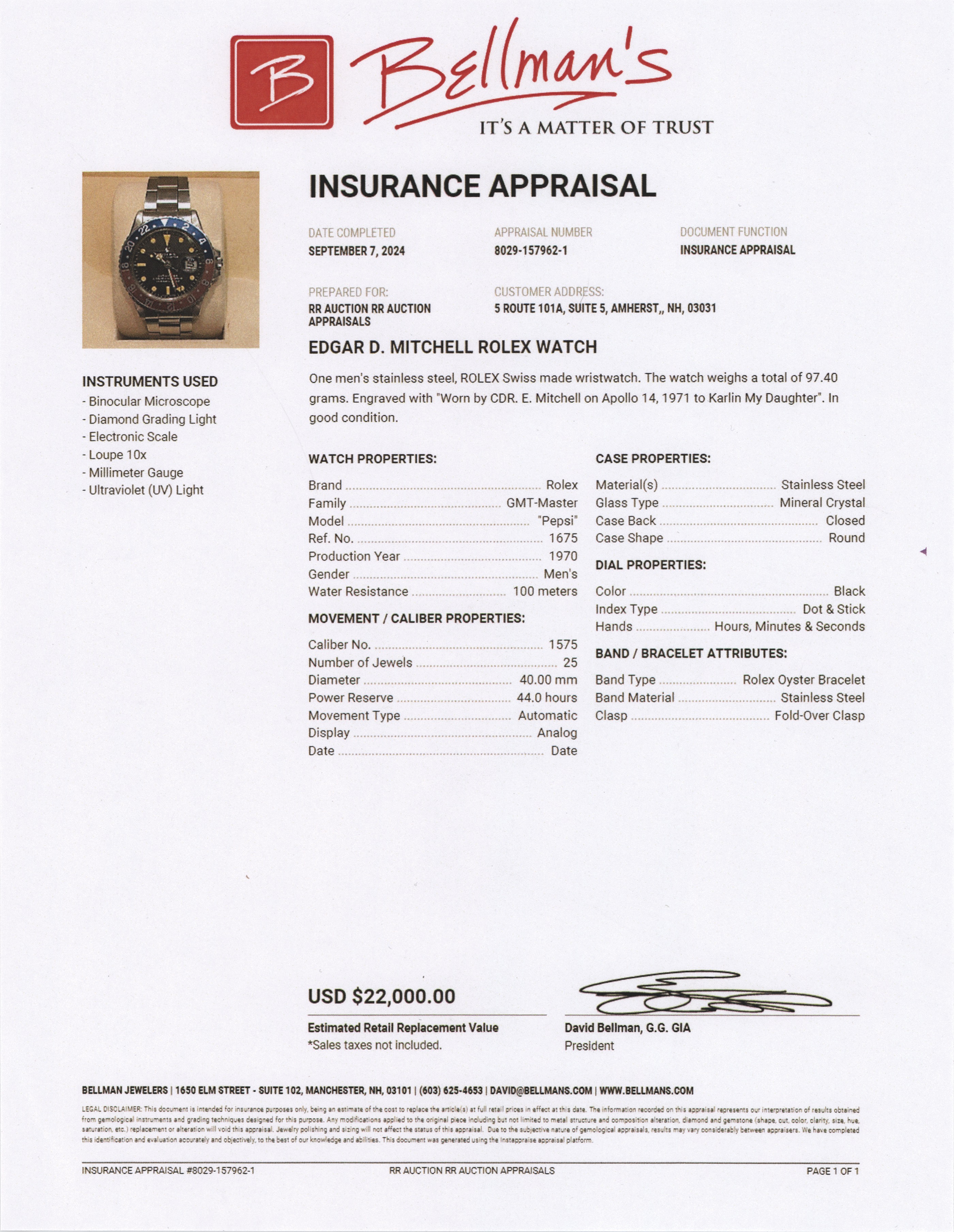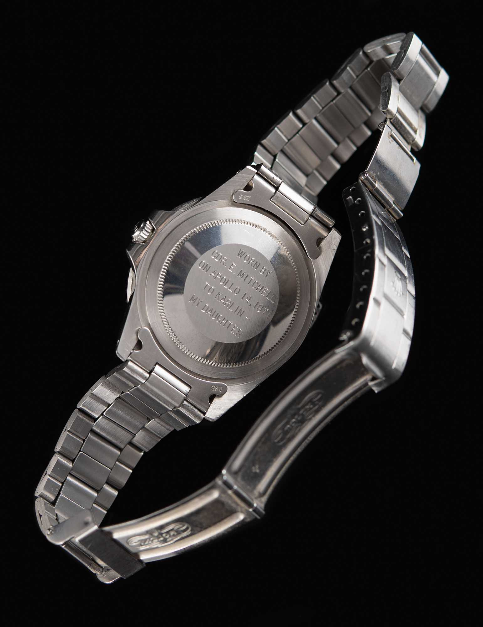 Edgar Mitchell's flown Rolex GMT-Master chronometer watch (Reference #1675) worn on the Apollo 14 mission, serial no. 2448767, as seen in film footage of Mitchell suiting up prior to flight and in onboard footage taken inside the Command Module. The caseback is engraved, "Worn by Cdr. E. Mitchell on Apollo 14, 1971, To Karlin?My Daughter." It features a 26-jewel Oyster Perpetual Movement, black dial, blue-and-red bezel with 24-hour scale (nicknamed the 'Pepsi' color scheme), date indicator with famous Rolex 'Cyclops' magnifying bubble in the acrylic crystal, and Rolex Steelinox bracelet with fliplock clasp.