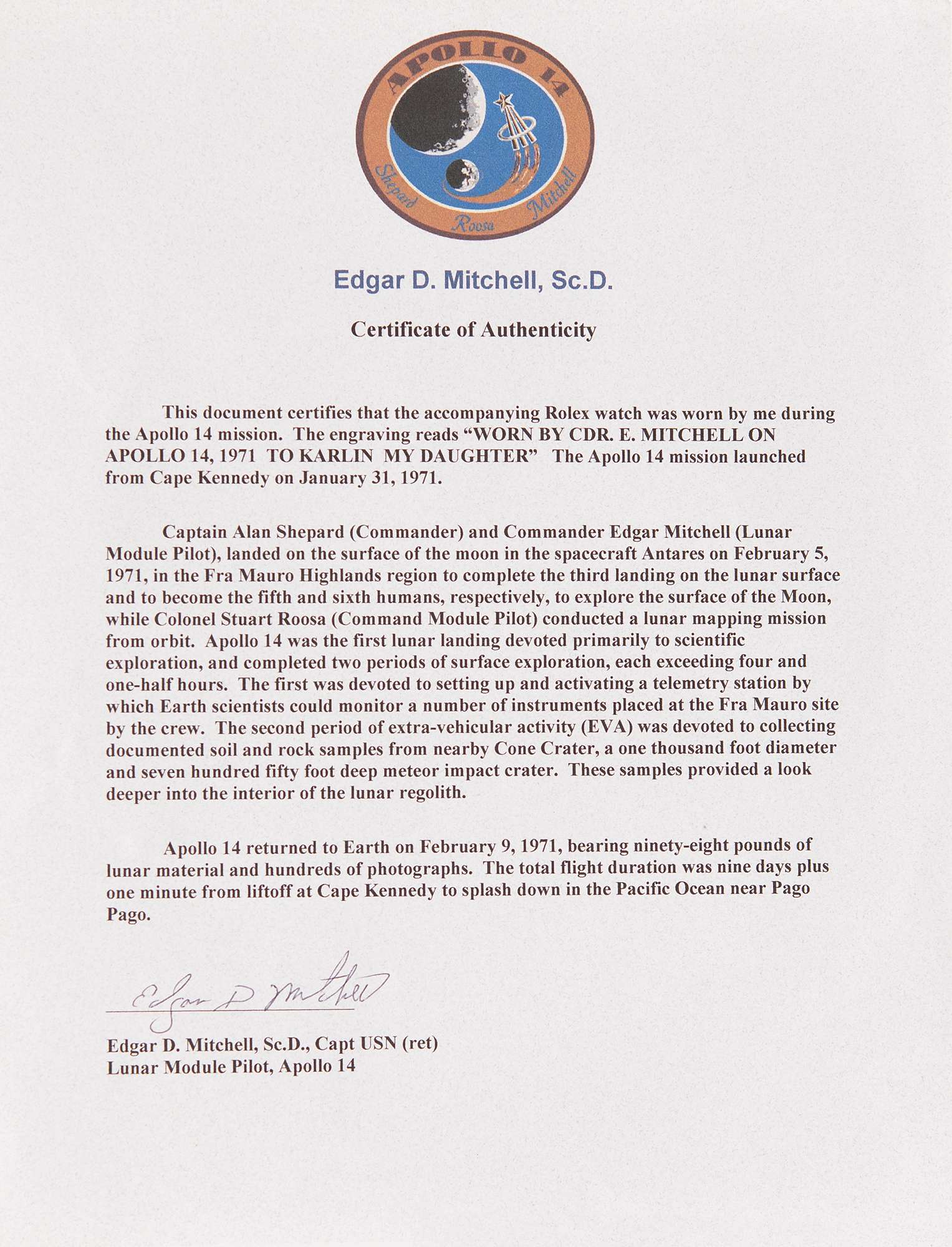 The bezel rotates so that the local time zone and Greenwich Mean Time may be simultaneously represented, a system developed thanks to the age of flight?Rolex collaborated with Pan American World Airways to devise the scheme, so that their long-haul pilots could keep track of both local time and GMT, which was used for all aviation flight planning. In fine cosmetic condition, with light scratches and wear from use; the watch's function is untested. Accompanied by a certificate of authenticity signed by Mitchell, certifying that "the accompanying Rolex watch was worn by me during the Apollo 14 mission."
