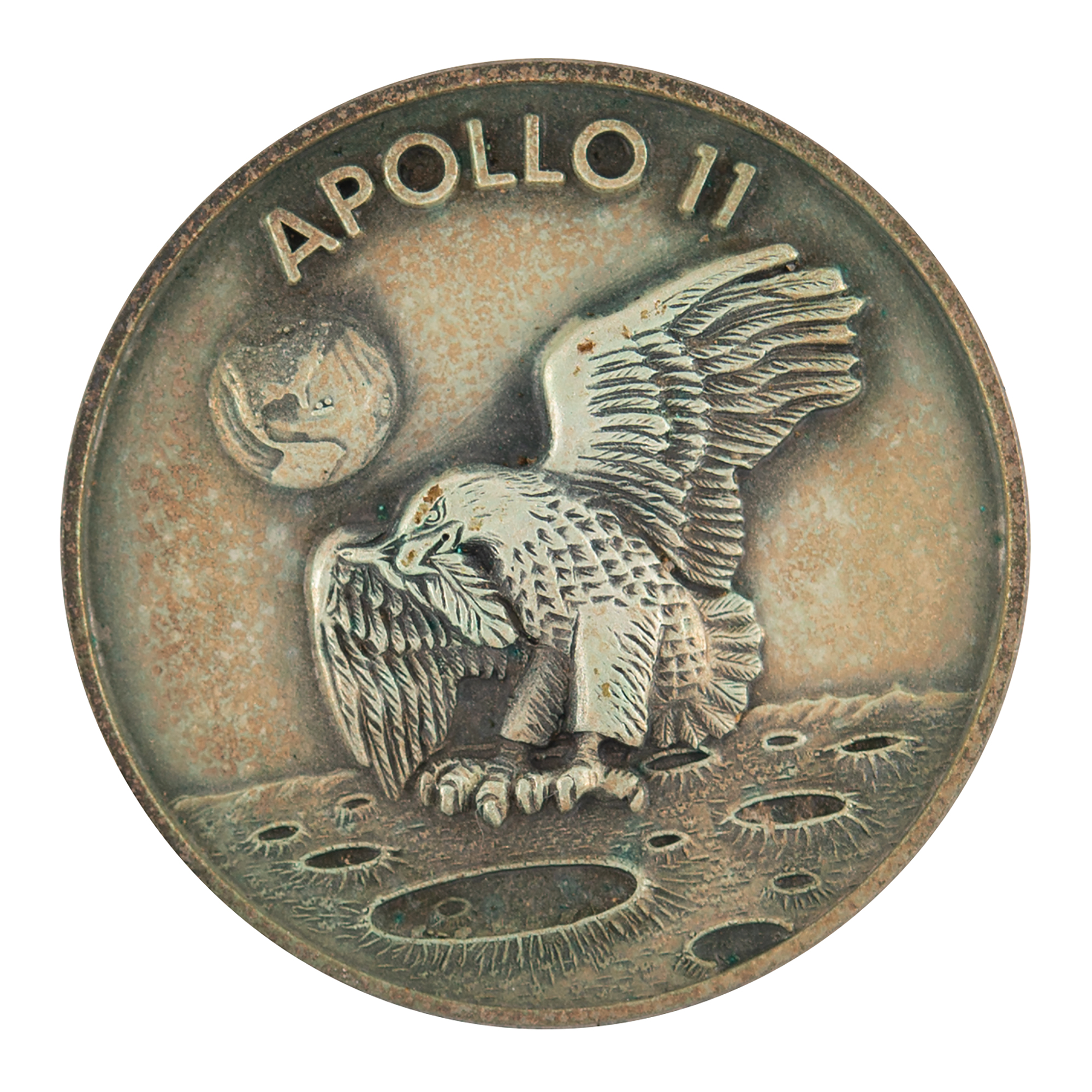 Edgar Mitchell's historic flown sterling silver Apollo 11 Robbins Medallion, approximately 1.25˝ in diameter, with a raised design of the iconic Apollo 11 mission insignia on the face—a bald eagle landing on the cratered lunar surface, clutching olive branches of peace in its talons, with Earth above in the distance. The reverse is encircled by the last names of astronauts Neil Armstrong, Buzz Aldrin, and Michael Collins, and engraved with the launch date ("July 16, 1969"), moon landing date ("July 20, 1969"), and return date ("July 24, 1969"). The medallion is serial numbered "413” and includes its original matching case. Condition is mint state, with minor tarnishing. A fantastic example of this highly sought Robbins medallion, originating from the collection of a moonwalker.