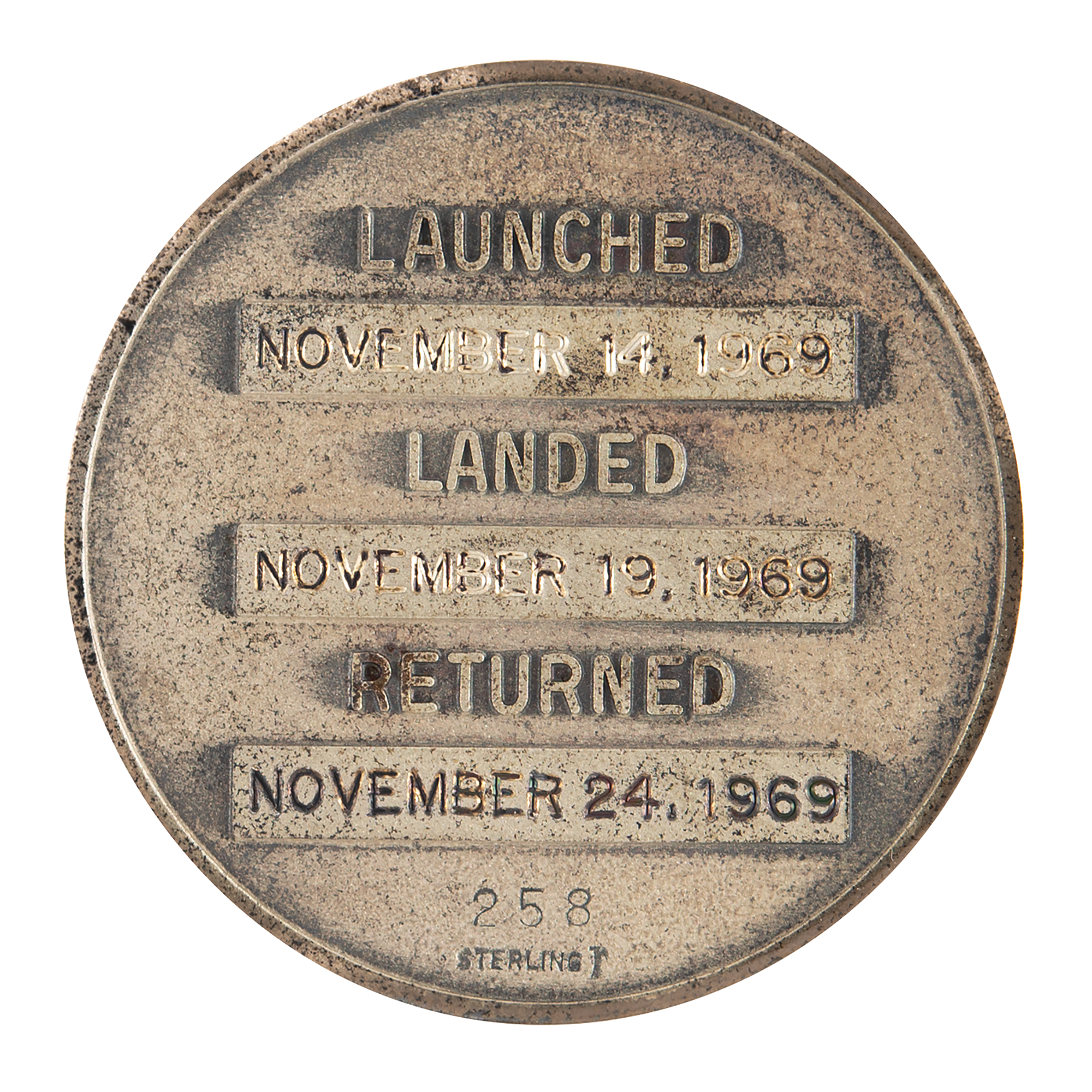 Edgar Mitchell’s sterling silver Apollo 12 Robbins medallion, approximately 1.25˝ in diameter, with a raised design of the Apollo 12 mission insignia on the face—a 'Yankee Clipper' ship sailing over the moon's 'Ocean of Storms,' the location of the Apollo 12 landing site. The reverse is engraved with the launch date of November 14, 1969; moon landing date of November 19, 1969; and return date of November 24, 1969. The medal is serial numbered "258" and stamped below with the Robbins "Sterling" hallmark. Condition is mint state, with minimal tarnishing. Includes its original matching case, which is cracked at the lid and hinge.
