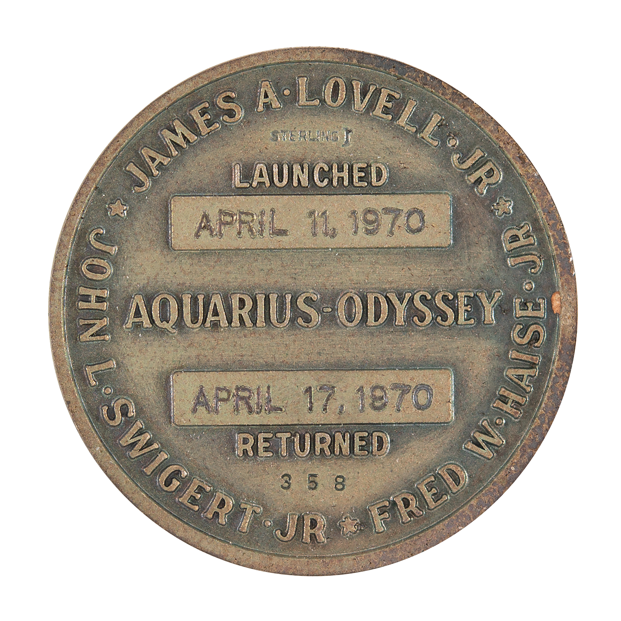 Edgar Mitchell's flown sterling silver Apollo 13 Robbins medallion, approximately 1.25″ in diameter, featuring a raised design of the Apollo 13 mission insignia on the face—three horses driving Apollo's chariot across the surface of the moon. The reverse boasts the names of the crew as flown, and is engraved with the launch date of April 11, 1970, and the return date of April 17, 1970. The medal is serial numbered "358" and stamped above with the Robbins "Sterling" hallmark. Condition is mint state, with a couple tiny spots of tarnishing.