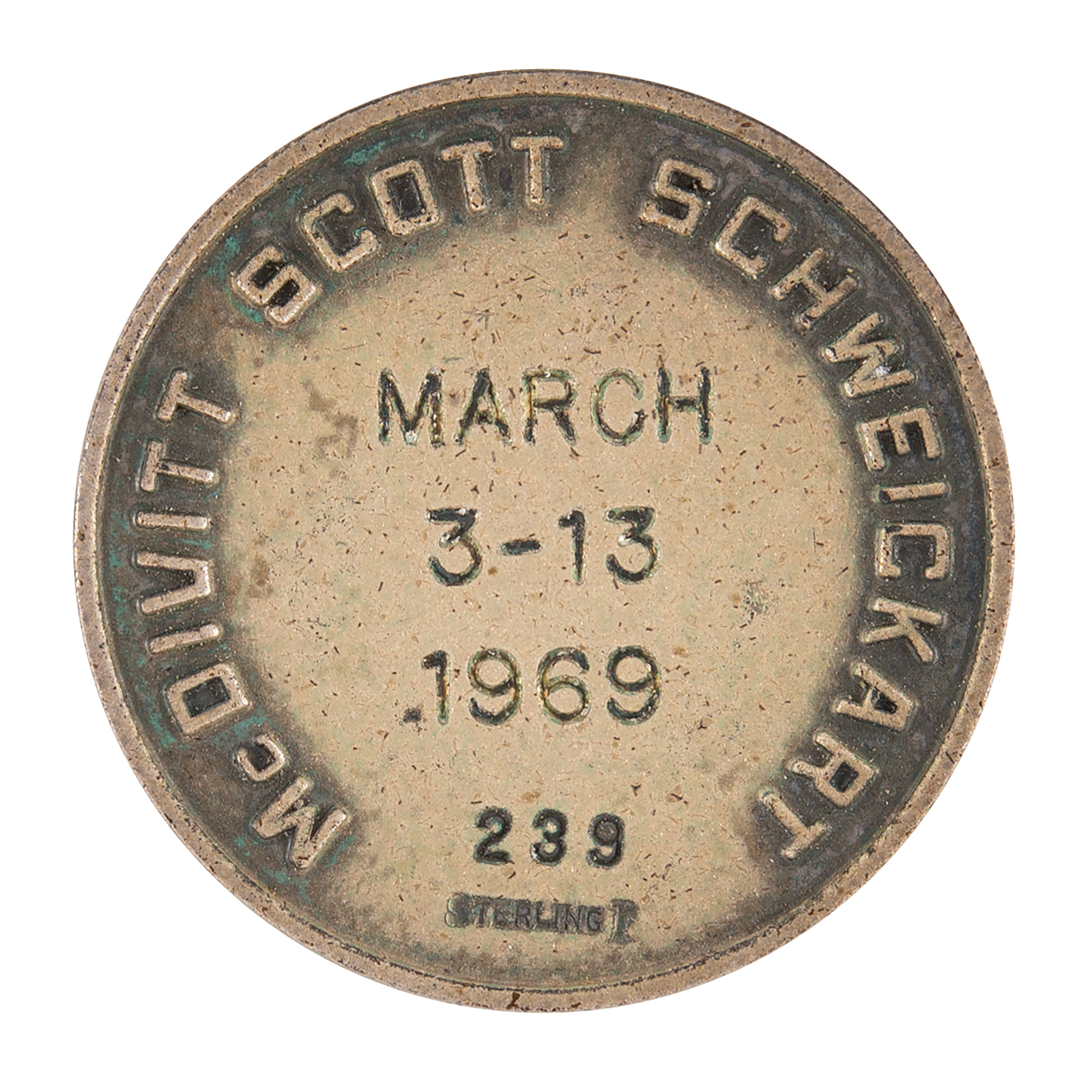 Flown sterling silver Apollo 9 Robbins medallion, approximately 1˝ in diameter, with a raised design of the mission insignia on the face—the orbiting CM and LM with Saturn V launch vehicle, and mission number "IX" at center. The reverse is engraved with the mission dates, "March 3–13, 1969," and encircled by the surnames of the astronauts in raised text: "McDivitt, Scott, Schweickart." The medal is serial numbered "239" and stamped below with the Robbins "Sterling" hallmark. Condition is mint state, with subtle tarnishing. Includes its original matching case. Selected as an astronaut as part of Group 5 in 1966, Mitchell's first assignment in the Apollo program was as part of the support crew for Apollo 9.