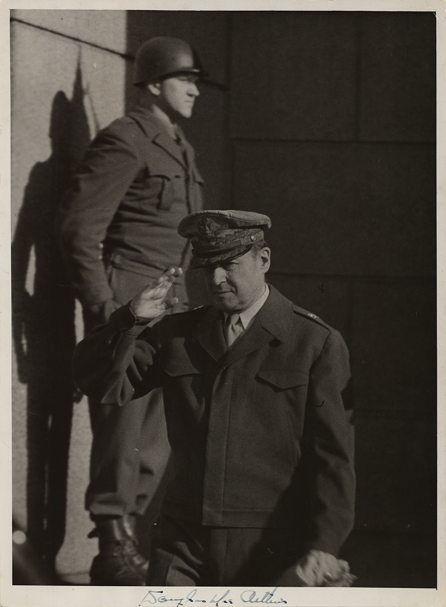 Uncommon vintage glossy 8 x 11 photo of General Douglas MacArthur giving a salute, signed in the lower border in fountain pen, "Douglas MacArthur." Annotated on the reverse in an unknown hand, "Tokyo, Japan - 1946." In very good to fine condition, with scattered light creasing and some rubbing to the emulsion. After WWII, MacArthur's headquarters were located in Tokyo, where he helped Japan rebuild itself following the devastation of war; overseeing this redevelopment, MacArthur was effectively the interim leader of Japan from 1945 until 1948. A desirable, unusual pose of the celebrated general from an important period in world history.