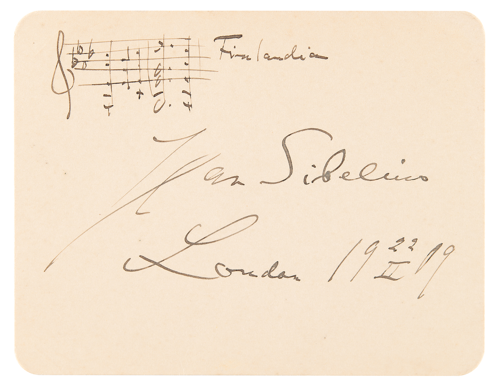 Coveted AMQS on an off-white 4.5 x 3.5 card, signed below in black ink, “Jean Sibelius, London, 22 II 1919,” who above adds a few bars of music from his adored 1899 tone poem “Finlandia.” In very fine condition. An impressive autograph from the great Finnish composer, rare in this format.