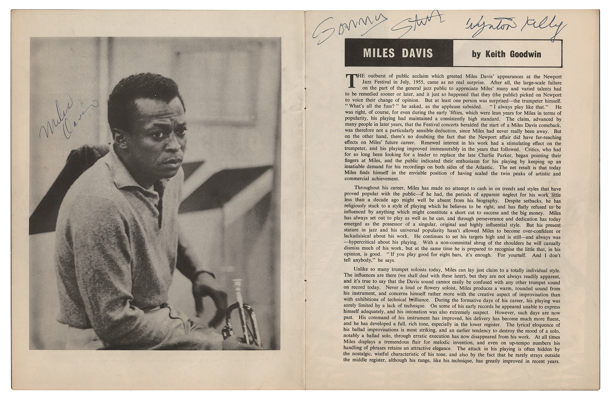 Program from the Miles Davis Quintet's 1960 UK Tour, 16 pages, 8.25 x 10.5, signed inside on his image in ballpoint by Miles Davis, and on the adjacent page by Sonny Stitt and Wynton Kelly. In fine condition.