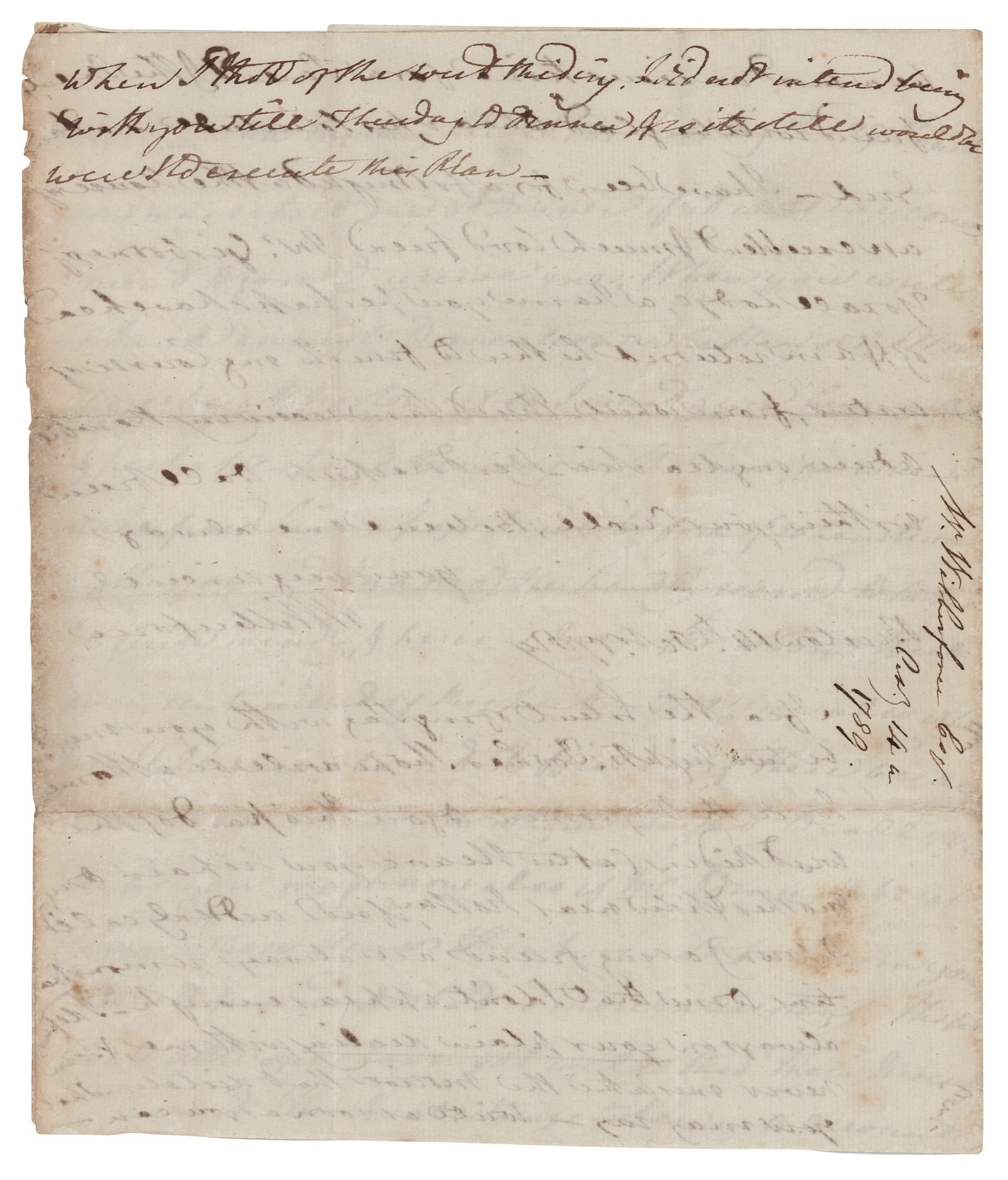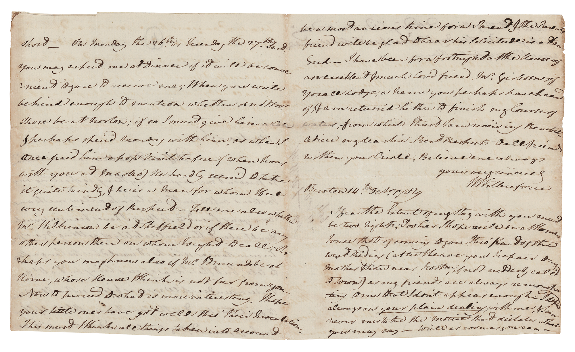 British politician, evangelist, and philanthropist (1759-1833) who played an important role in the movement to abolish slavery. ALS signed “W. Wilberforce,” four pages on two adjoining sheets, 7.75 x 9.25, October 14, 1789. Handwritten letter to an unknown recipient, in part: “Different matters have intervened to prevent my saying anything respecting my motions sufficiently certain to allow me to answer your friendly letter; I have been in much doubt about the practicability of getting to you from circumstances which it would be too long a story to tell, but the idea of our being but about 20 miles asunder still recurs & does not allow me to quit this part of the country with’t fulfilling my engagement: my visit must of necessity be short—on Monday the 26th or Tuesday the 27th Inst. you may expect me at dinner if it will be convenient to you to receive me. When you write be kind enough to mention whether or not Mr. Shore will be at Norton; if so, I must give him a call and perhaps spend Monday with him, as when I once paid him a…visit before (when I was with you and Mastro). He hardly seemed to take it quite kindly and he is a man for whom I feel every sentiment of respect—Tell me also whether Mr. Wilkinson be at Sheffield or if there be any other person there on whom I ought to call. Perhaps you may know also if Mr. Edmunds be at home, whose house I think is not far from you. Now to proceed to what is more interesting. I hope your little ones have got well thro' their inoculation. This must, I think, all things taken into account, be a most anxious time for a parent, and the parents’ friend will be glad to hear his solicitude…I have been for a fortnight at the house of an excellent and much loved friend, Mr. Gisborne of Yorace Lodge, a name you perhaps have heard of. I am returned either to finish my course of waters, from which I trust I am receiving beneficial advice. My dear sir, best respects to all friends within your circle.” Wilberforce adds a lengthy postscript that continues onto the reverse of the second integral page. In fine condition, with some light edge toning.