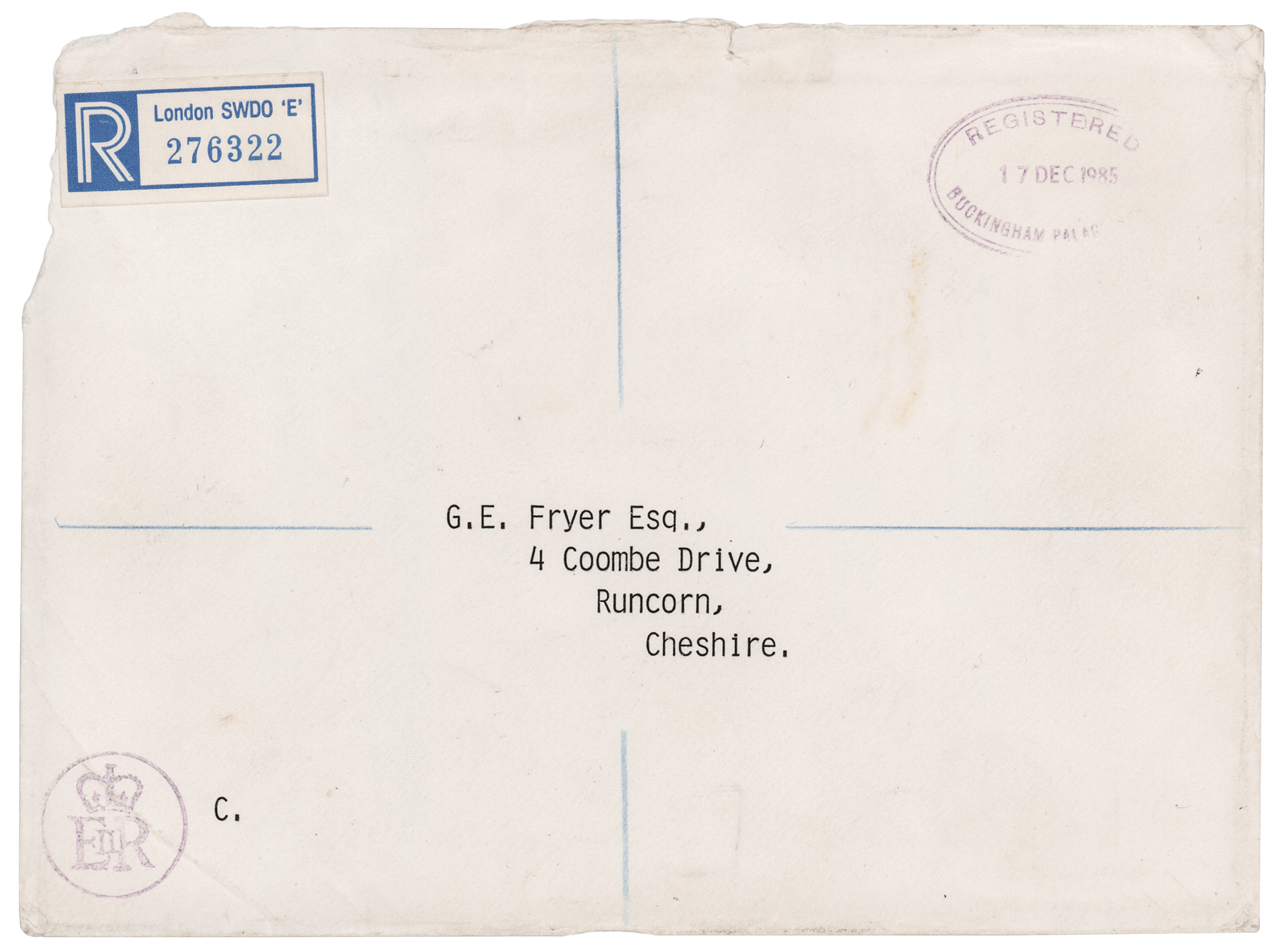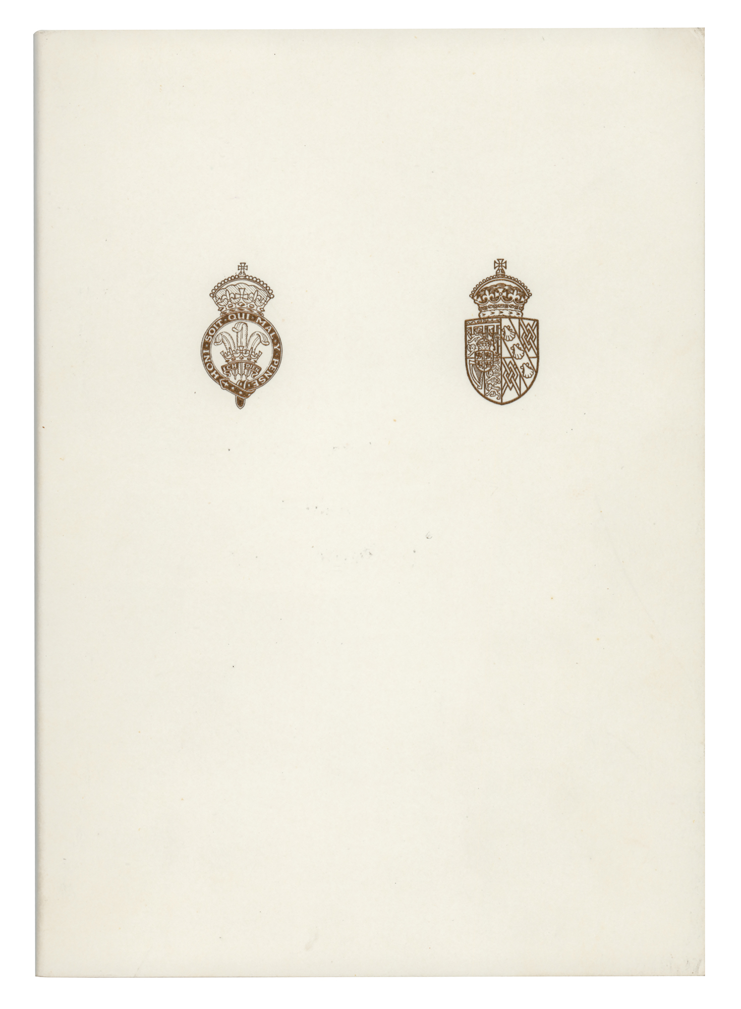Desirable Christmas card from 1985, embossed on the front with the Prince of Wales’s feathers and Order of the Garter motto and the Spencer family arms, measuring 10.25 x 7.25 open, featuring an affixed color portrait of the royal family with Prince Harry and Prince William riding a pony, signed and inscribed inside in fountain pen, "Mr. Fryer, from Charles and" and "Diana." In very fine condition. Accompanied by the original mailing envelope.