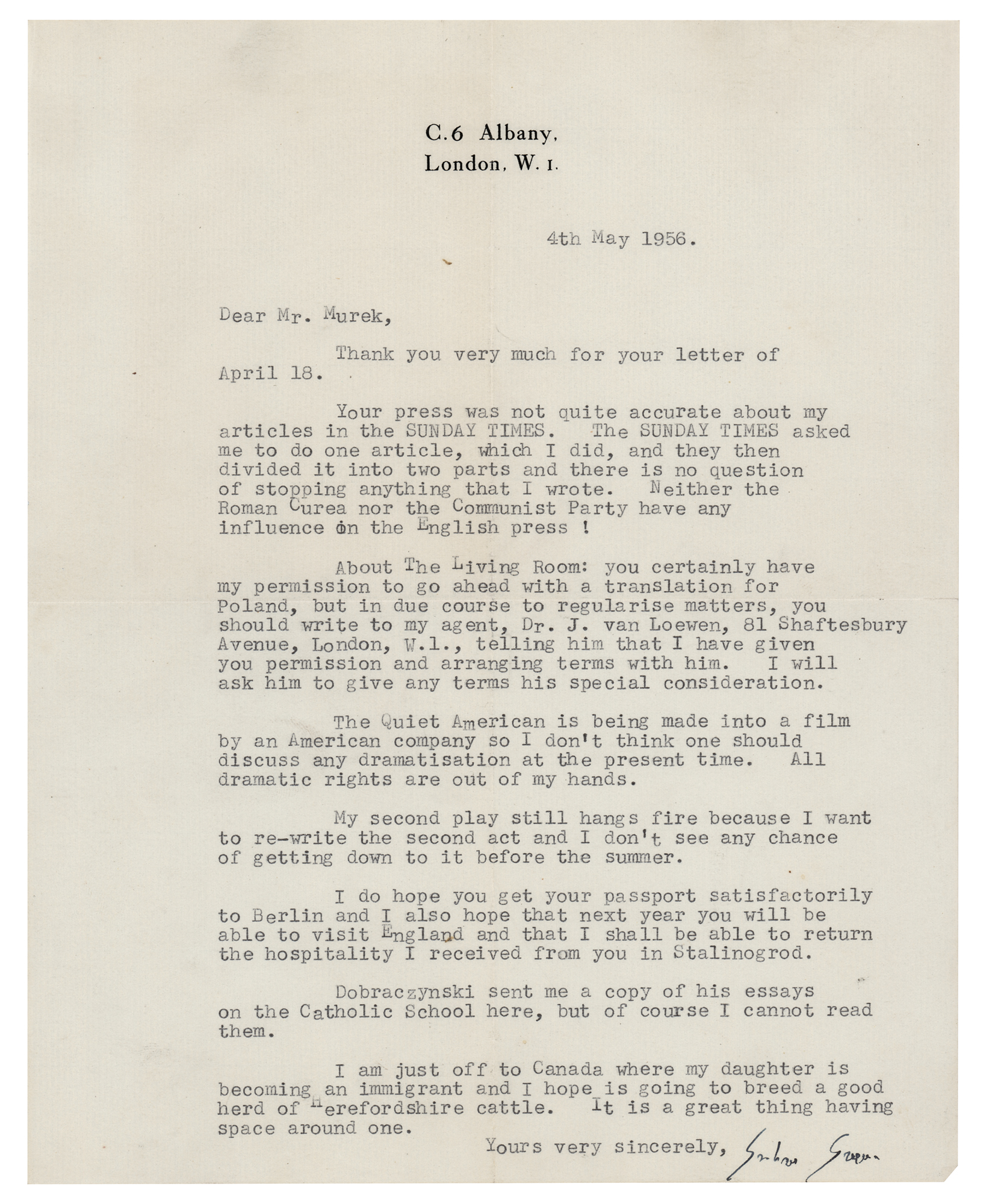 TLS, one page, 8 x 10, May 4, 1956. Letter to publisher Tadeusz Murek, in full: “Thank you very much for your letter of April 18. Your press was not quite accurate about my articles in the SUNDAY TIMES. The SUNDAY TIMES asked me to do one article, which I did, and they then divided it into two parts and there is no question of stopping anything that I wrote. Neither the Roman Curea nor the Communist Party have any influence on the English press!