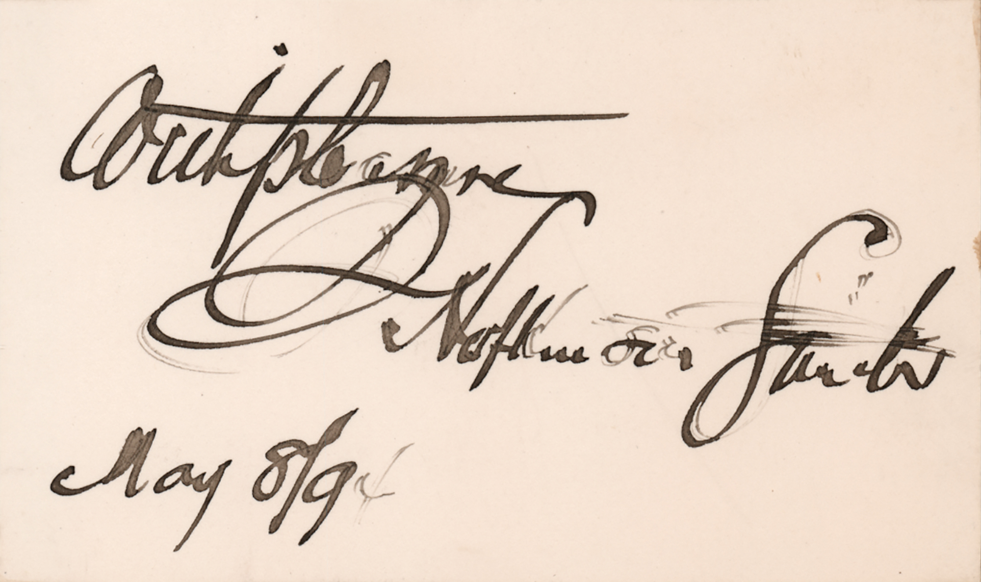 American author, artist, and engineer (1838–1915) who built the foundation for the Statue of Liberty, illustrated and published numerous travelogues, and received awards for his paintings. Ink signature, "With pleasure, F. Hopkinson Smith, May 8/94,” on an off-white 3.5 x 2 card. In fine condition, with a bit of brushing and irregular ink adhesion to the signature.