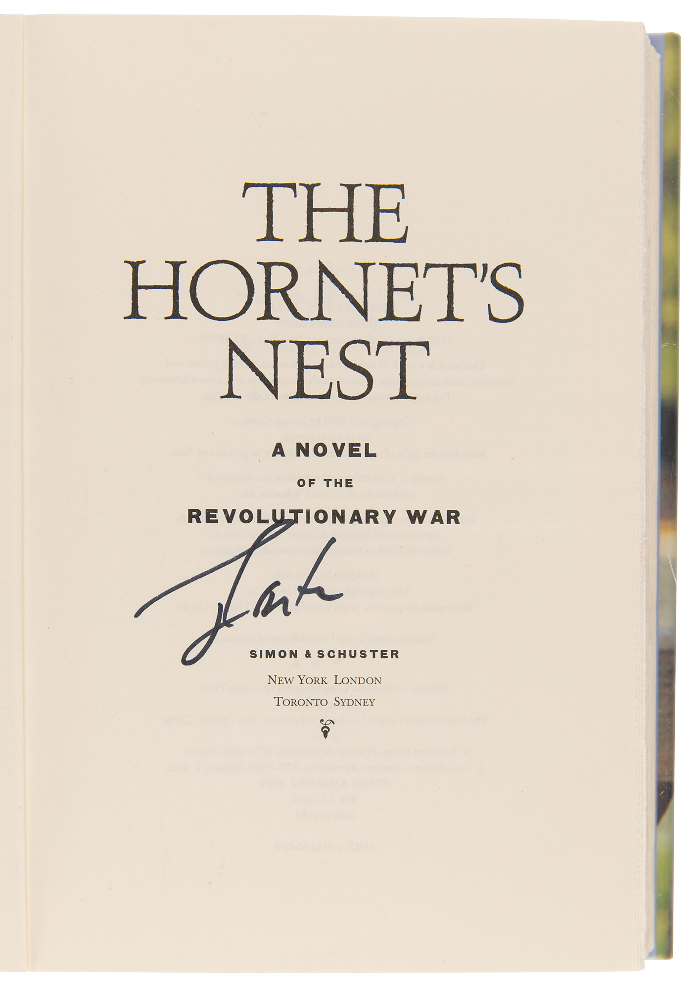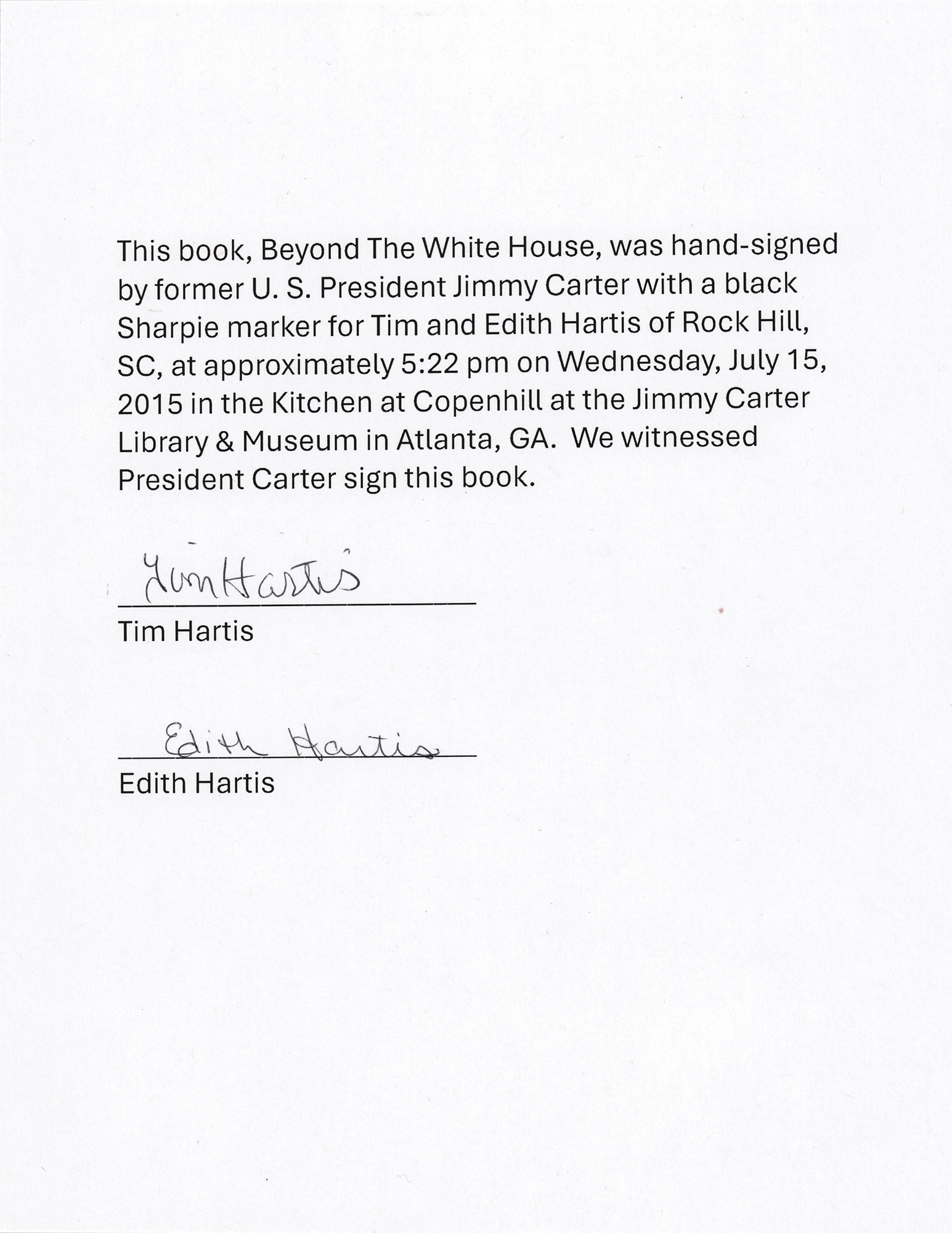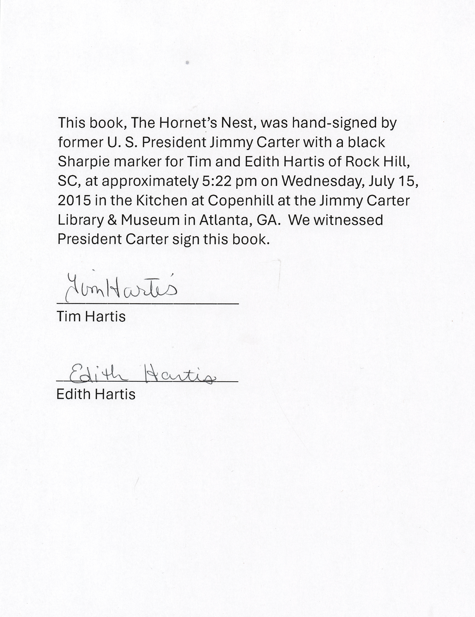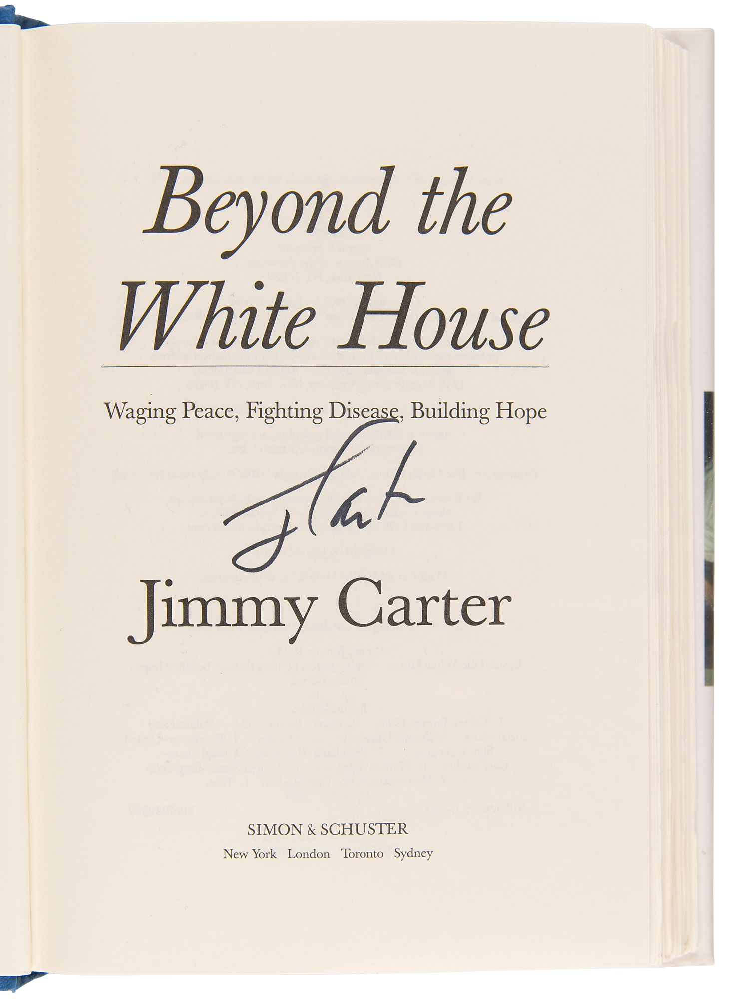 Three books by Jimmy Carter, all signed “J. Carter,” each hardcover with dust jacket, each book signed on the title page in black felt tip. Titles include: The Nobel Peace Prize Lecture (first edition), The Hornet’s Nest, and Beyond the White House (first edition). In overall fine condition, with a crease to the Nobel signed page. Each book was signed on July 15, 2015, at the Jimmy Carter Library and Museum in Atlanta, Georgia, and each is accompanied by a letter of provenance, a photo taken at the signing, an original color brochure from the signing, and a B&W copy of a ticket to the signing.