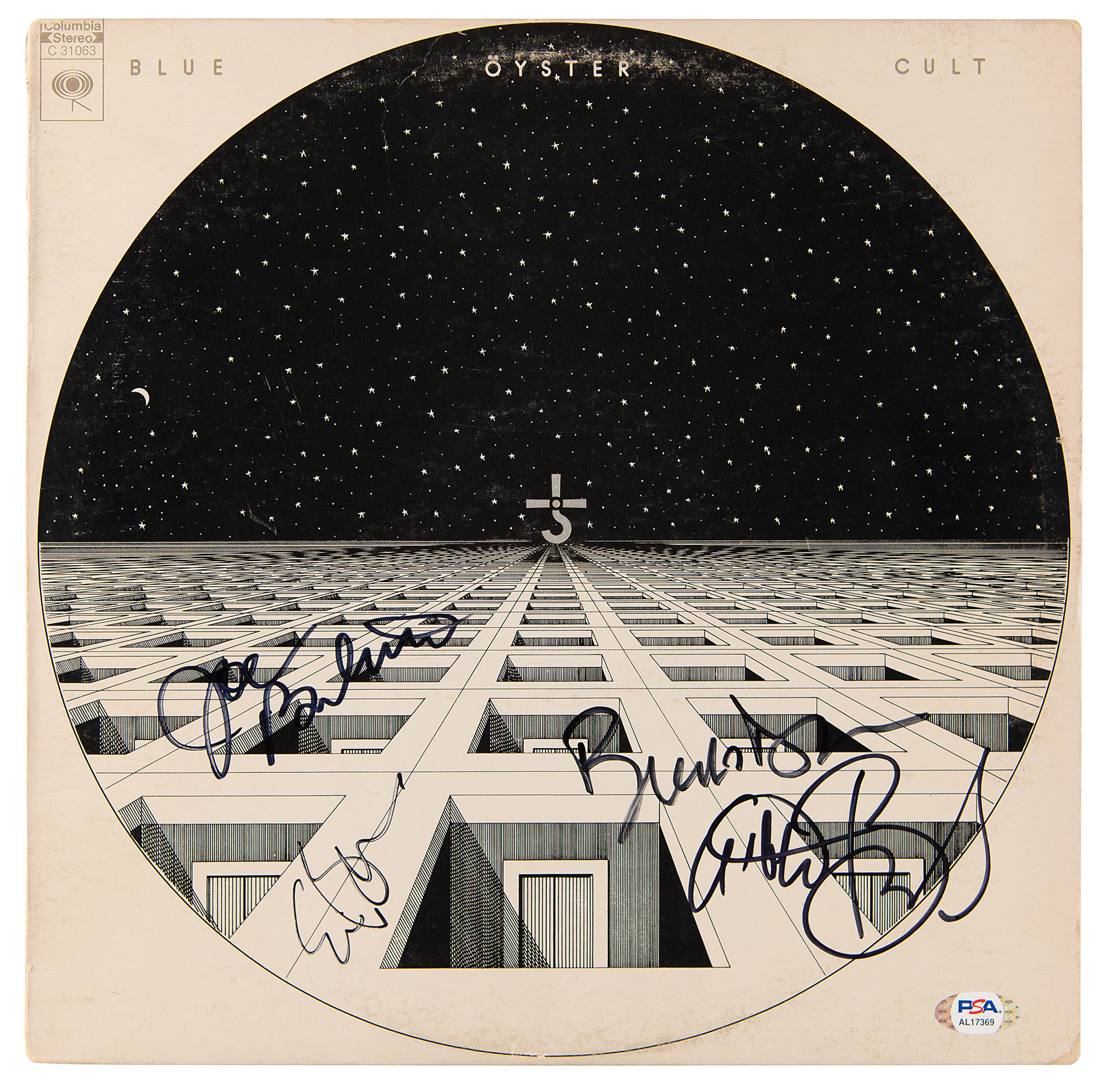 Blue Oyster Cult self-titled debut album signed on the front cover in black felt tip by Buck Dharma, Eric Bloom, Joe Bouchard, and Albert Bouchard. In fine condition, with a PSA/DNA label affixed to the lower corner. The record is included. Accompanied by a certificate of authenticity from PSA/DNA.