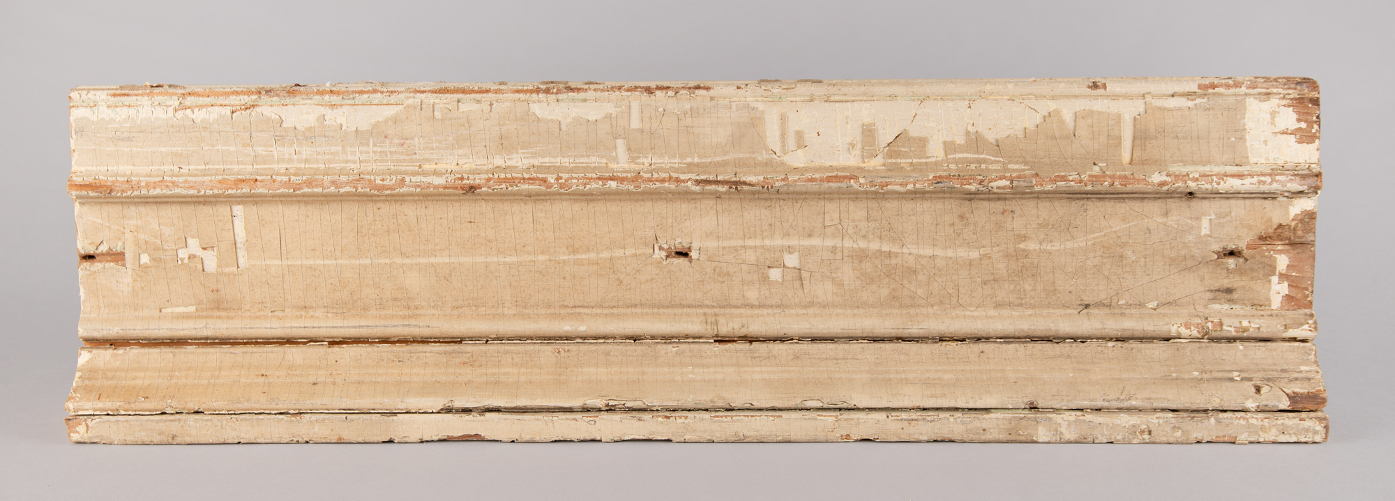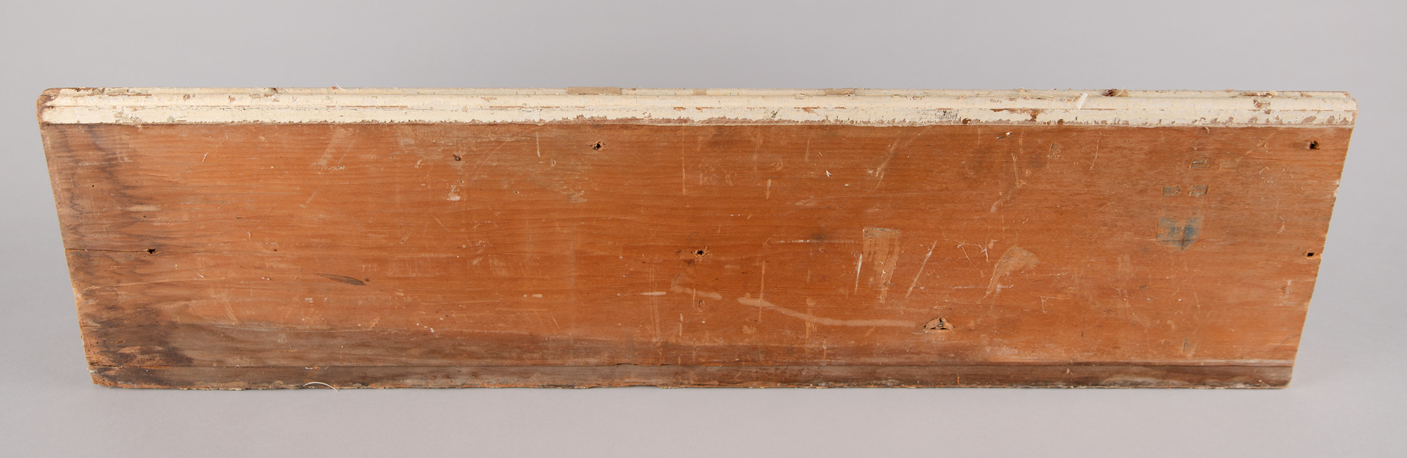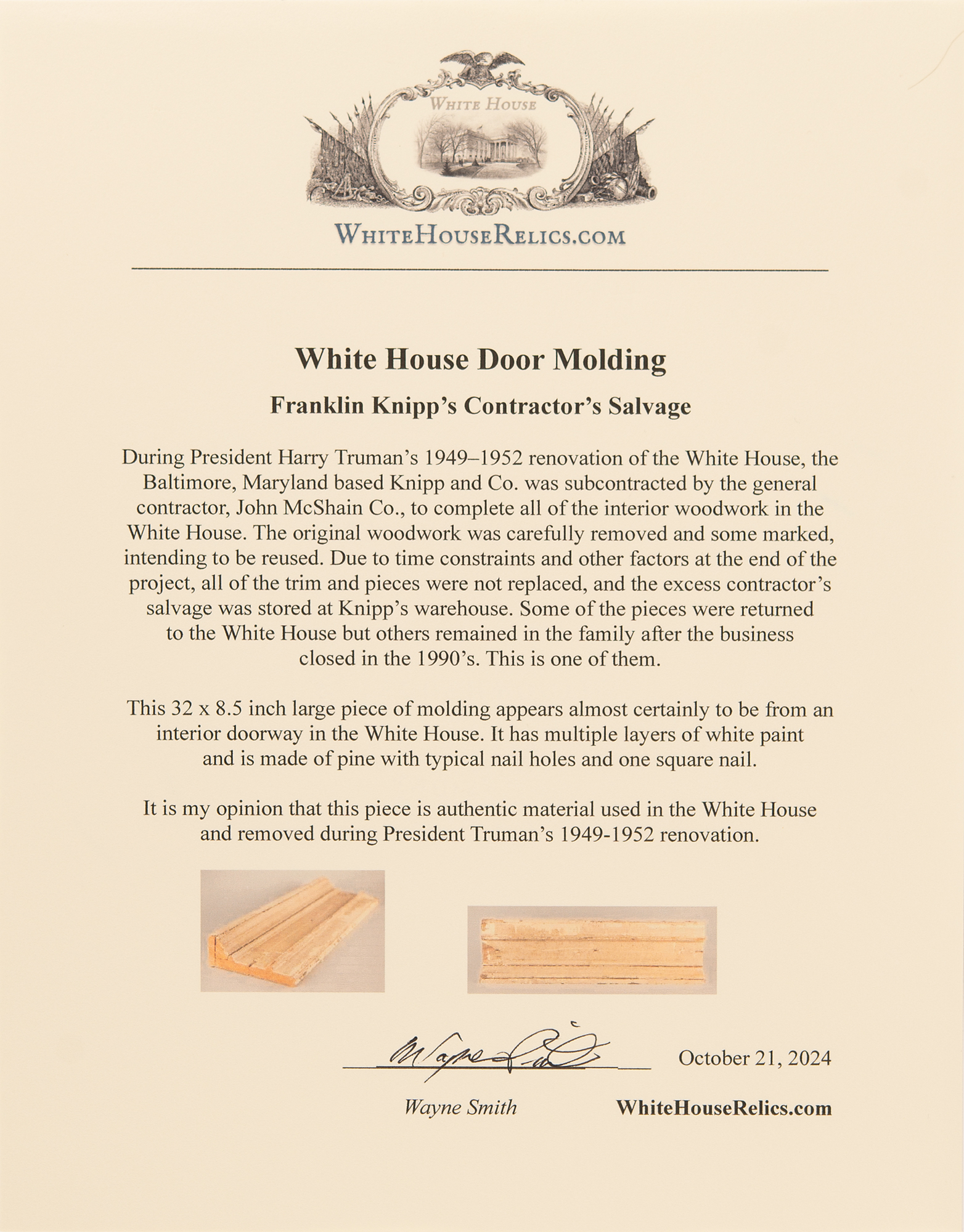 Historic piece of doorway, possibly transom molding from the White House, measuring 32″ x 8.5″ x 3″, featuring two reeded sections with a cornice-type edge. It is pine with an ornate reeded decoration featuring multiple layers of original white paint. The paint has typical age-related cracking with some paint loss on left side. Original nail holes can be seen on the back with one early square nail visible. In good to very good condition, with the piece loosely assembled and the upper cornice segment detached. Door casings in this style can be seen in numerous images of the White House interior taken during the first half of the 20th century, situated around doorways in the Green Room, Red Room, Blue Room, and elsewhere. Originates from the Knipp & Co. 'contractor's salvage' resulting from their work in the renovation of the White House during the Truman administration. Accompanied by a letter of authenticity from historian and collector Wayne Smith, author of White House Renovation Souvenirs. Also includes a signed hardcover copy of the book.